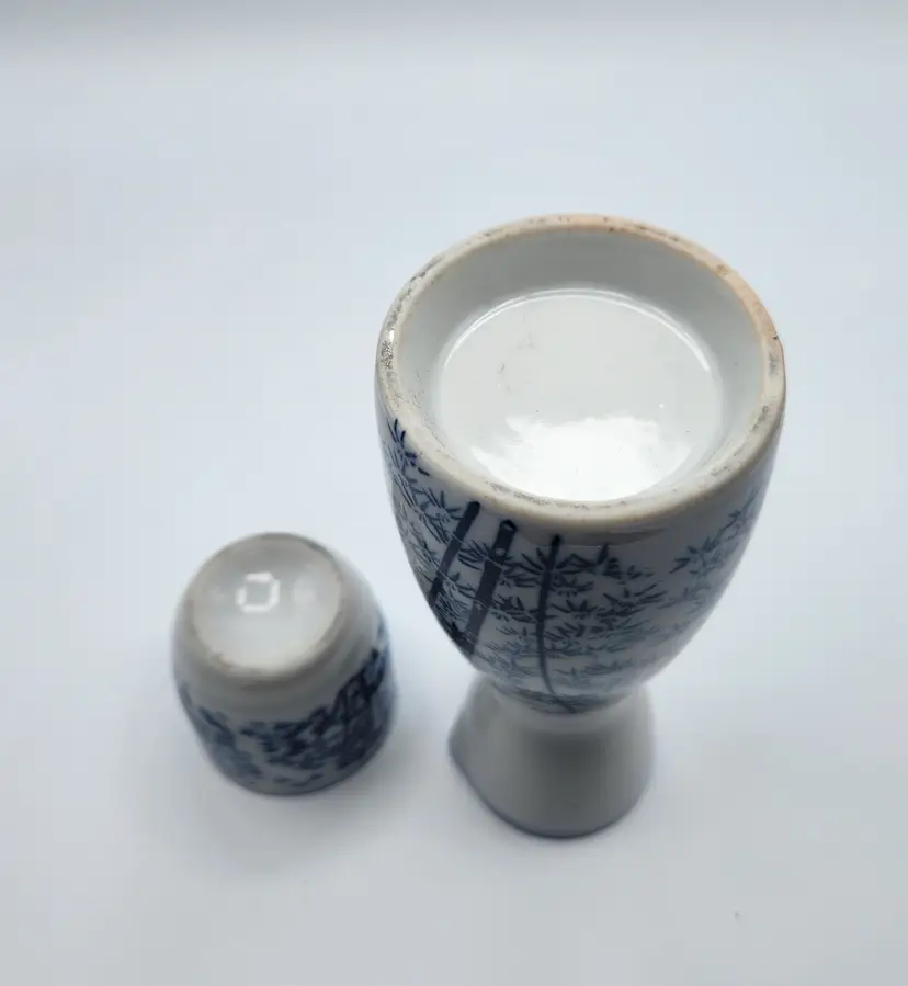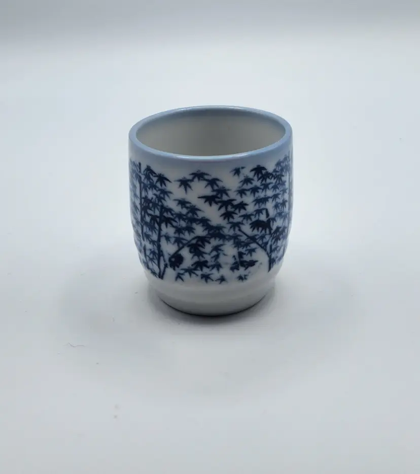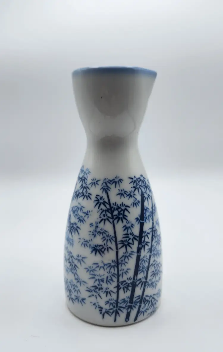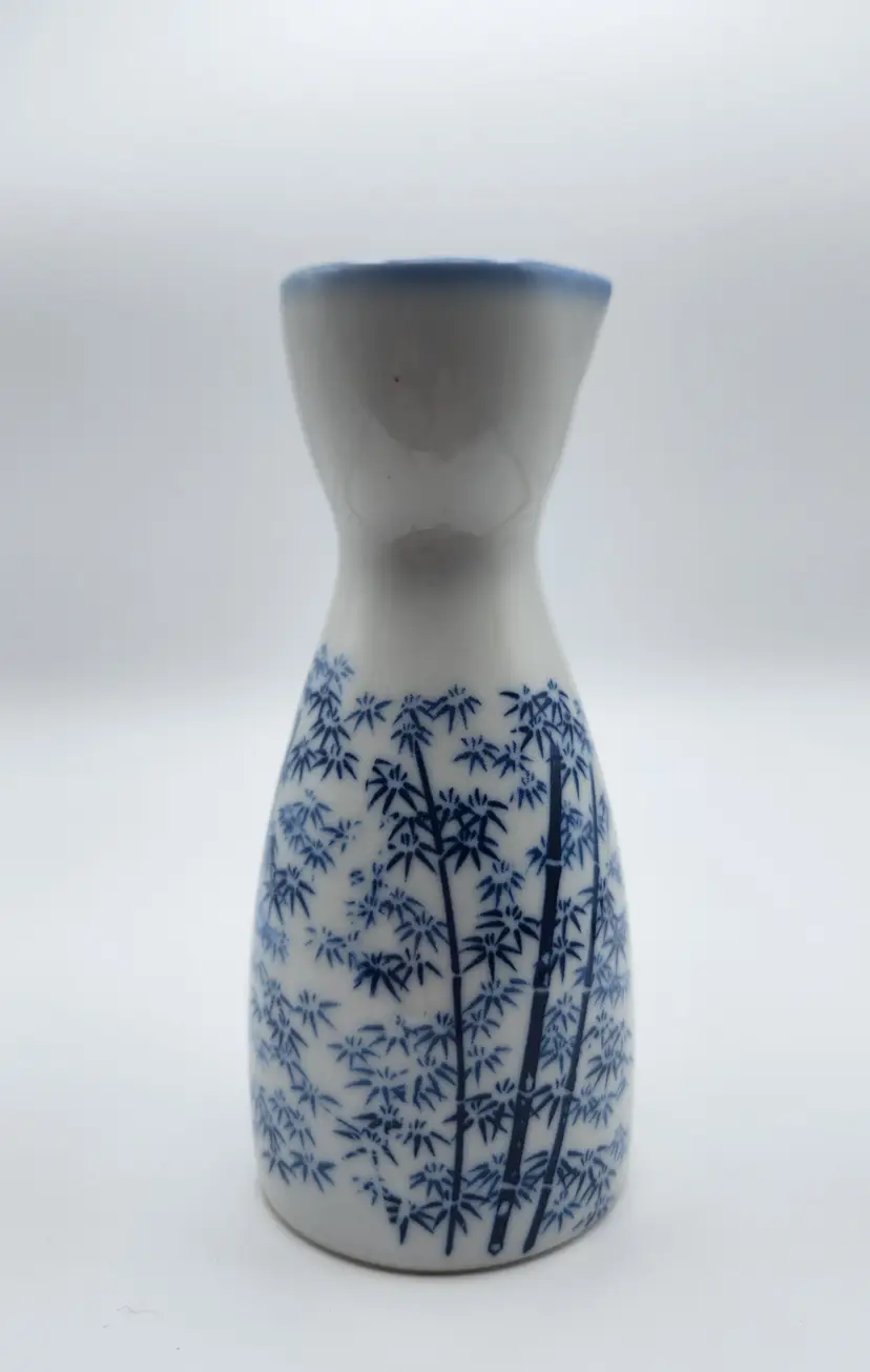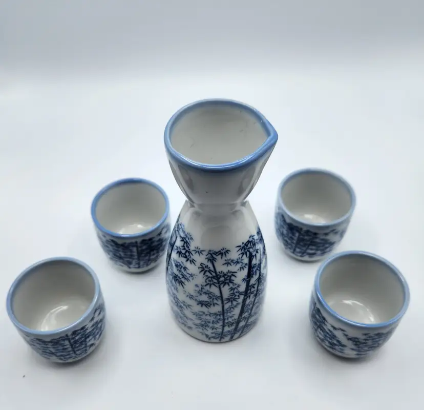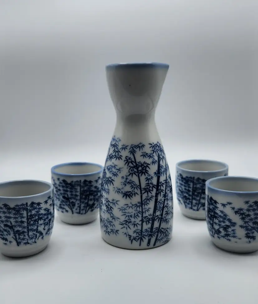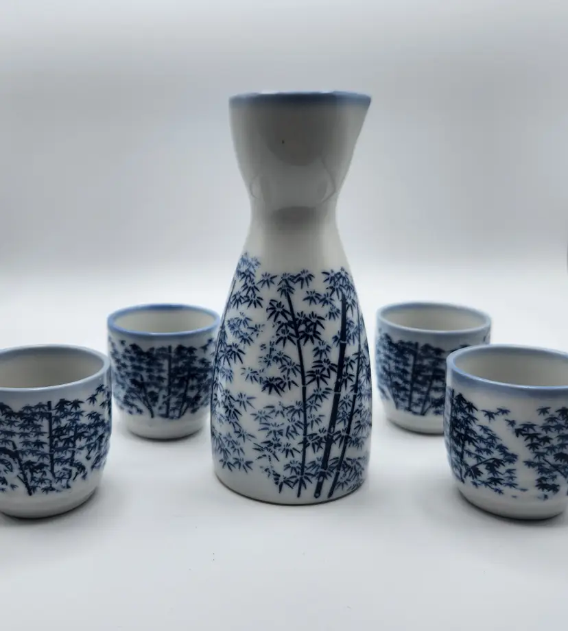 Japanese sake set - includes sake carafe (tokkuri) and four small cups (ochoko) with a blue and white bamboo design.