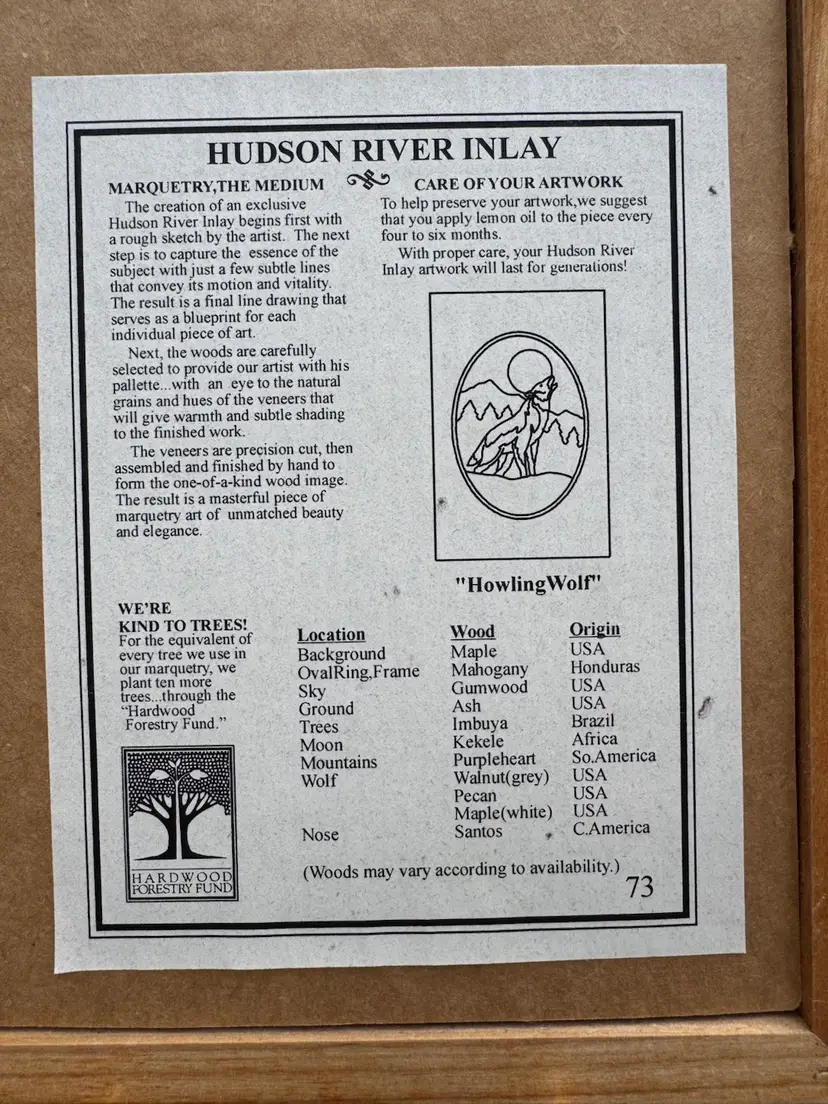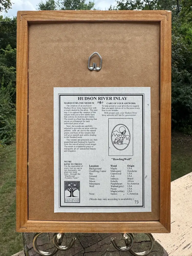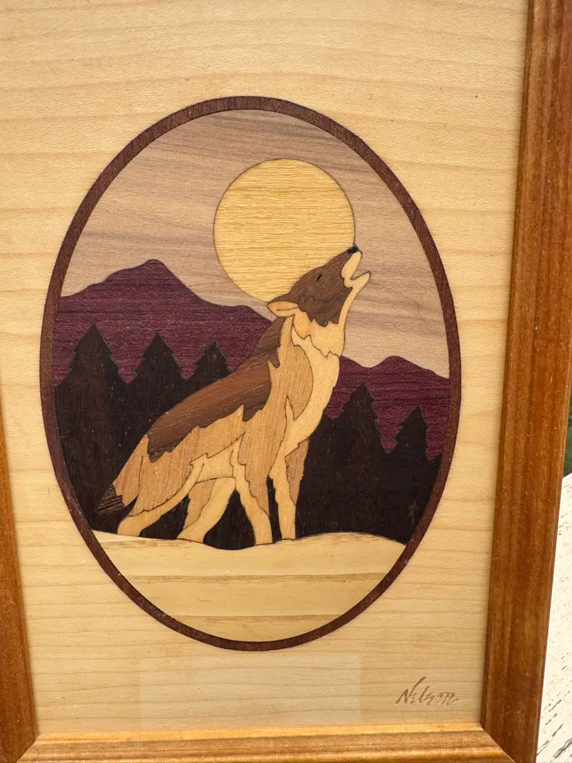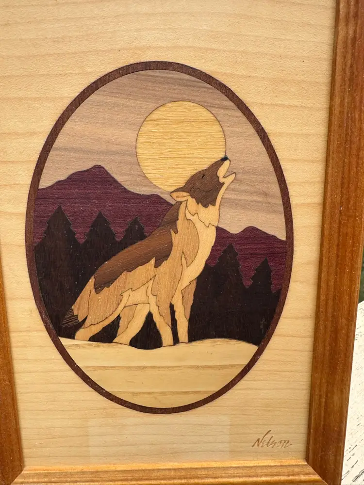 Artist Jeff Nelson Marquetry Hudson River Inlay Wolf. Exceptional art piece, hand finished using different types of wood. Measures 9"x6.5"