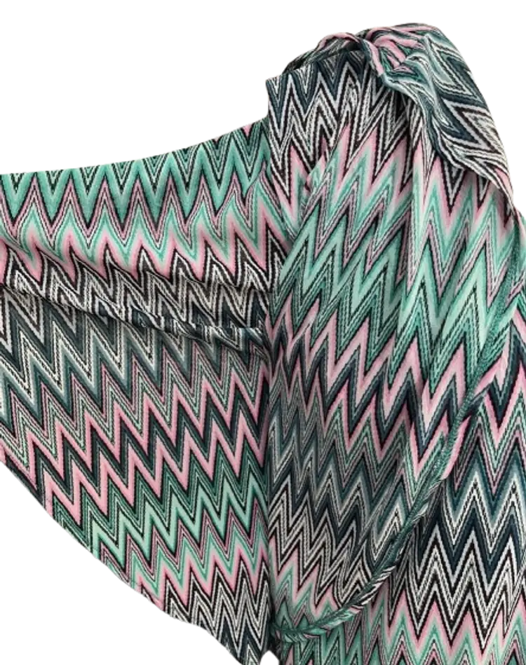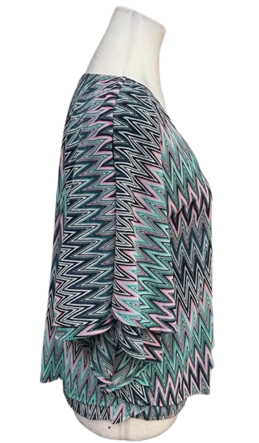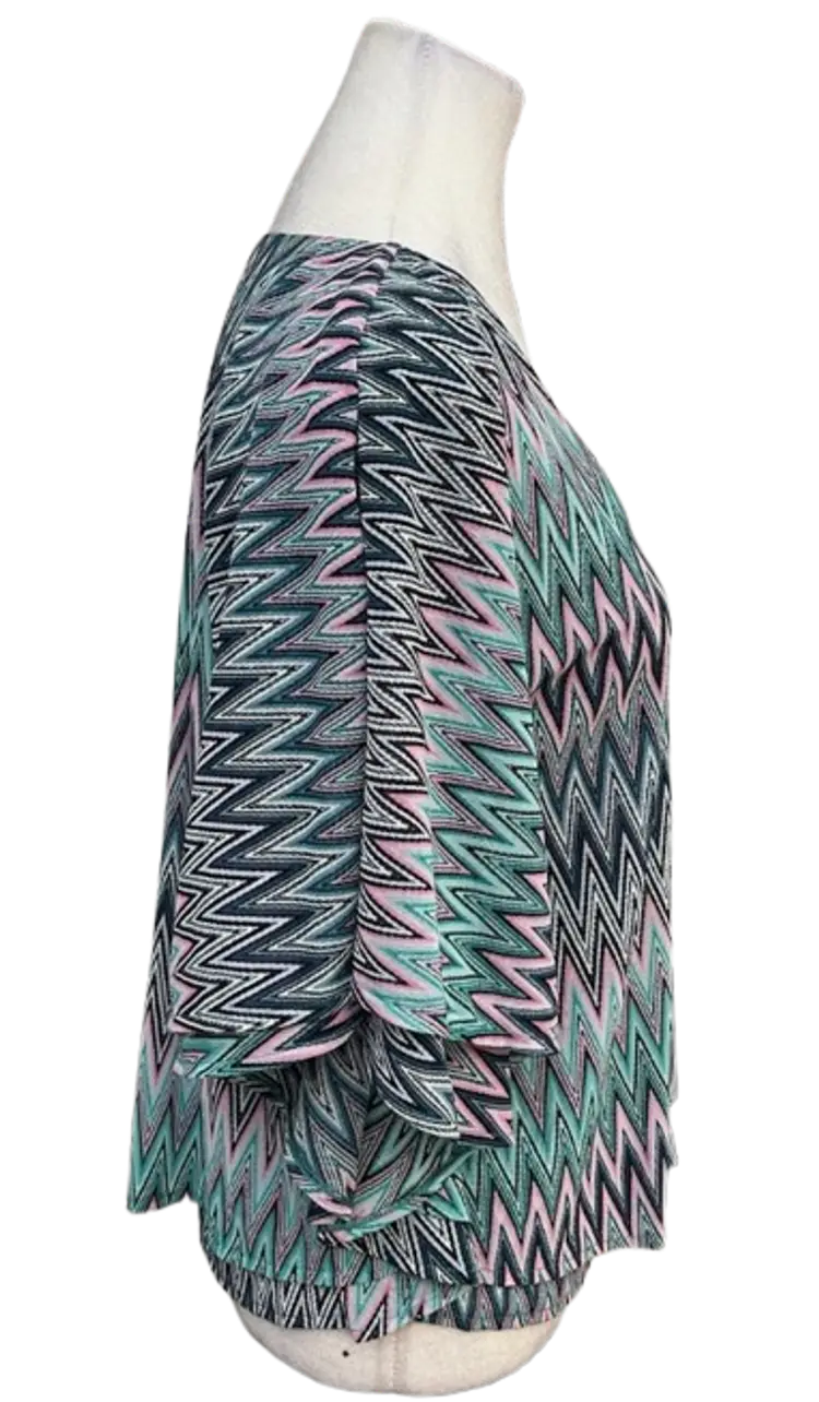 Elevate your wardrobe with this stunning Jennifer Lopez batwing blouse. Featuring a unique geometric pattern in shades of green, light pink, black, and a hint of gray, this top is perfect for adding a pop of color to any outfit.
