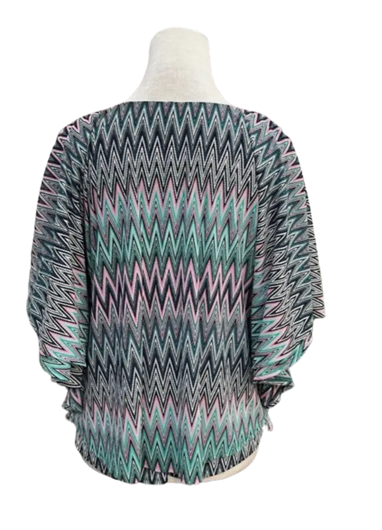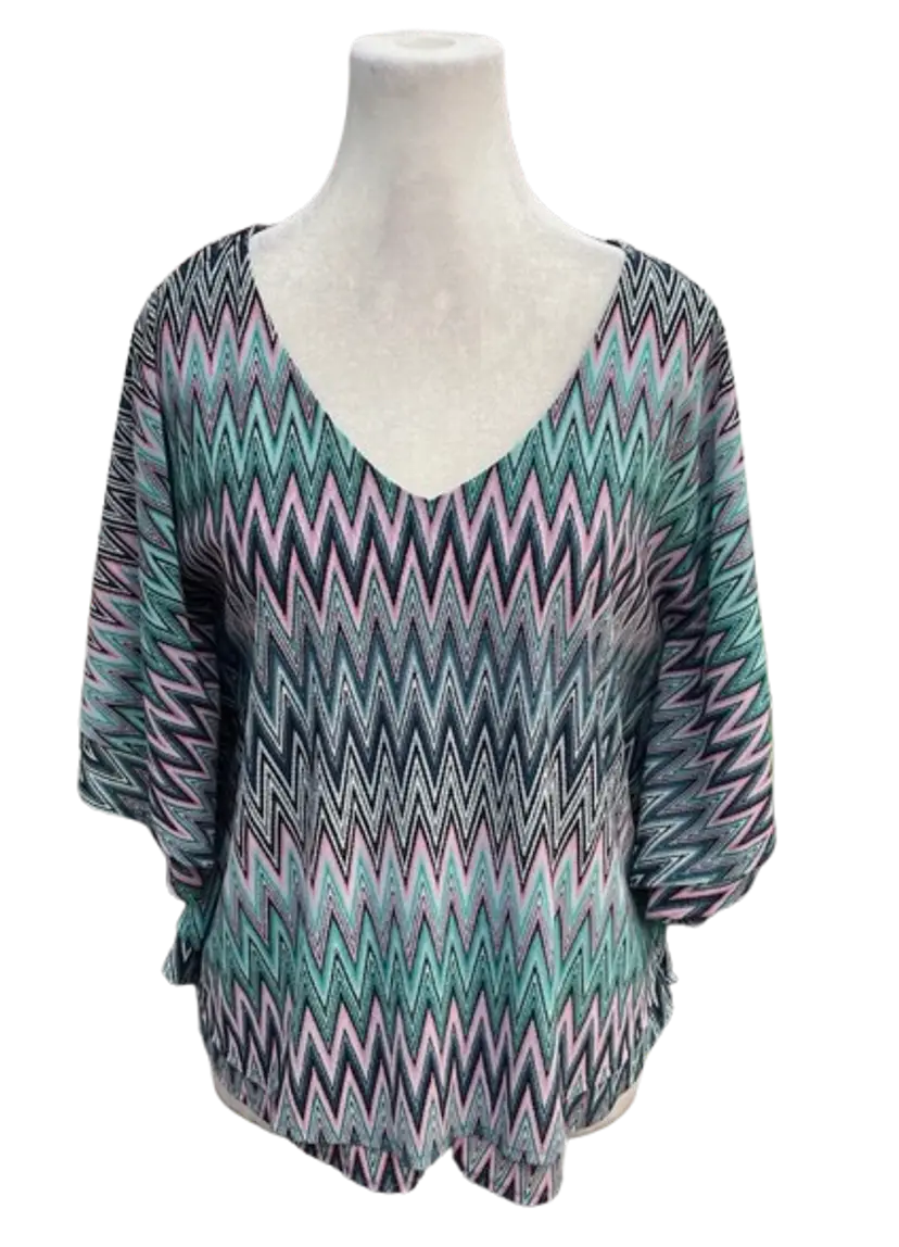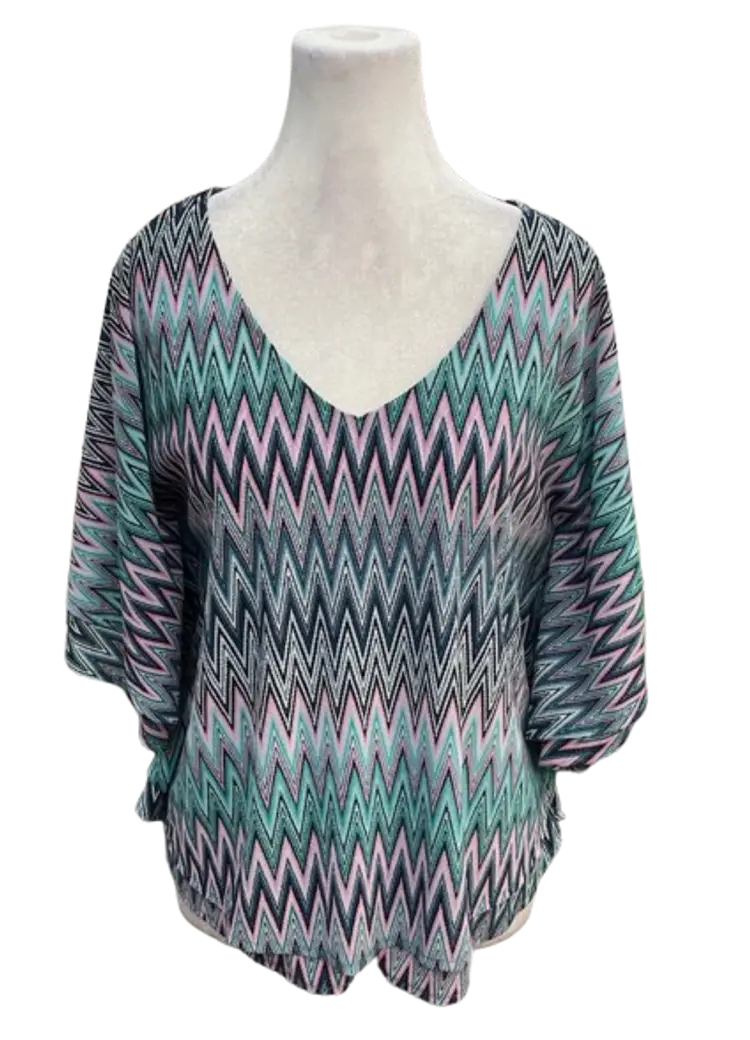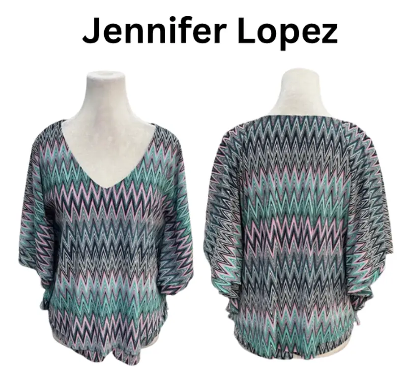 Jennifer Lopez Batwing Blouse – Size M – Excellent Condition Colorful geometric design in green, pink, black & gray. Lightweight, 3/4 sleeves, V-neck, pullover. Perfect for casual, office, or evening wear.