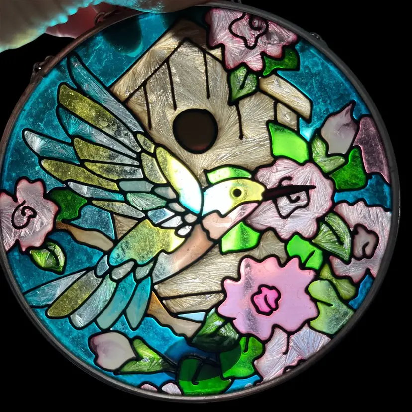 Brighten your window with this beautiful hand-painted glass hummingbird sun catcher by Joan Baker.