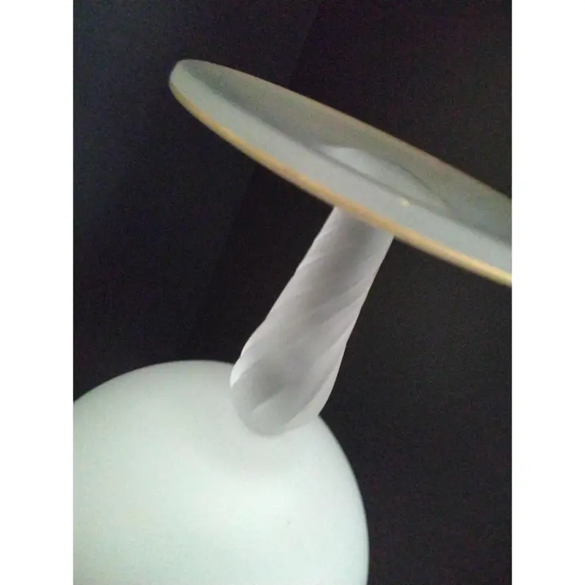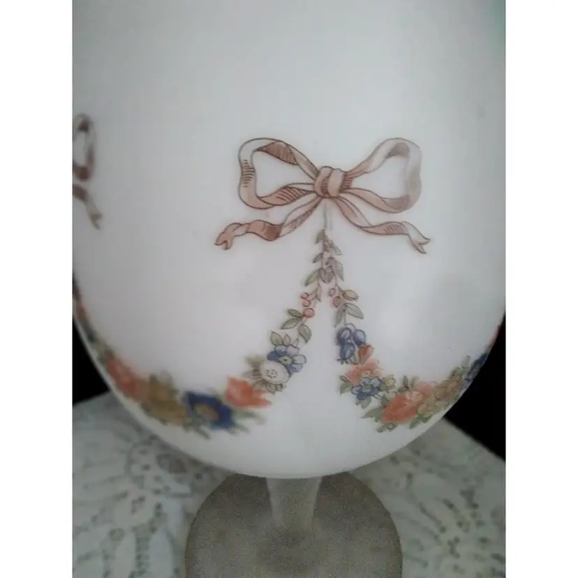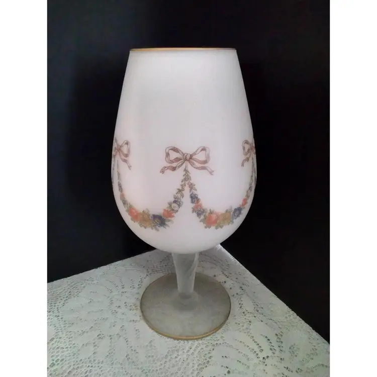 Frosted White and Clear Goblet. 10.9 inches tall, 4 inches wide base and mouth opening is 3.3 inches. It has is decorated with swags of flowers pink ribbons. Goblet is in very good condition it has a bubble in the base.