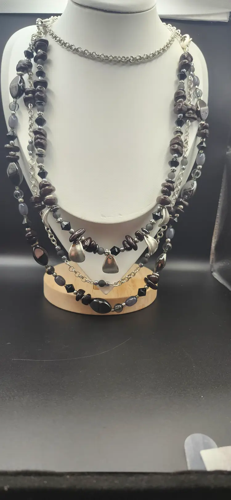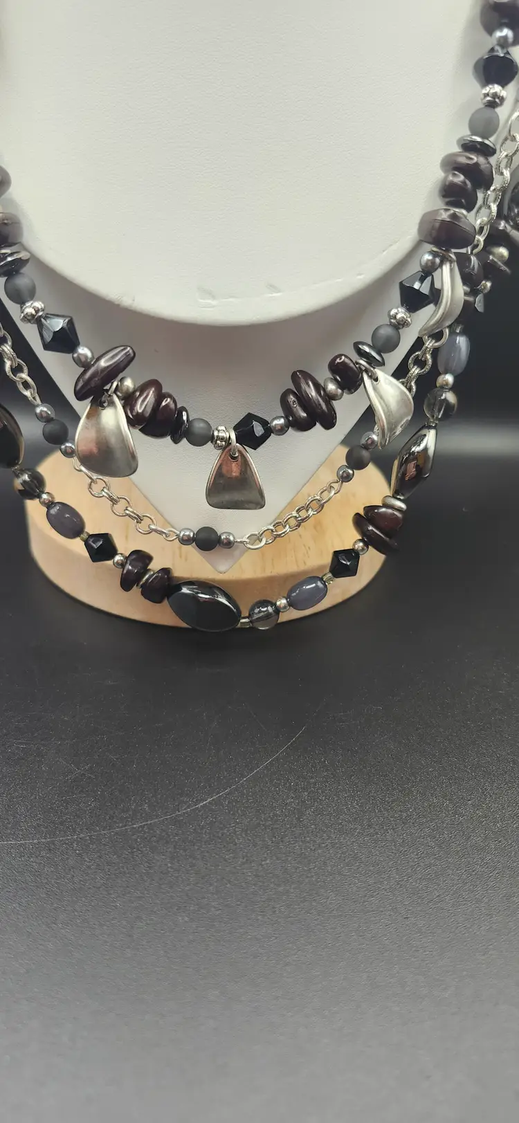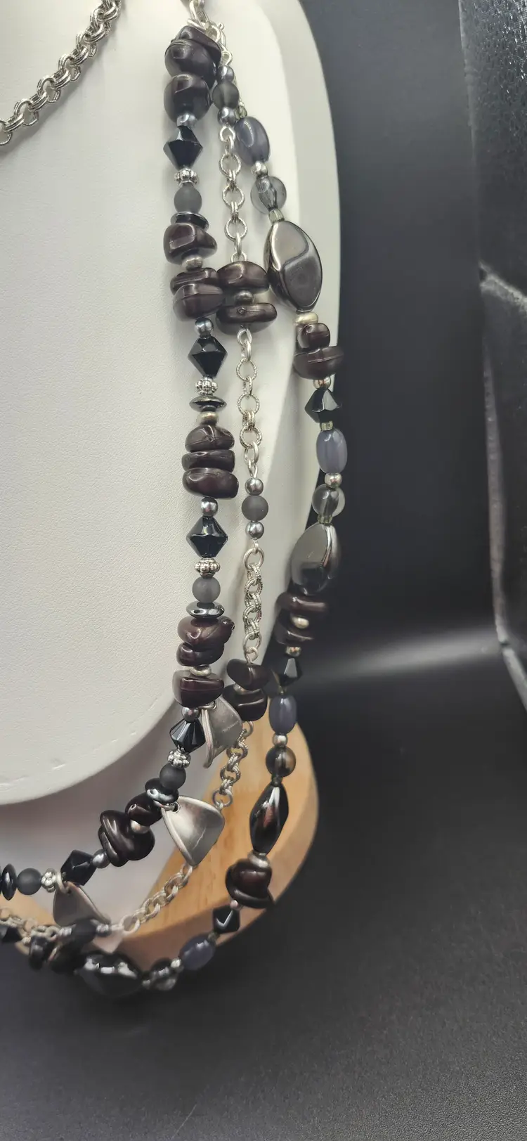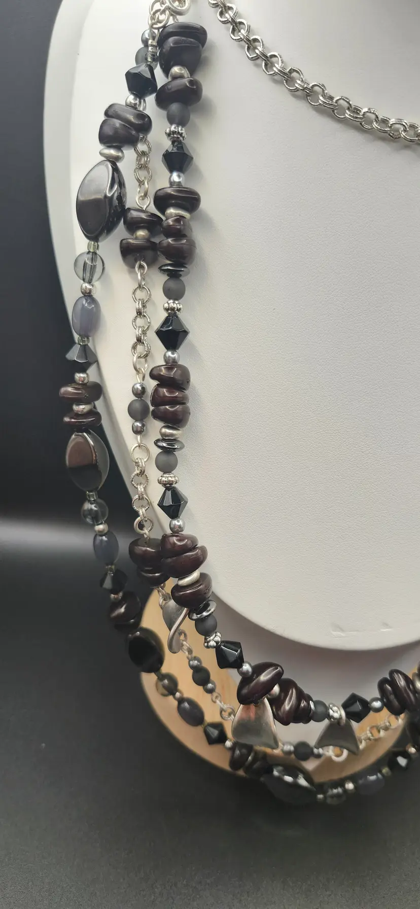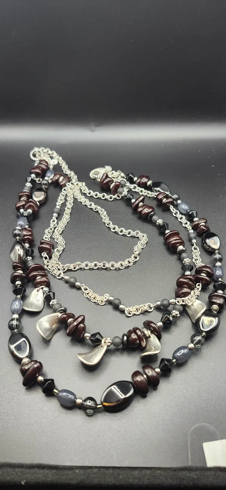 Add a touch of boho charm with this layered necklace featuring a mix of silver-tone chains and rich wooden beads. The combination of textures and tones makes it a versatile piece for any outfit, whether you're dressing up or keeping it casual. Perfect for layering or wearing solo for a statement look.