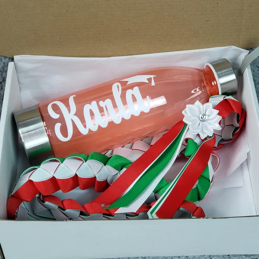 Graduation 4-Ribbon Lei and Personalize Water Bottle Gift Box Set. Grad label, box, tissue paper, and ribbon tie in a bow. Message me with Name. Photo will be shared for your approval.