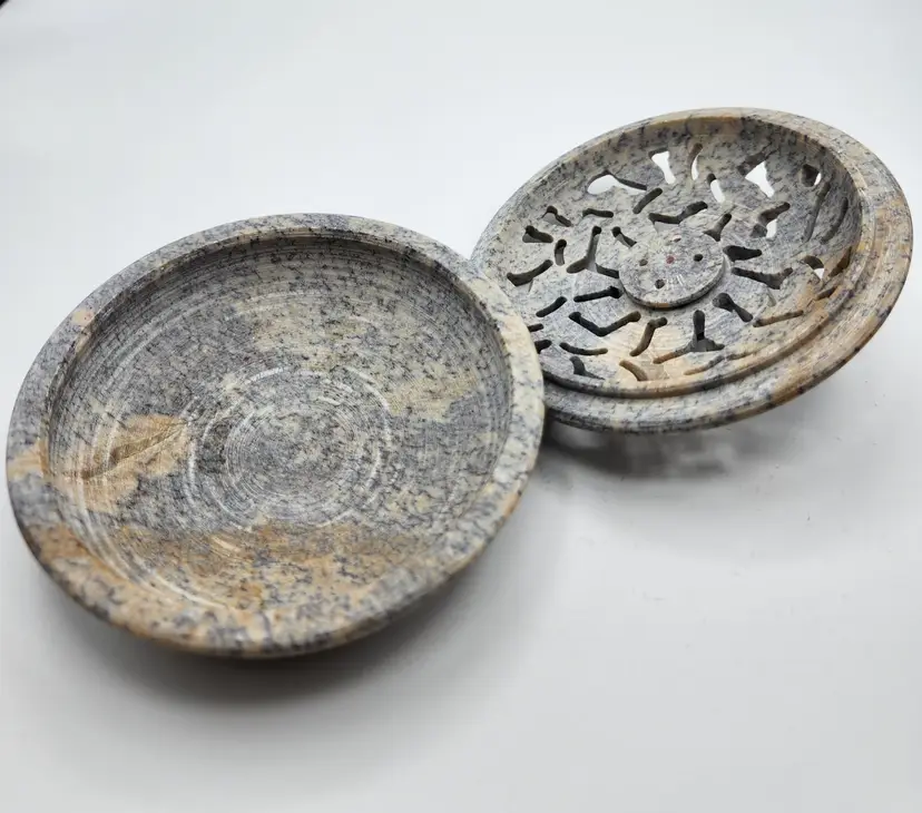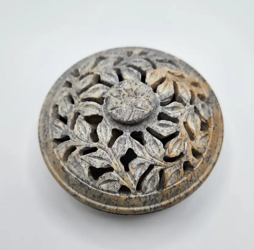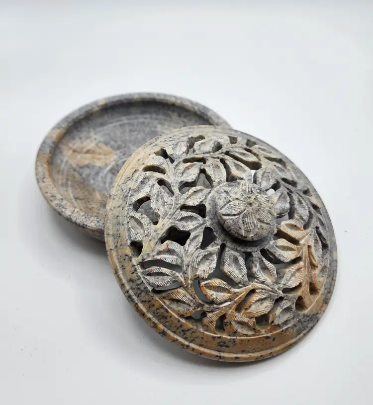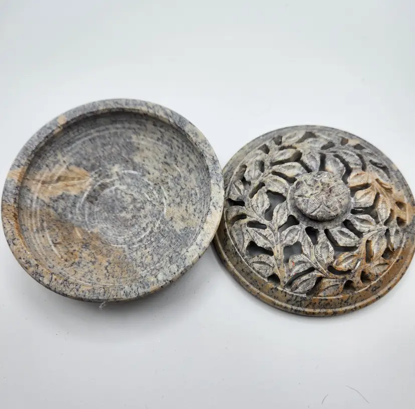 The image shows a hand-carved soapstone or stone incense burner or trinket box. It features a round shape and a lid with intricate floral 'jali' or openwork carvings, which allow smoke or aroma to escape when used as an incense holder. This piece appears to be contemporary. 4" diameter.