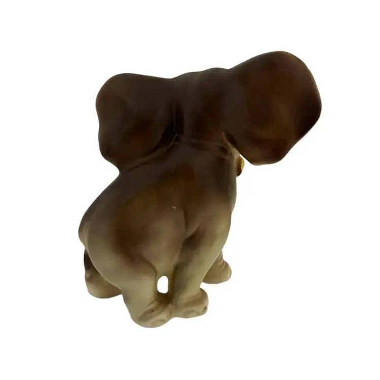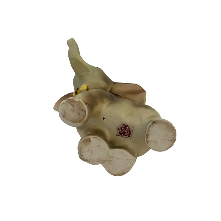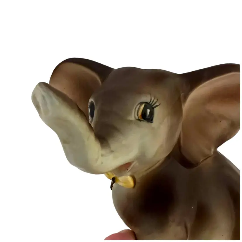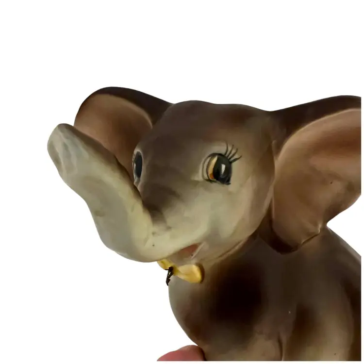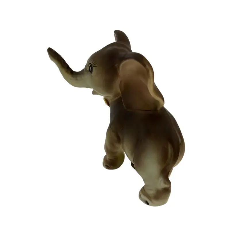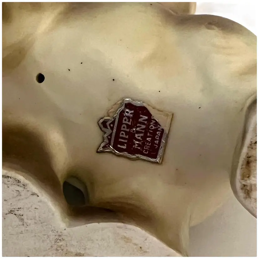 Here we have ceramic, anthropomorphic, elephant figurine from Lipper & Mann Japan. This adorable mother elephant used to have a baby on a chain or leash. Her baby has disappeared over the years. She has her trunk up bringing good luck. She has her original, foil label on her stomach.