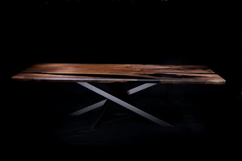 Elevate your dining space with this stunning live edge walnut table. Featuring a sleek steel X-base, it's perfect for modern and rustic settings alike.