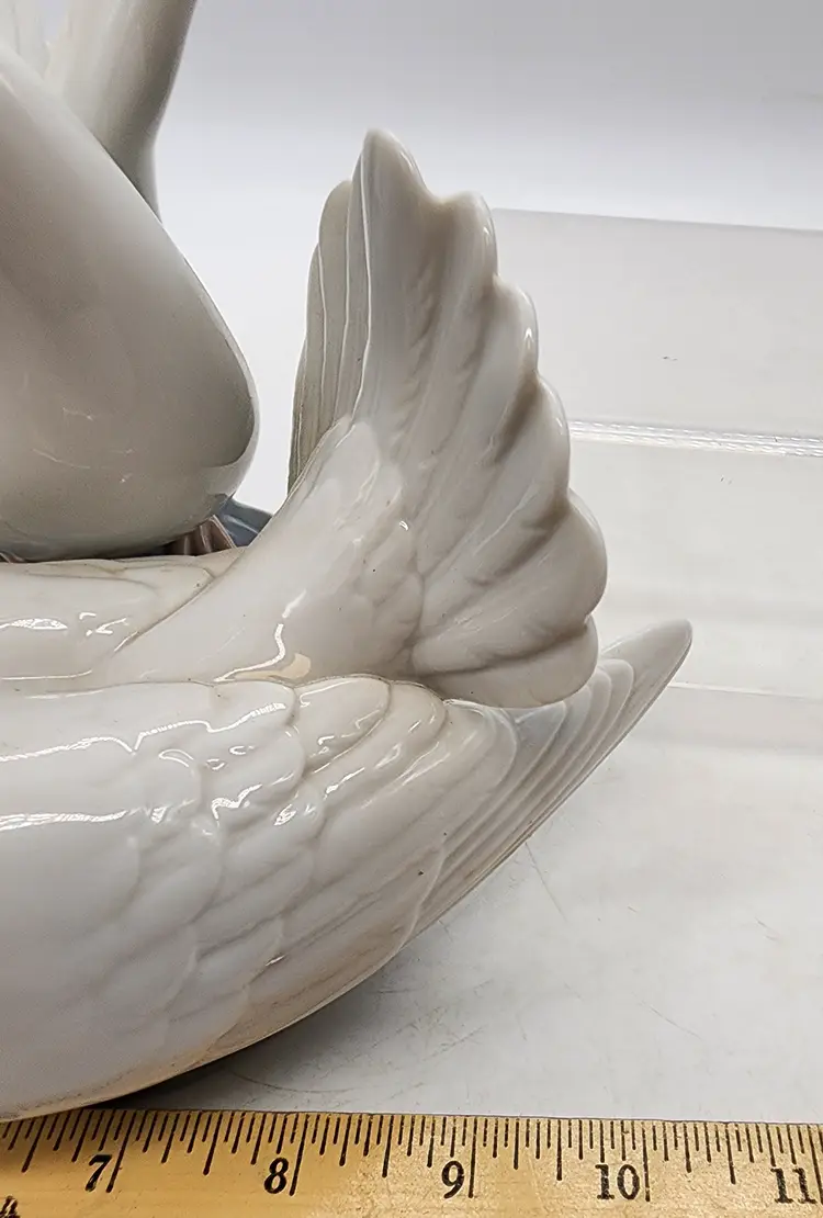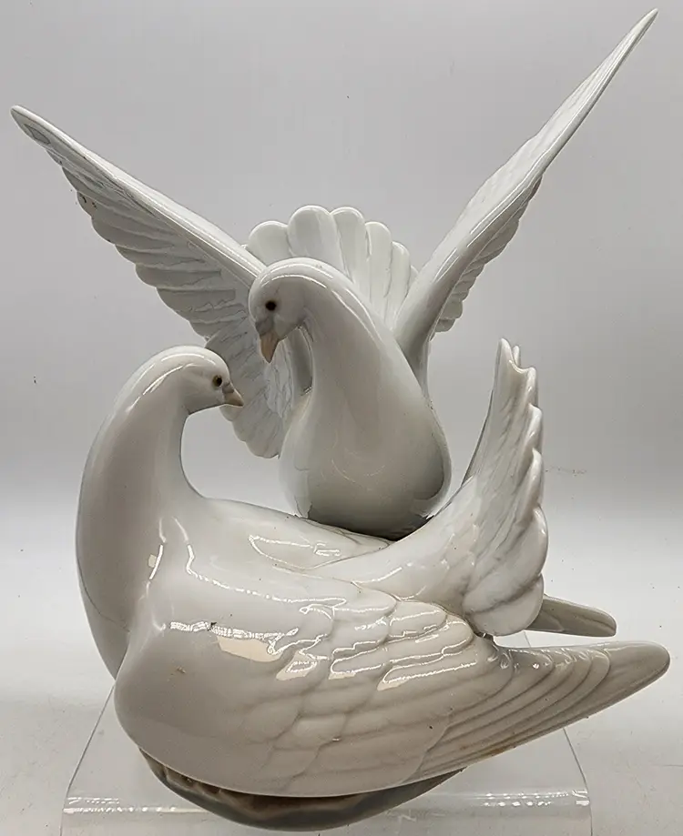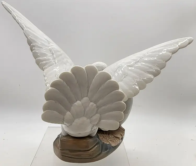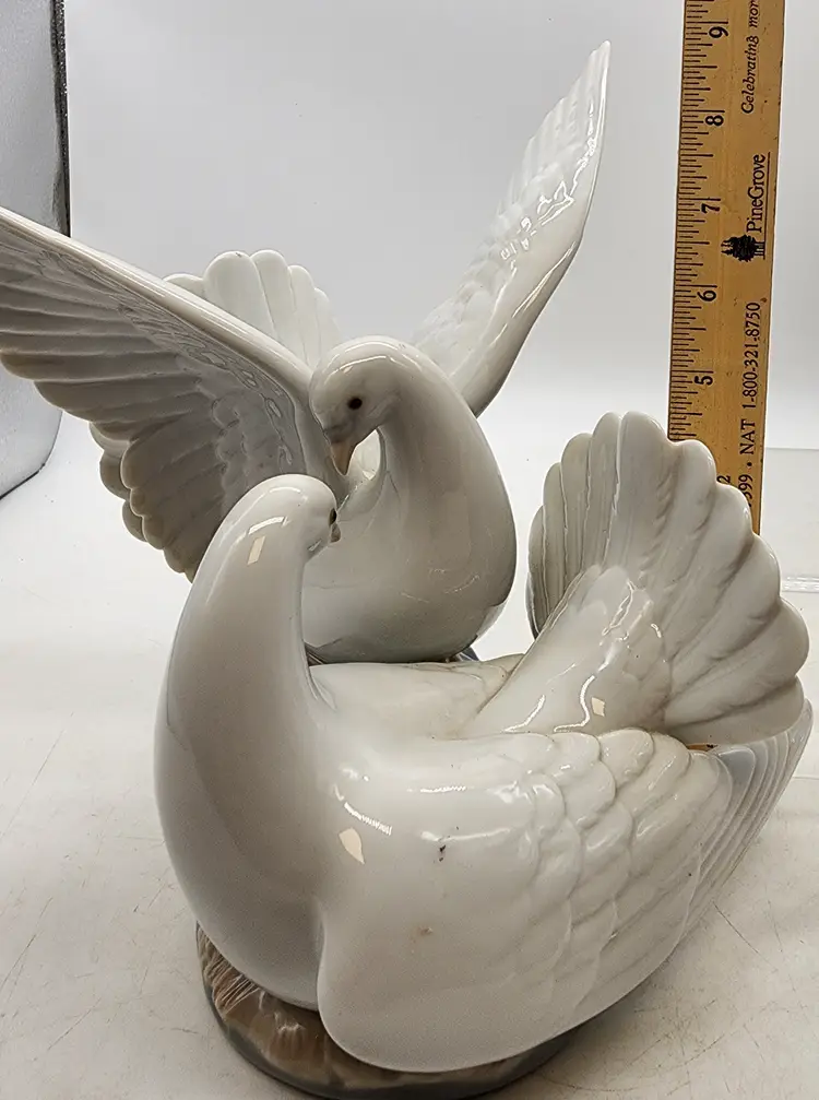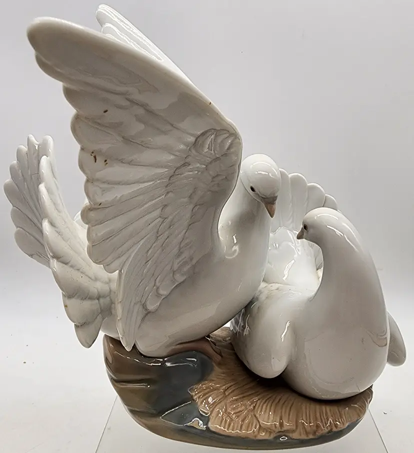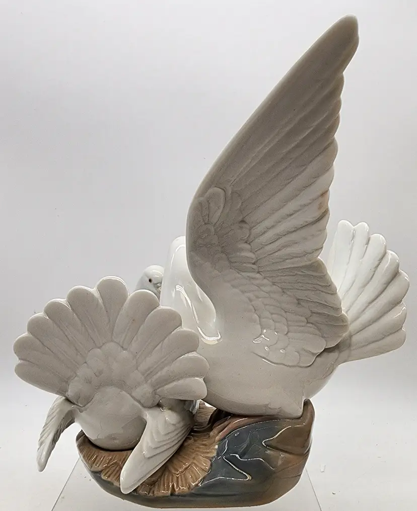 The Lladró Porcelain 6291 Love Nest Figurine with 2 Dove Birds is a beautifully crafted decorative collectible piece made of high-quality porcelain in Spain. This figurine features a charming design of two doves perched on a love nest, perfect for all occasions. With its multicolor detailing and animal theme, this collectible is ideal for those who appreciate fine craftsmanship and unique sculptures. The Lladró brand ensures quality and prestige, making this figurine a lovely addition to any collection of figurines and decorative pieces.