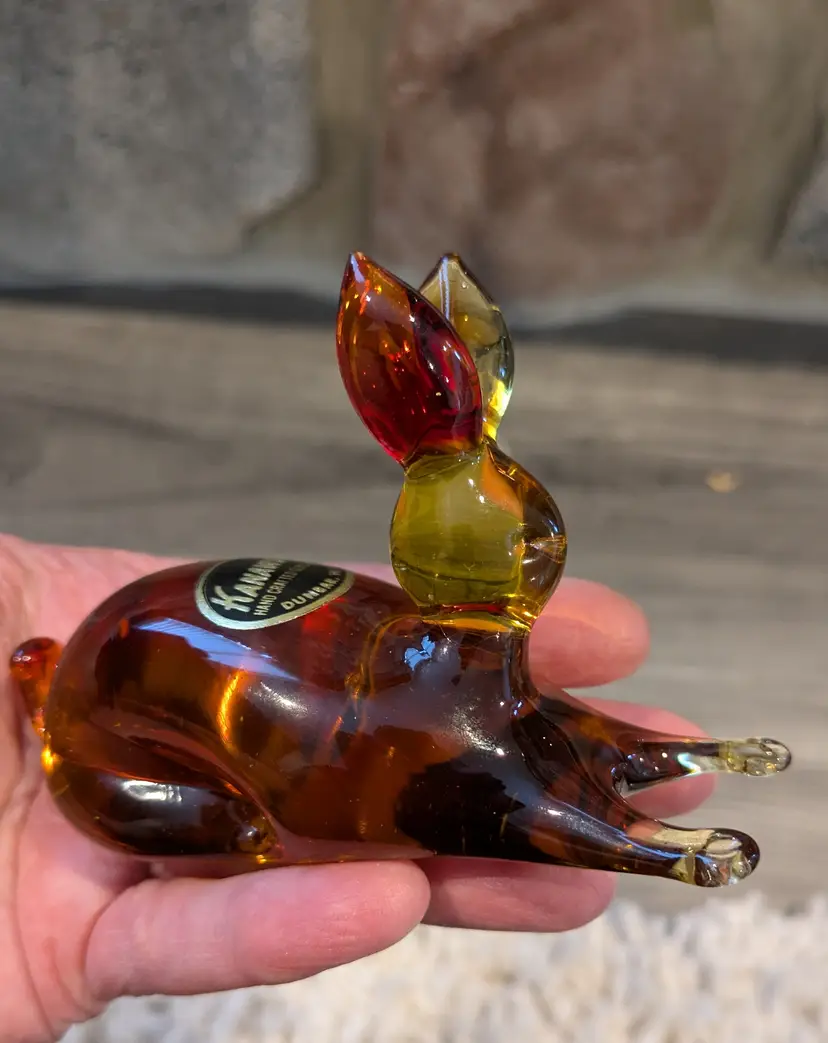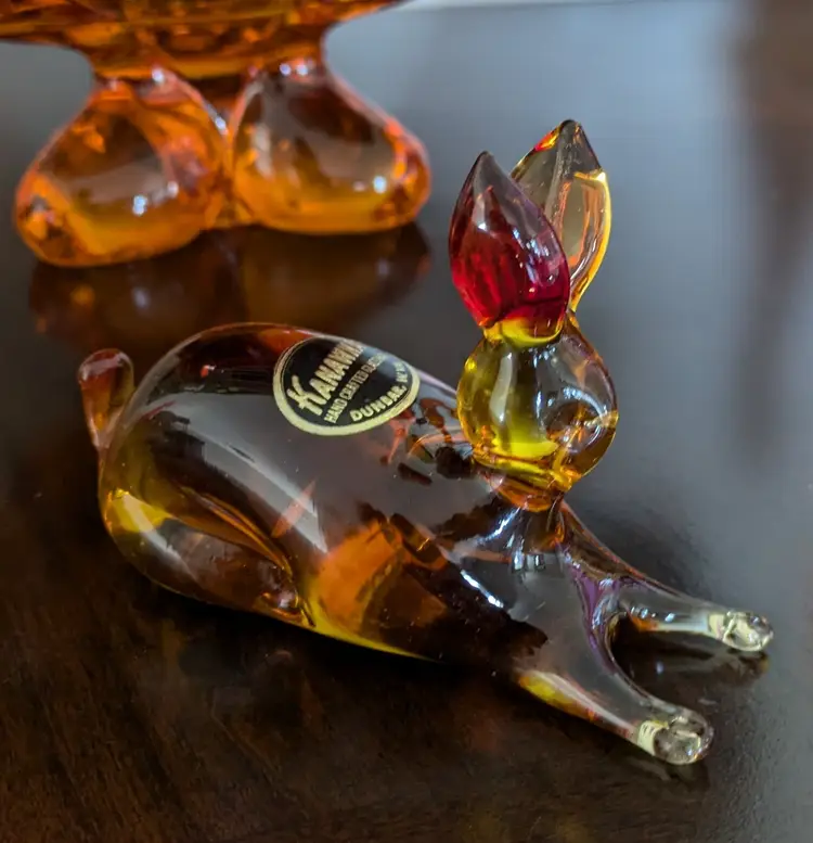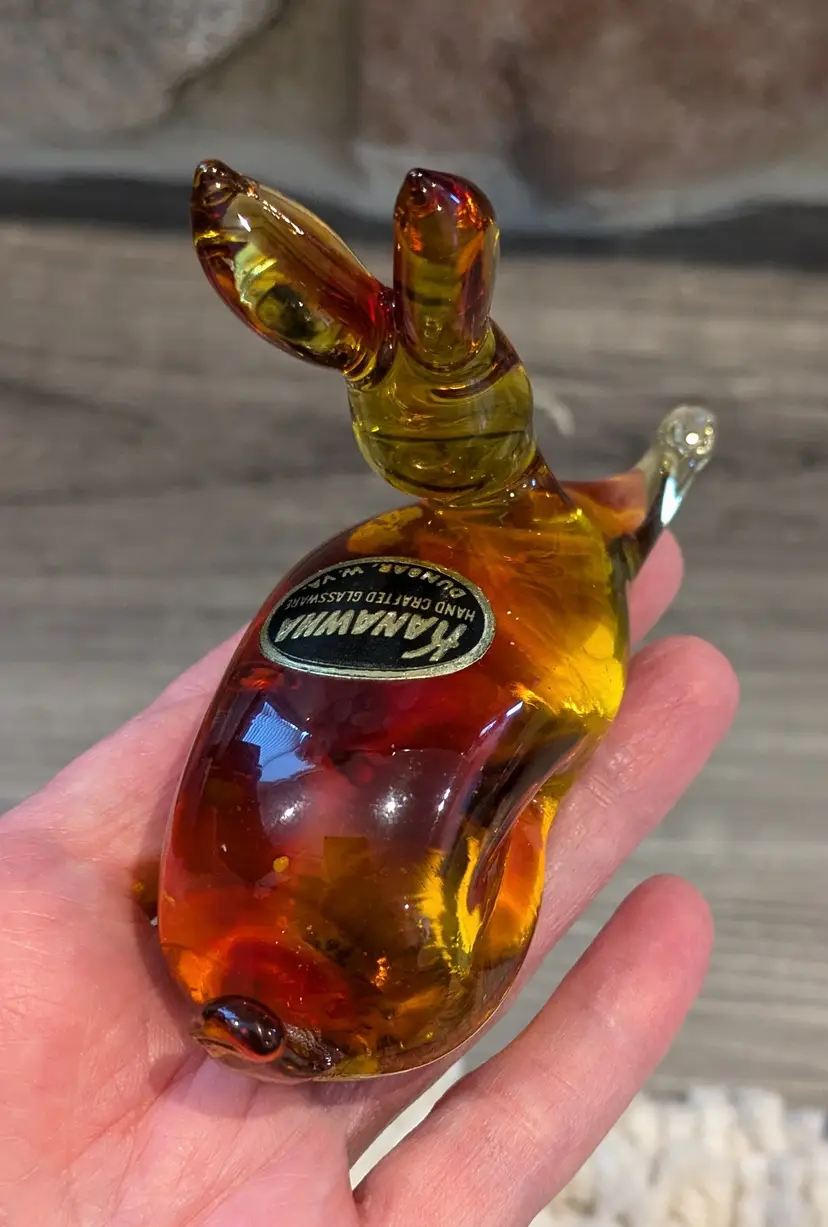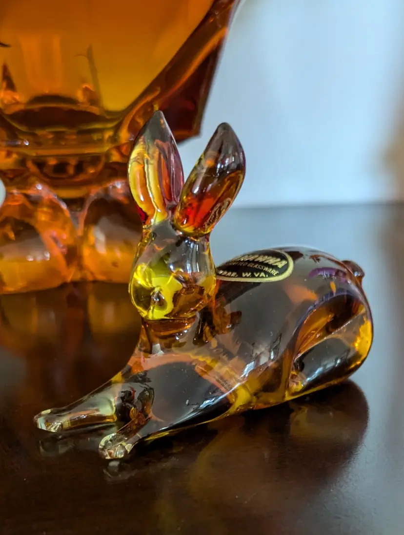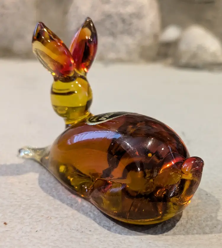 Exceptional Kanawha art glass bunny with original sticker, featuring lovely form with dimple eyes, rich orange amberina colorway with cadmium UV glow, flawless condition, measures approximately 2.1/2" tall x 4" long