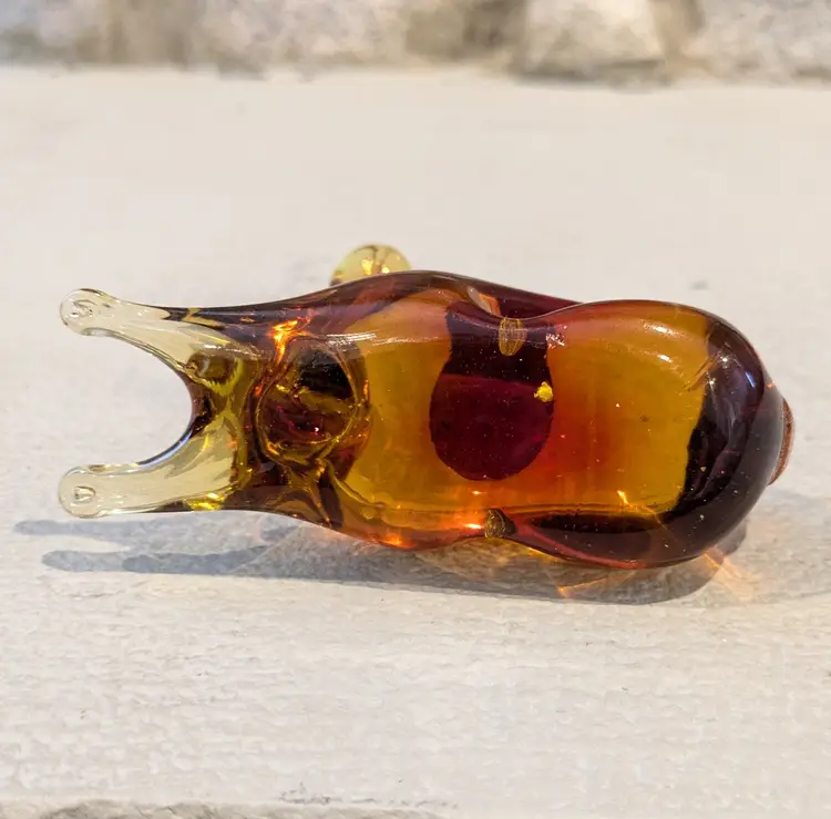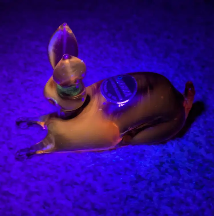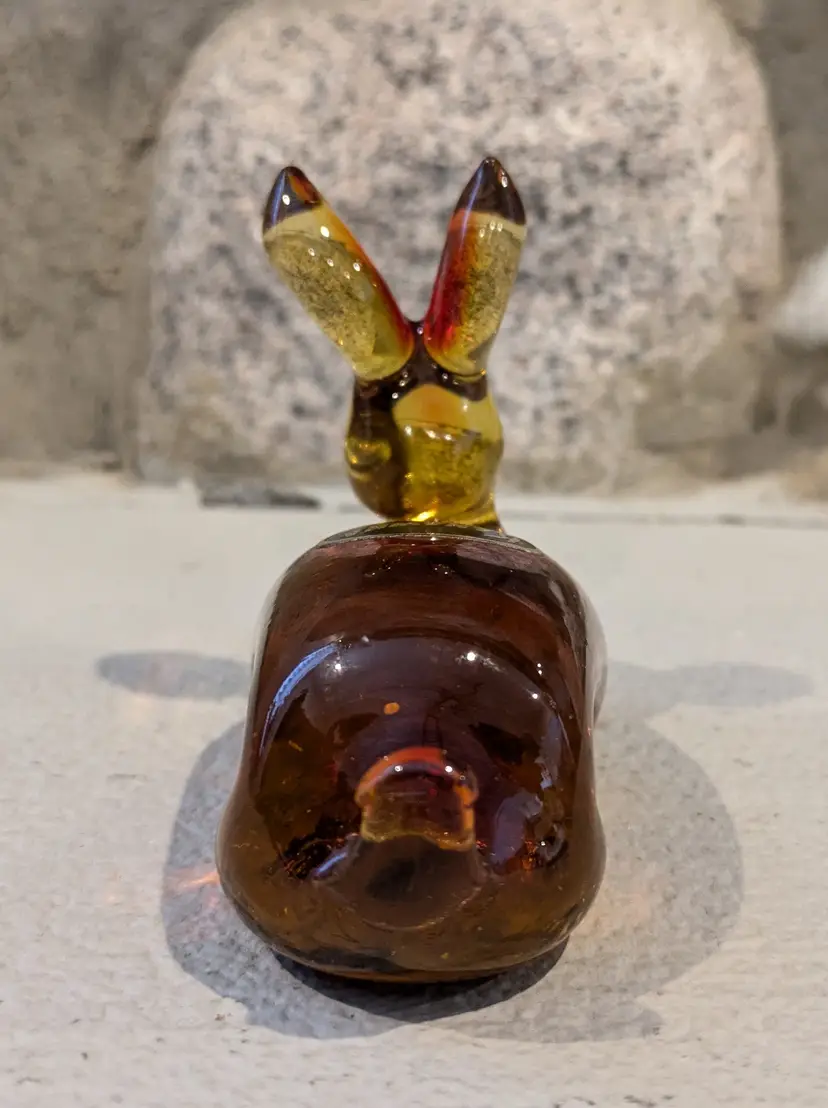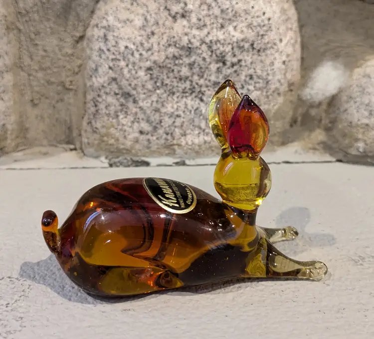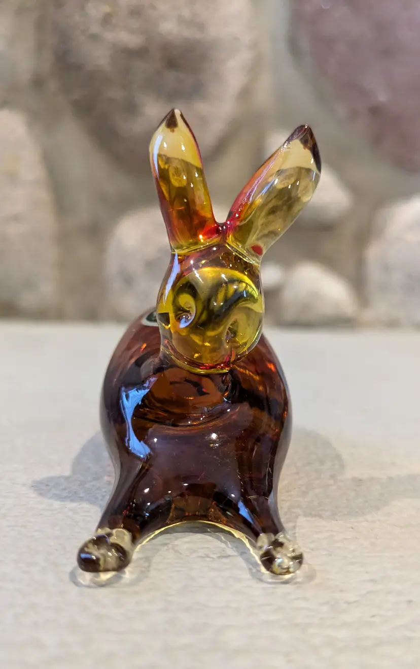 Exceptional Kanawha art glass bunny with original sticker, featuring lovely form with dimple eyes, rich orange amberina colorway with cadmium UV glow, flawless condition, measures approximately 2.1/2" tall x 4" long