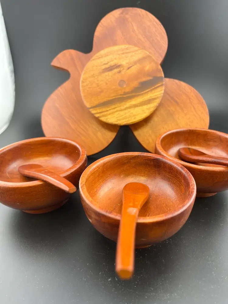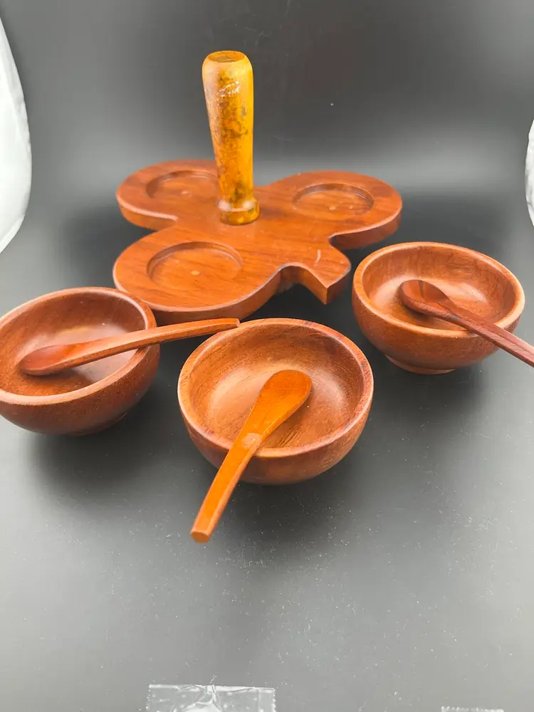 Fantastic condition. Bowls: Approx 3" diam, 1.75" tall, spoons: 4.5" length, Lazy Susan 7.75" at widest point. 1Lb 4 oz-approx
