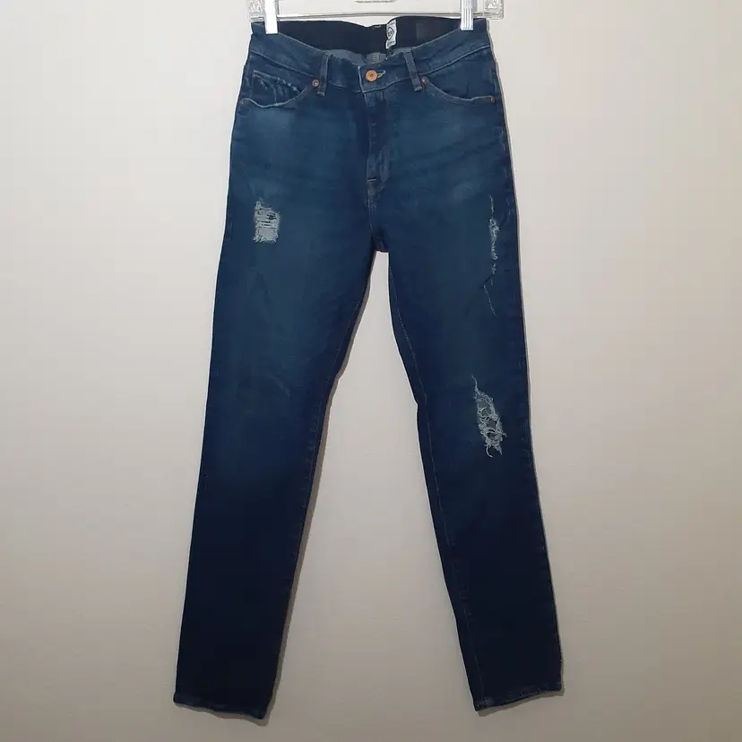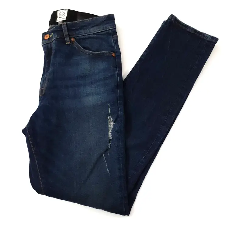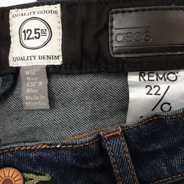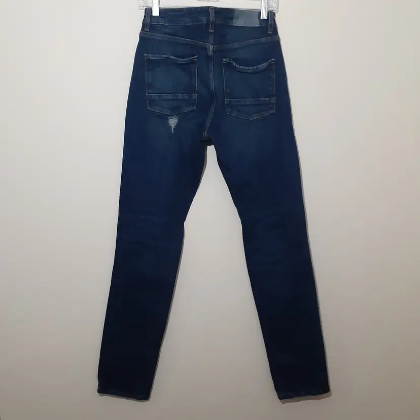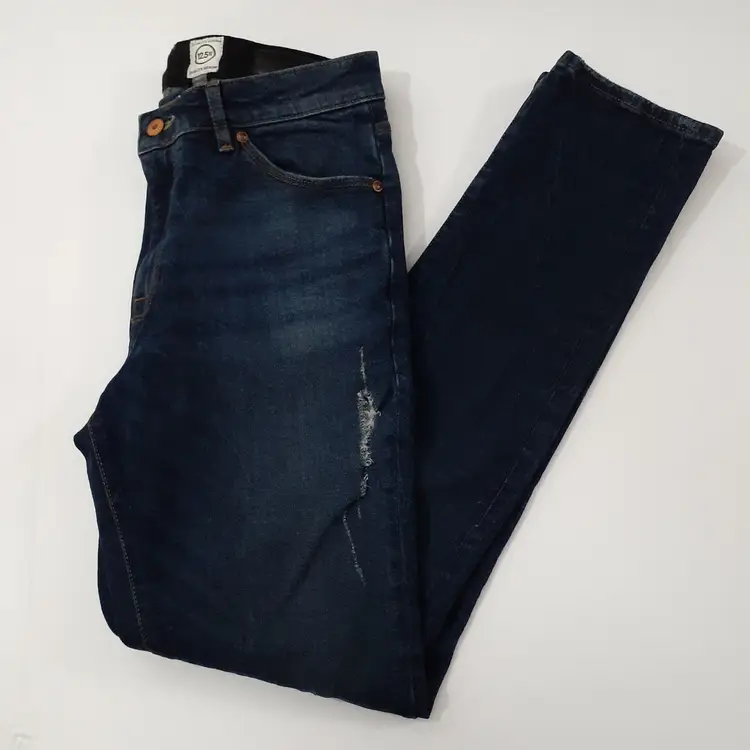 ASOS 12.5 Oz mens distressed slim straight jeans 32x32 dark blue denim 10" rise good pre-loved condition