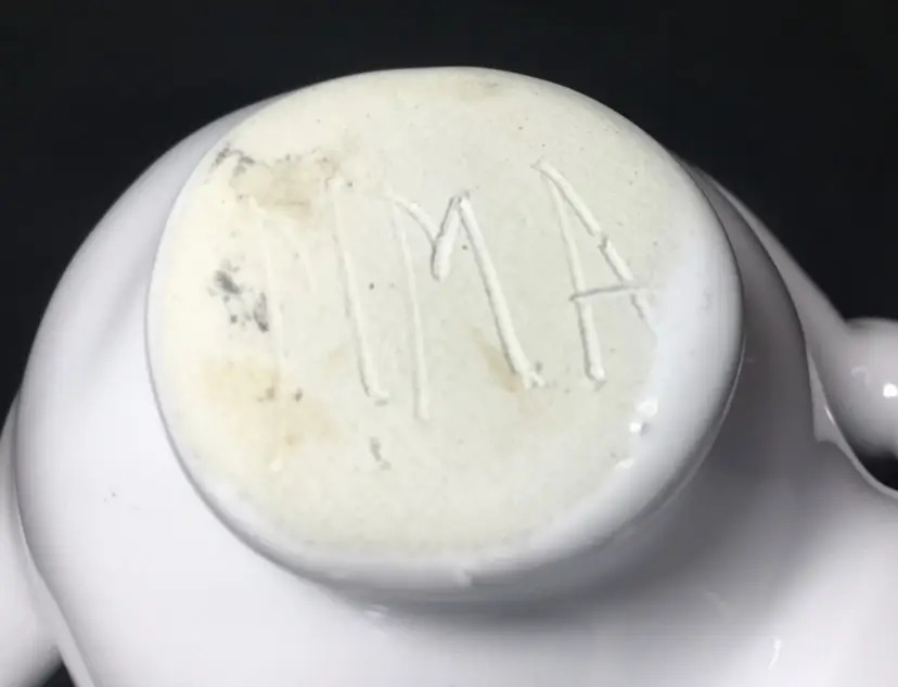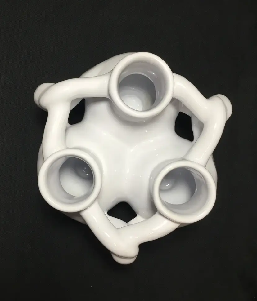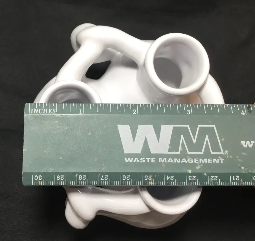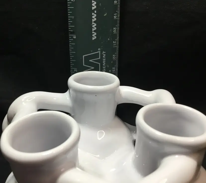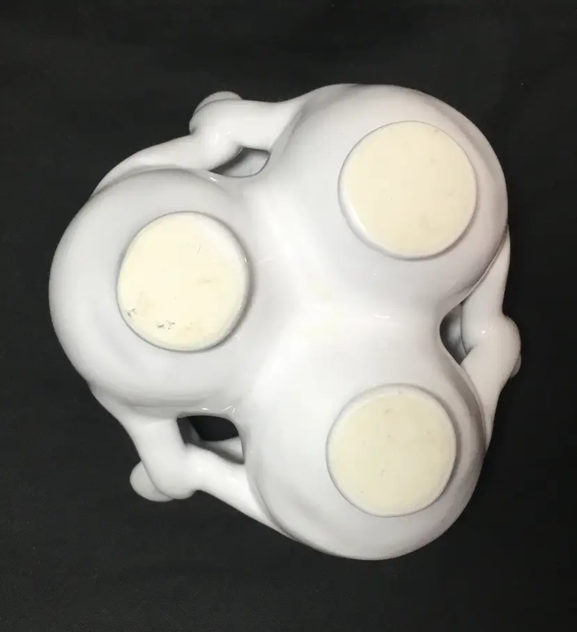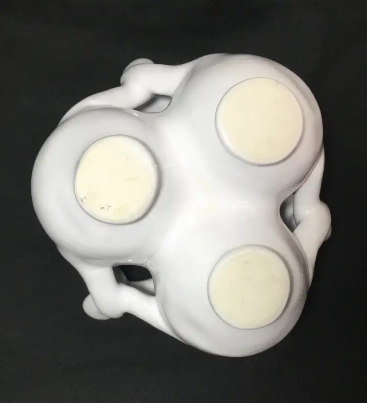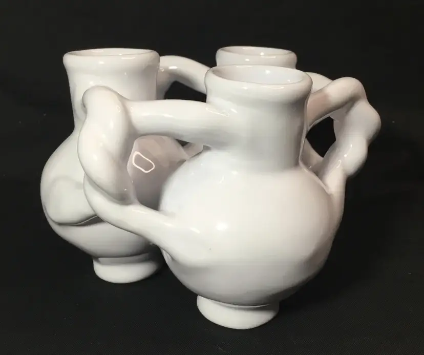 Approximately 4 inches in diameter by 3 inches tall. 3 ceramic bud vases with entwined arms. White glaze with clear glaze on top. Insides are all connected to central chamber. Inscribed "MMA" on base of one vase. Vintage from 1990s.