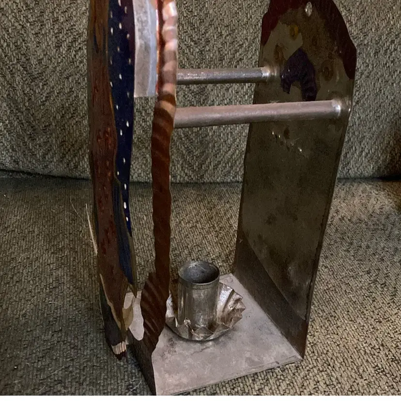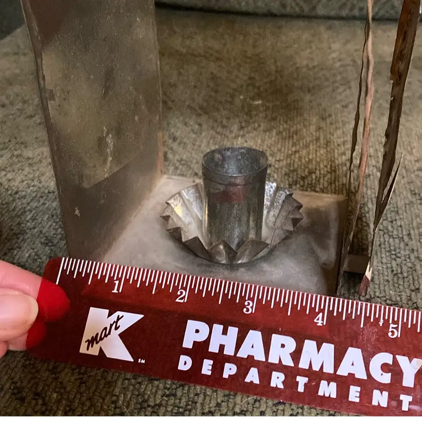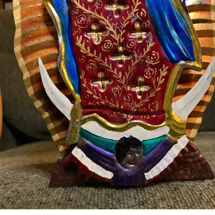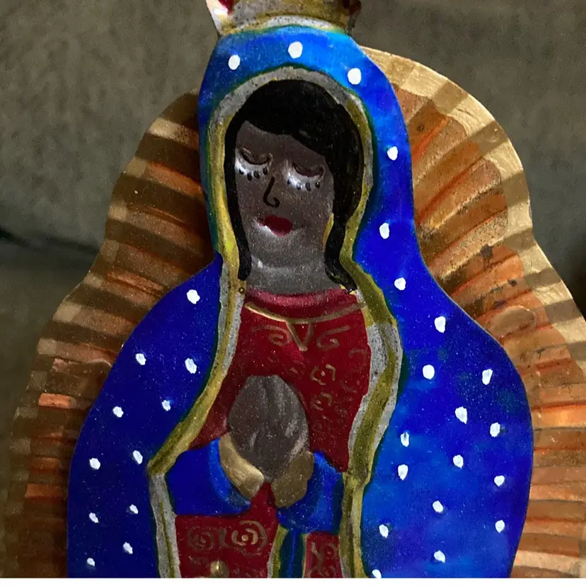 Hand painted Virgin de Guadalupe Metal Luminary Candle Holder. Made in Mexico. Lots of patina and character! Great colors. Good vintage condition. 10”Hx 4”Wx 4.5”D