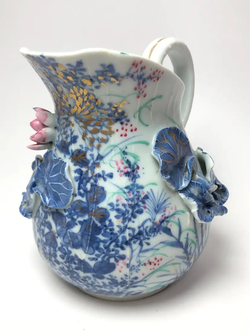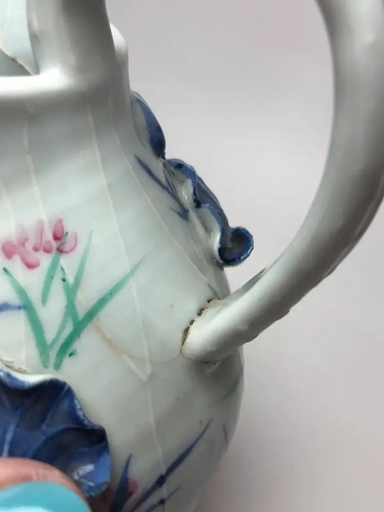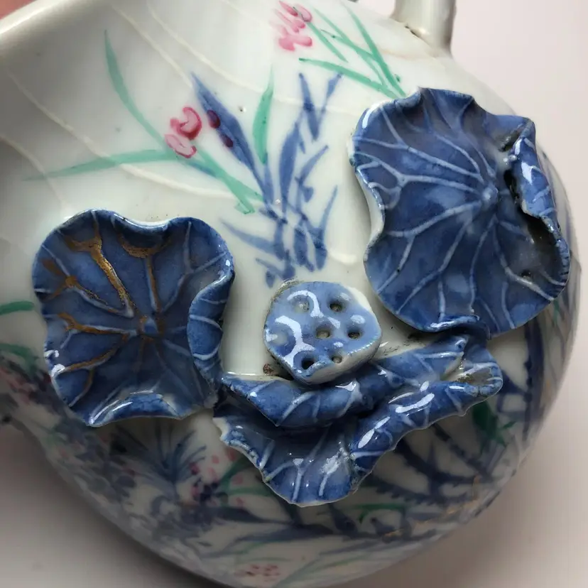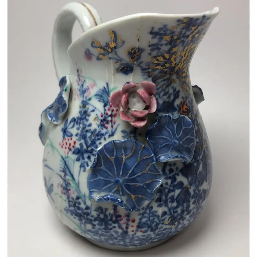 Mid 19th Century English Flow Blue Porcelain Pitcher Applied Water Lilies Pads. 5.25" tall x 4" diameter. PLEASE READ: There is a crack around the handle and some separation as shown. Small chip on one of the lily pads. Very detailed. Hand painted. The background color is sort of a greenish celadon. I have tested to make sure that it still holds liquids and it does without leaking.