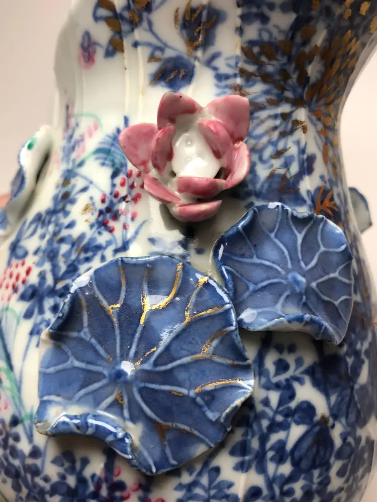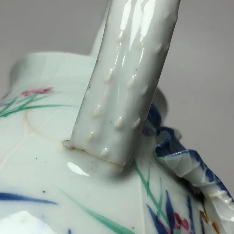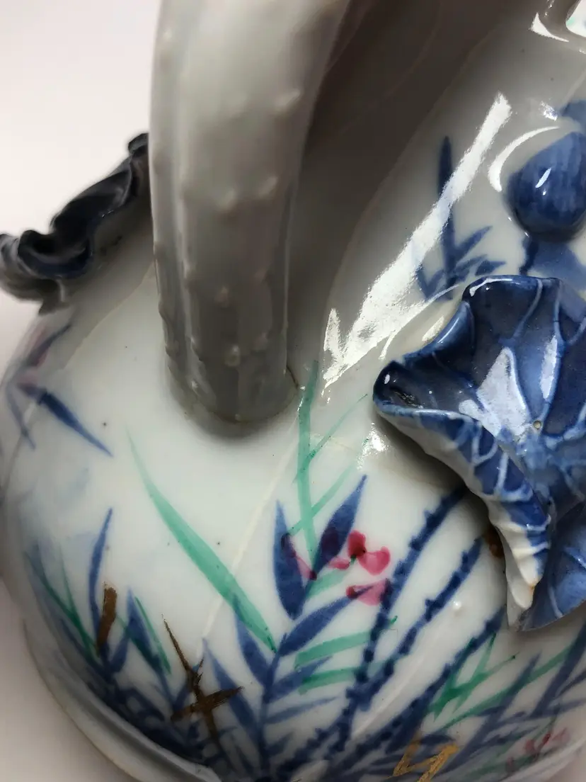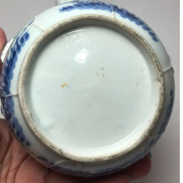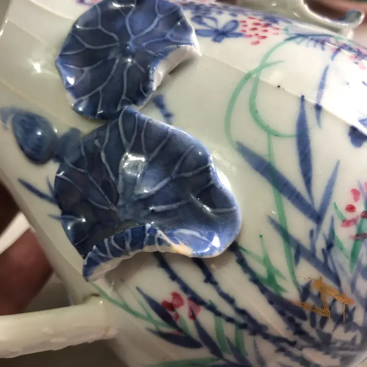 Mid 19th Century English Flow Blue Porcelain Pitcher Applied Water Lilies Pads. 5.25" tall x 4" diameter. PLEASE READ: There is a crack around the handle and some separation as shown. Small chip on one of the lily pads. Very detailed. Hand painted. The background color is sort of a greenish celadon. I have tested to make sure that it still holds liquids and it does without leaking.