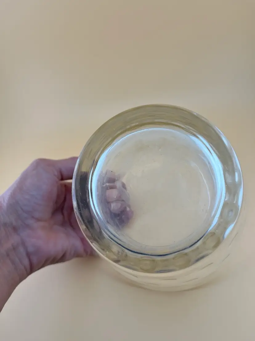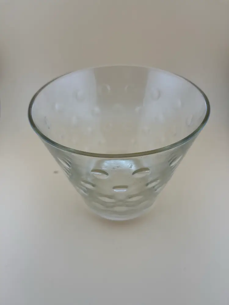 Approx 5.75” diameter, 5” tall. Approx 28.4 Oz. No chips/cracks.