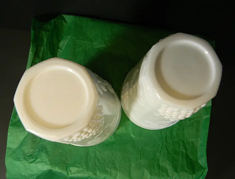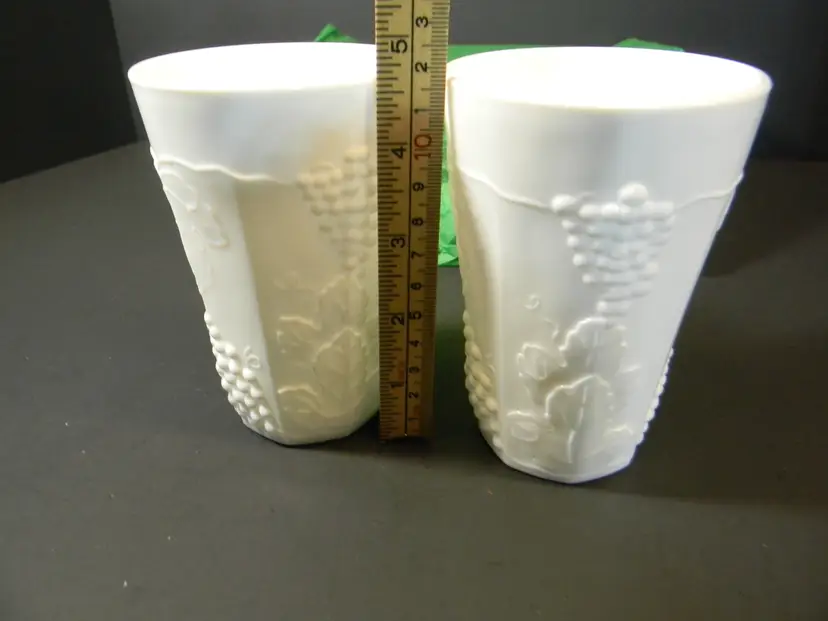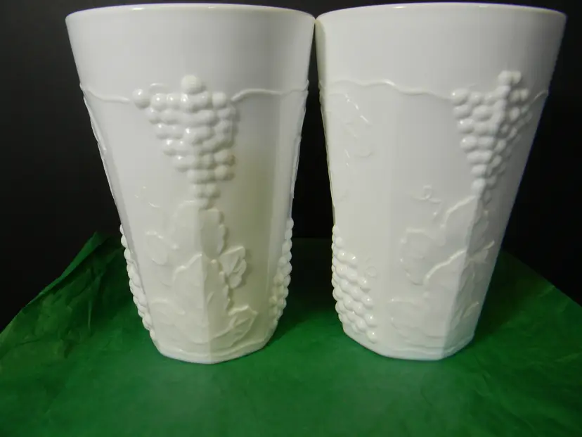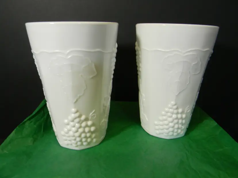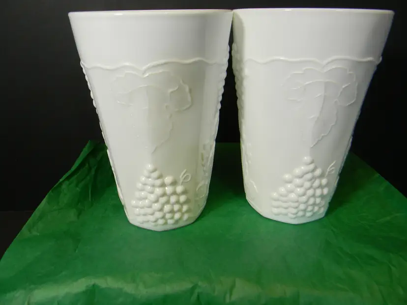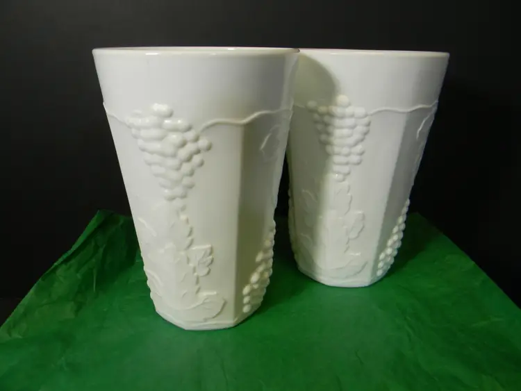 Milk Glass with Grapes and leaves on tumblers/glasses You can use these for water, tea, or just for decoration, add to your collection No chips or cracks used condition see photos The difference in computer monitors actual colors may vary slightly from those shown