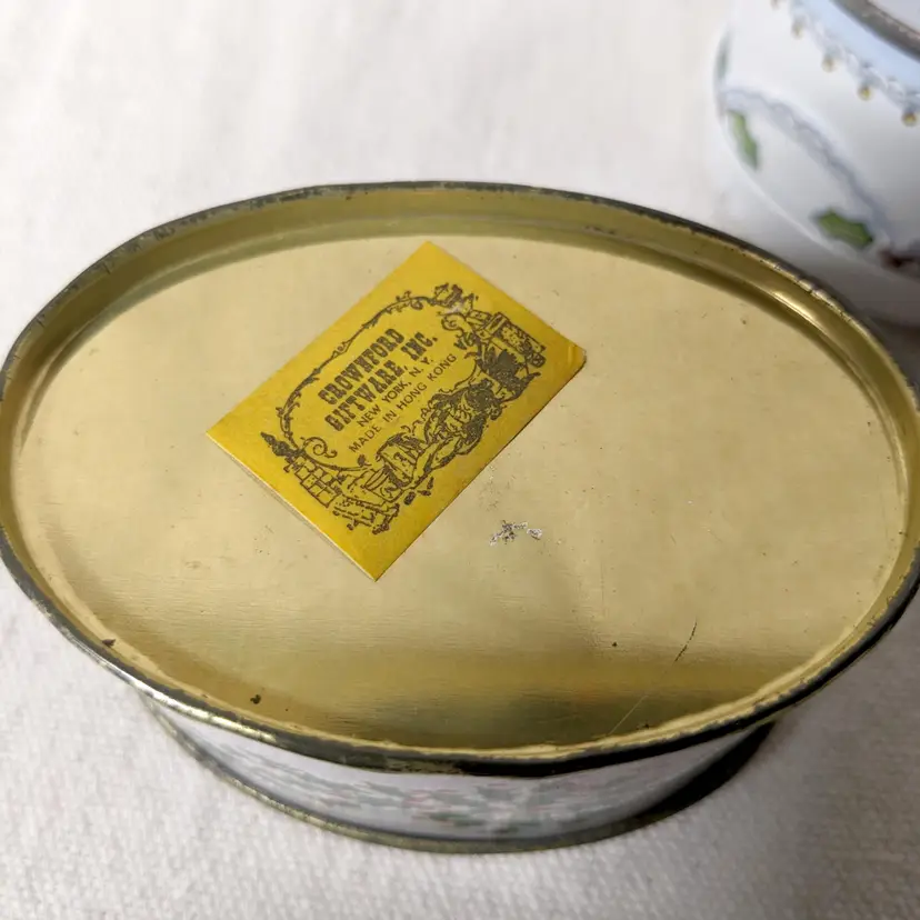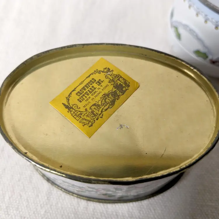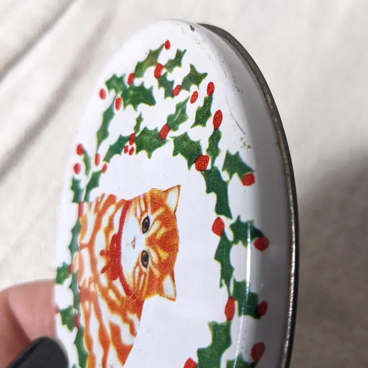 The oval cat tin still has its original paper sticker on the bottom and was made in Hong Kong.
