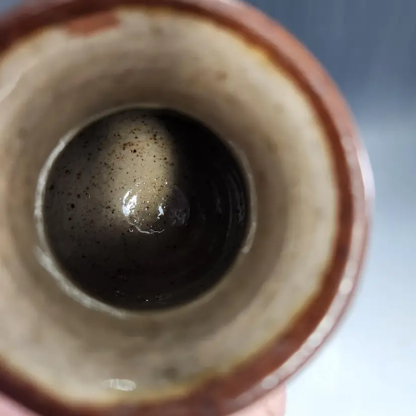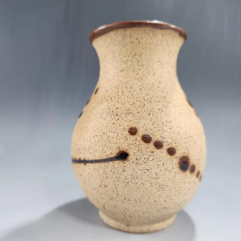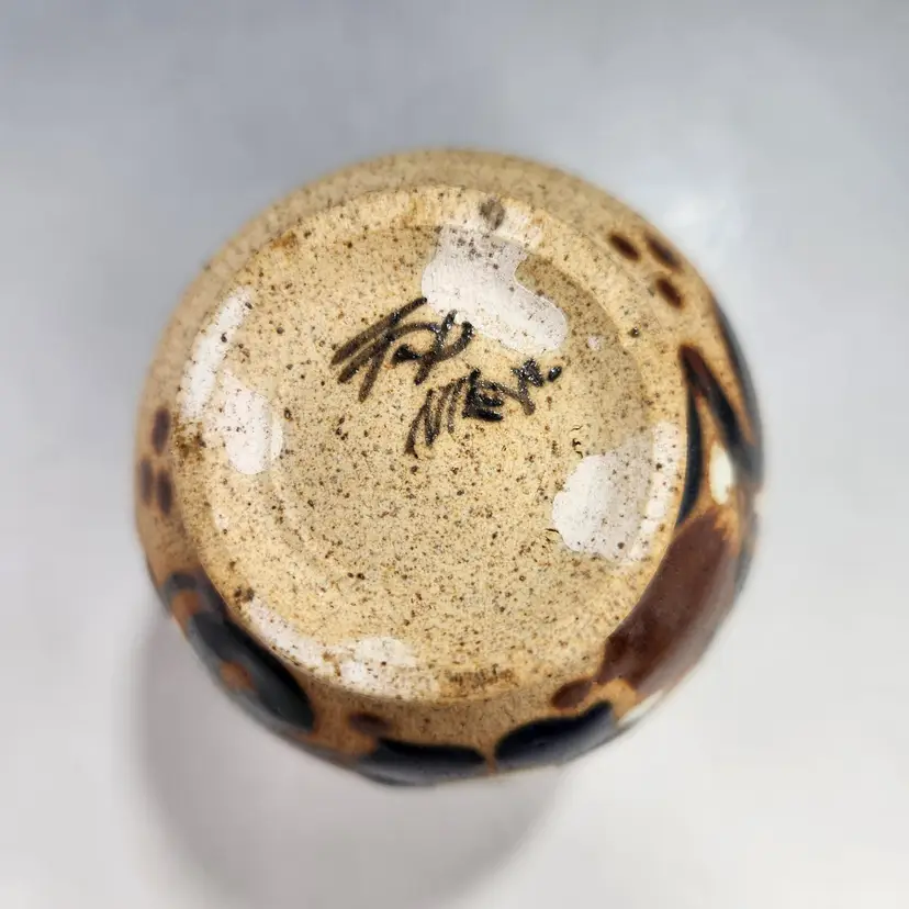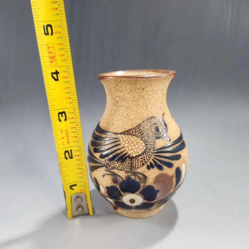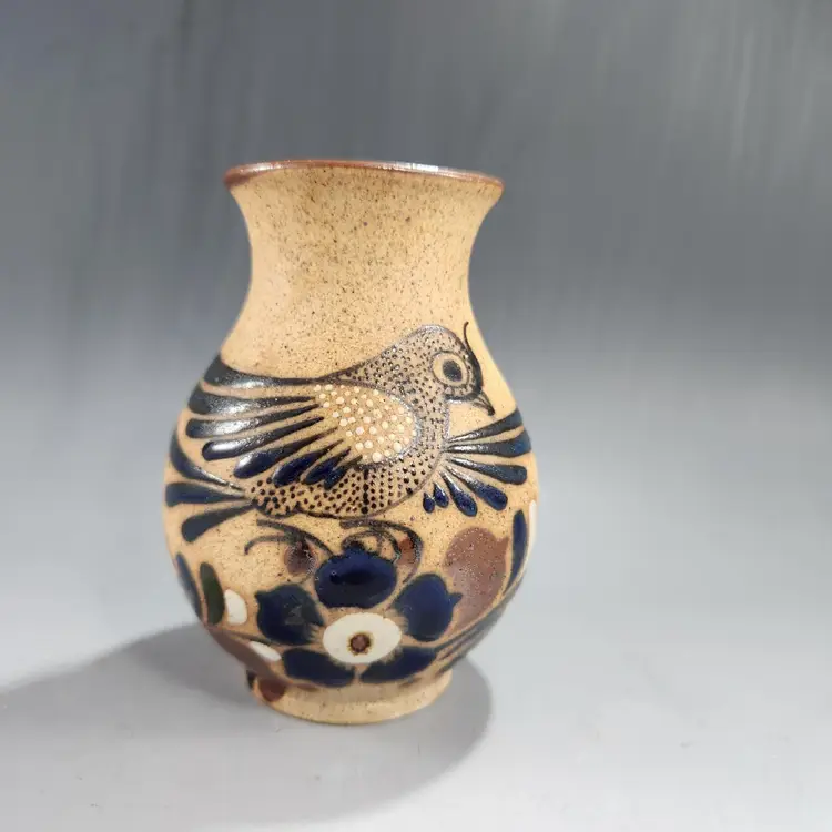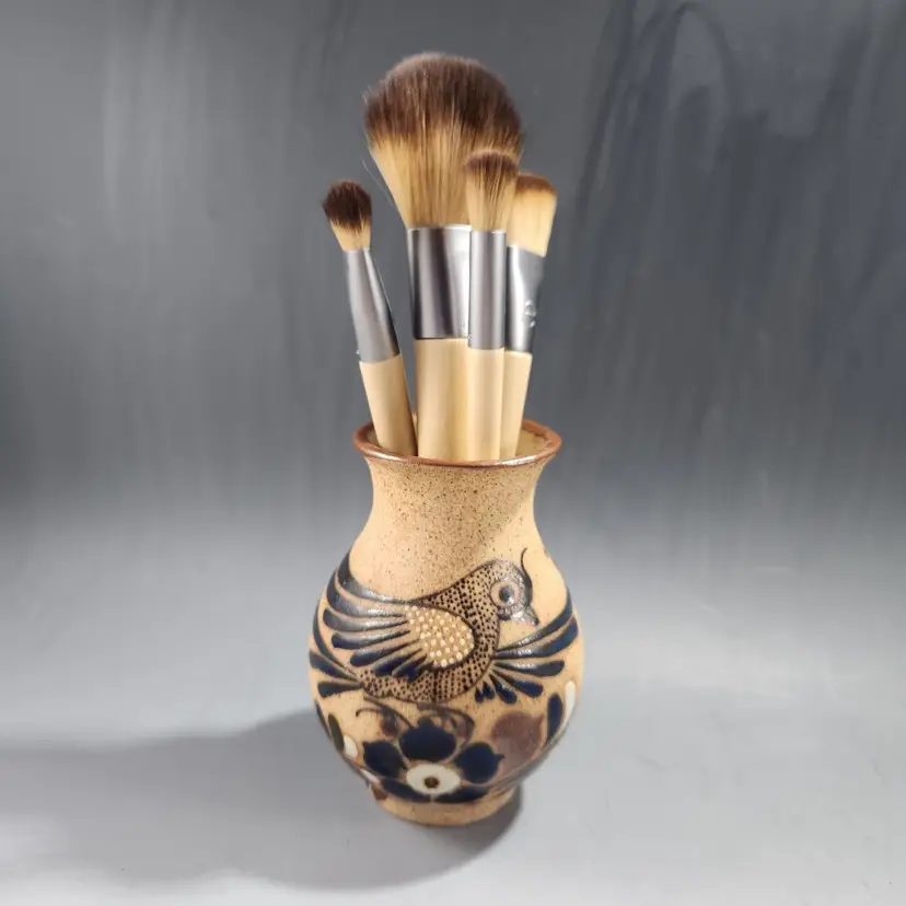 I love the intricate details on this beautiful little vase. It is rustic and elegant at the same time. Whomever painted it was an expert. Vintage Tonala Mexican sandstone pottery bird vase is a unique piece of art and could make a unique makeup brush holder on your vanity. Handmade in Mexico, this bird vase showcases the rich and vibrant Mexican culture. Unlike many Tonala pieces this is signed FP (I think) Mexico. Matte gritty texture on the exterior and smooth and glossy to hold water on the interior. Makeup brushes not included.