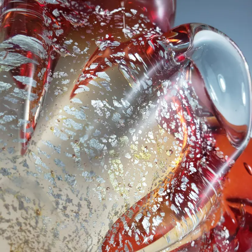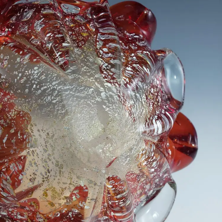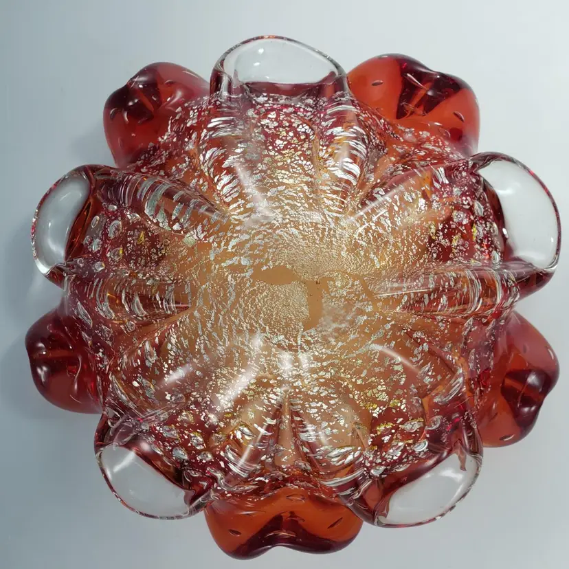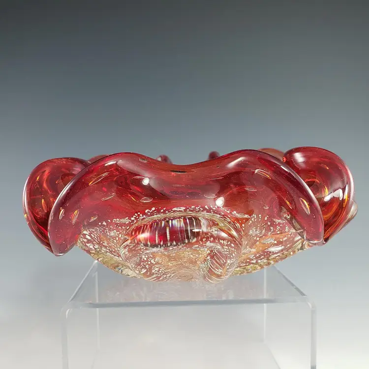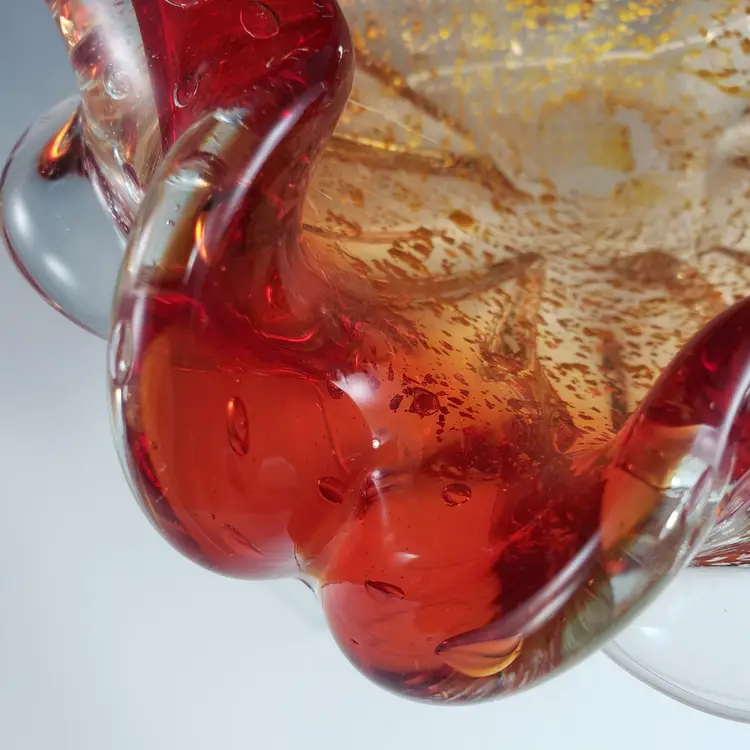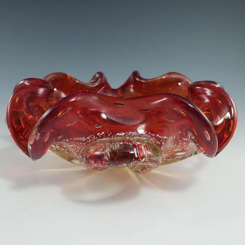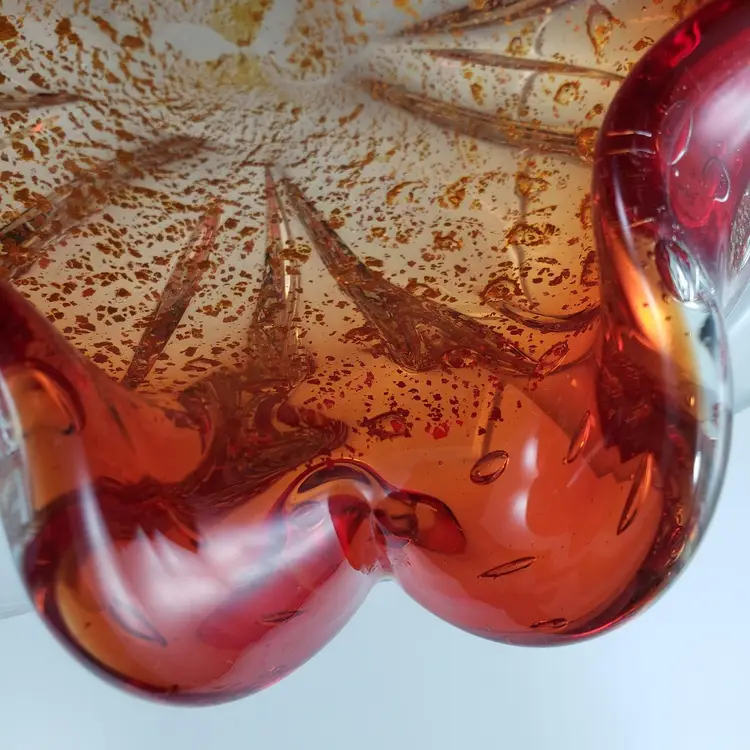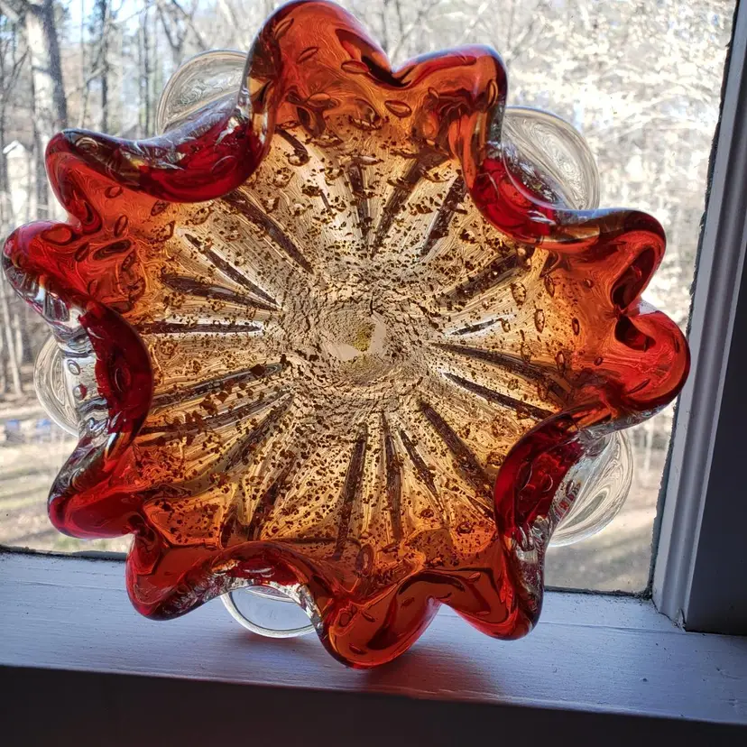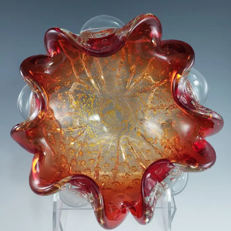 This bowl has it all & the photos do not do it justice! Heavy rolled edge bowl, this style is frequently attributed to the 1960s studio of Fratelli Toso in Murano, Italy but it could be by one of several Murano artists. First it's a very unusual color - amberina - which means it goes from deep orange red at the top through lighter shades of orange to clear at the base. Lovely & difficult bullicante (controlled bubble) technique goes from large bubbles at the top to small at the base. It also features silver aventurine (flakes) throughout the piece. This gives you a great visual combination of silver flakes showing on the rolled edge from the bottom and gold flakes when seen through the orange tone glass on the top, very eye catching as well as the large bubbles being featured in the rolled edge of the bowl. Highly polished clear base, this would be outstanding lit from above or below. Great gift for the glass lover in your life.