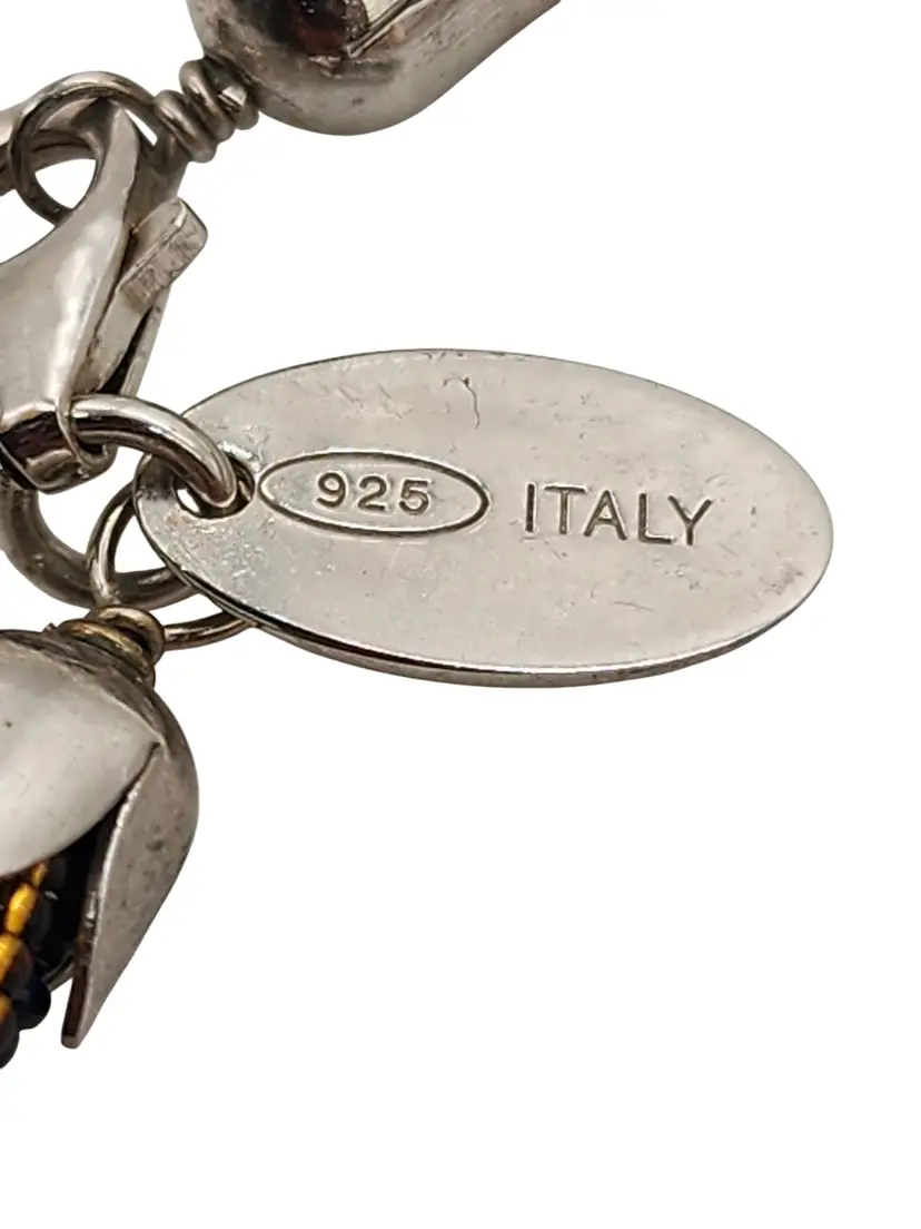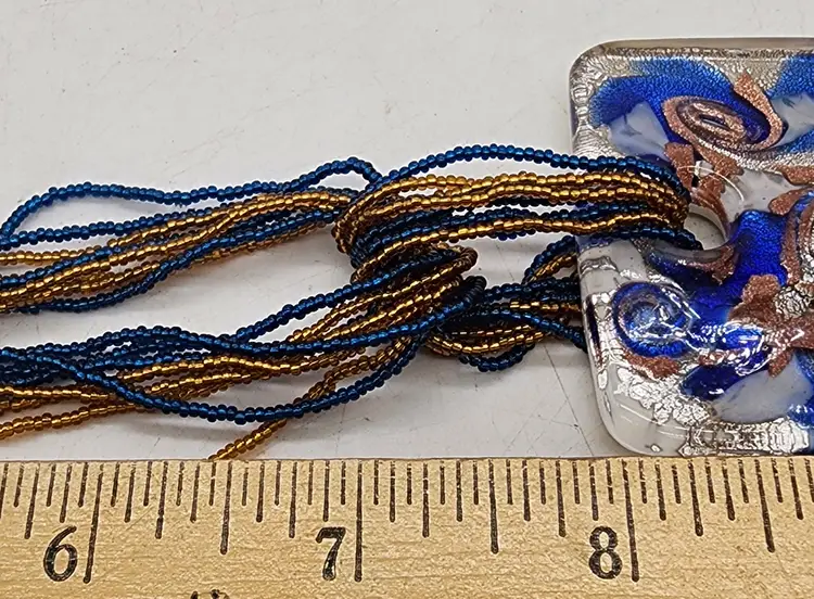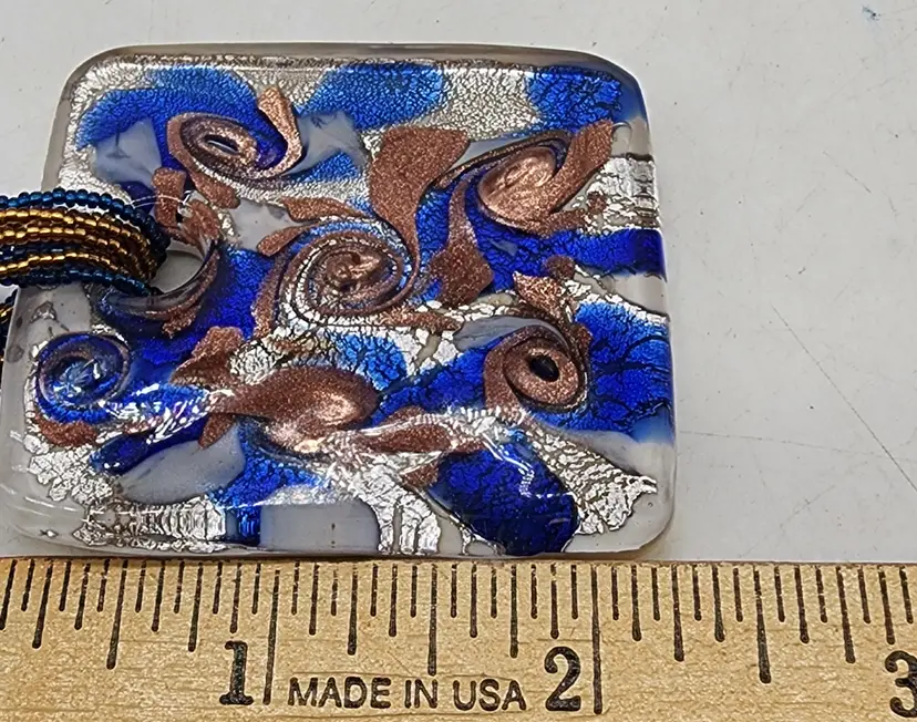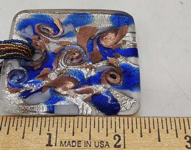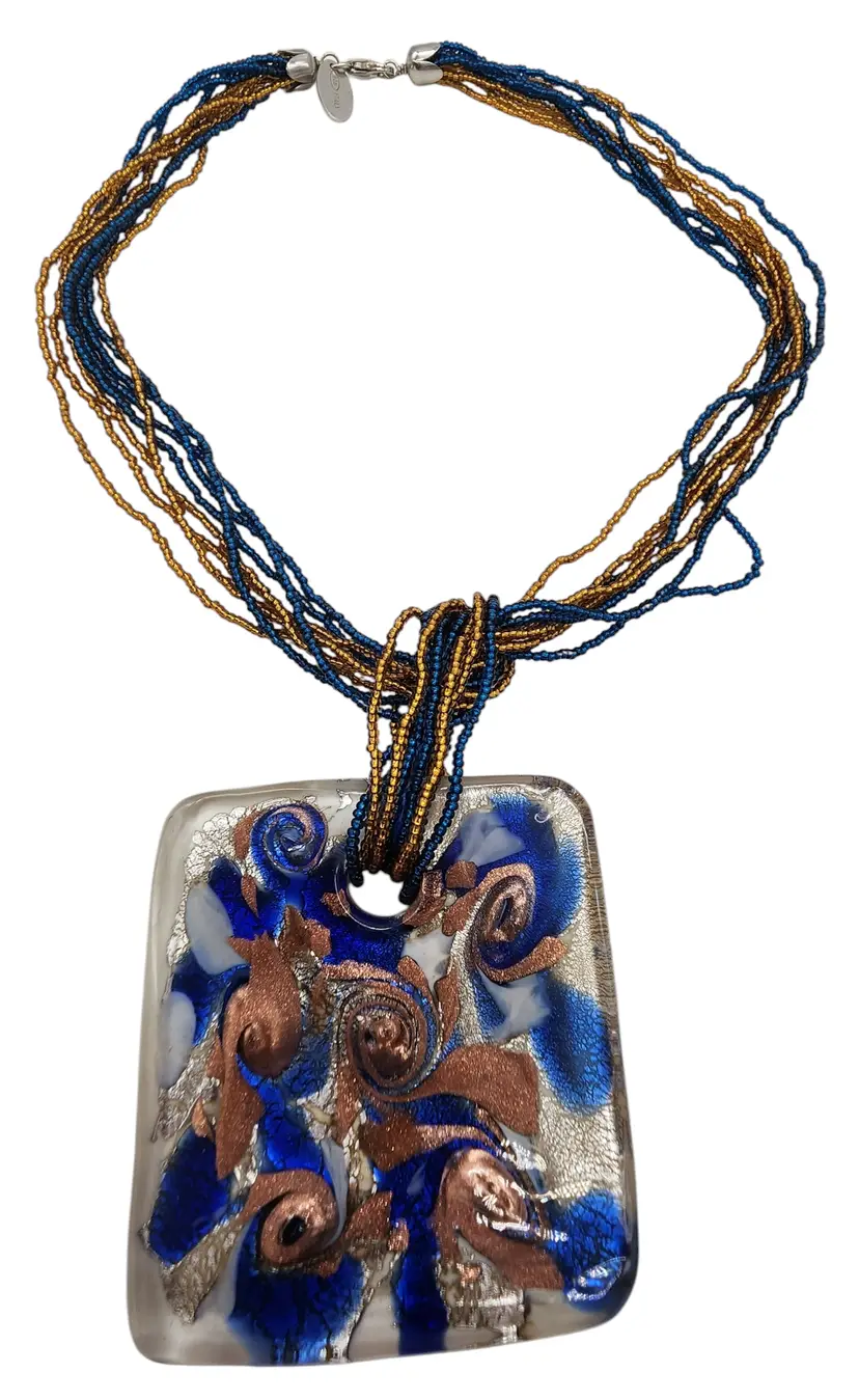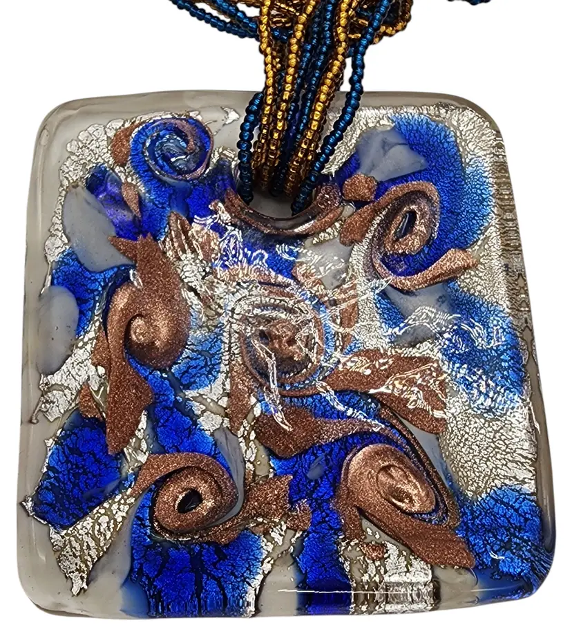Elevate your jewelry collection with a touch of Italian artistry. This Murano glass pendant necklace showcases a striking blue hue complemented by copper accents, offering a sophisticated splash of color to any ensemble. The round glass stone is meticulously crafted, sitting gracefully atop a 16-inch chain that sits comfortably around the neck. The necklace exudes a timeless style, perfect for those who appreciate the elegance of handmade accessories. Originating from Italy, the piece marries the luster of copper with the vibrant clarity of blue glass, creating a Necklace that is both versatile and captivating. Whether for a special occasion or everyday wear, this pendant is an exquisite addition to your collection.