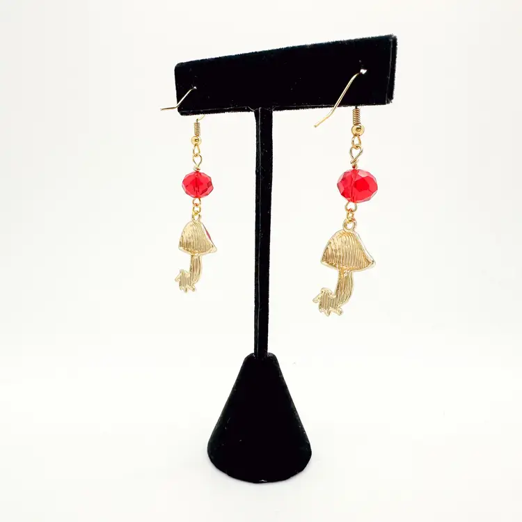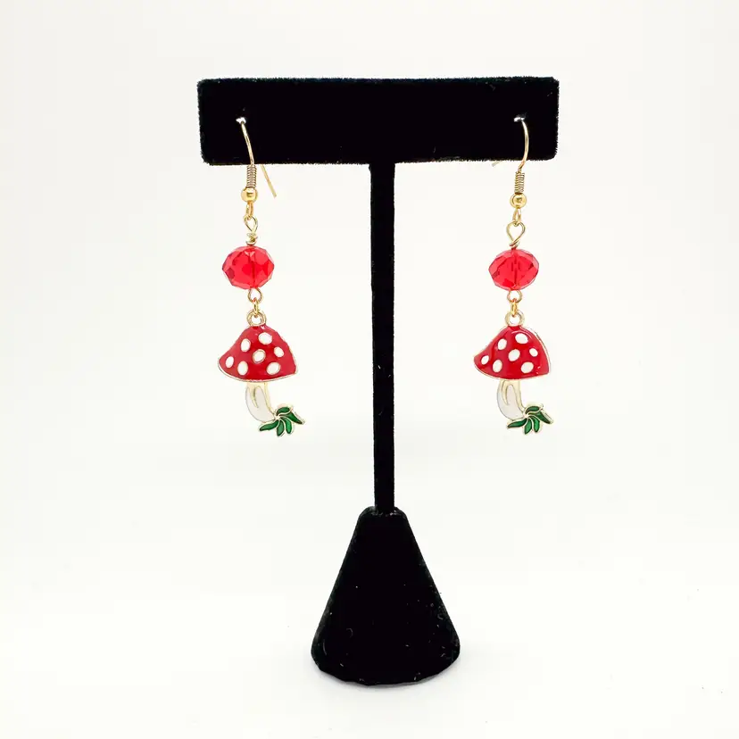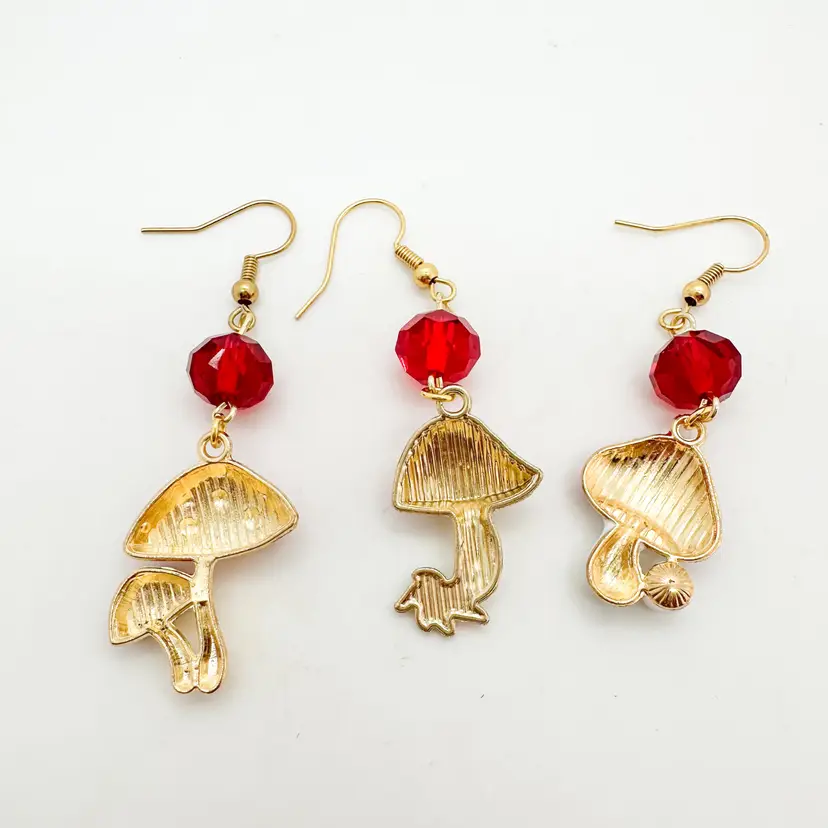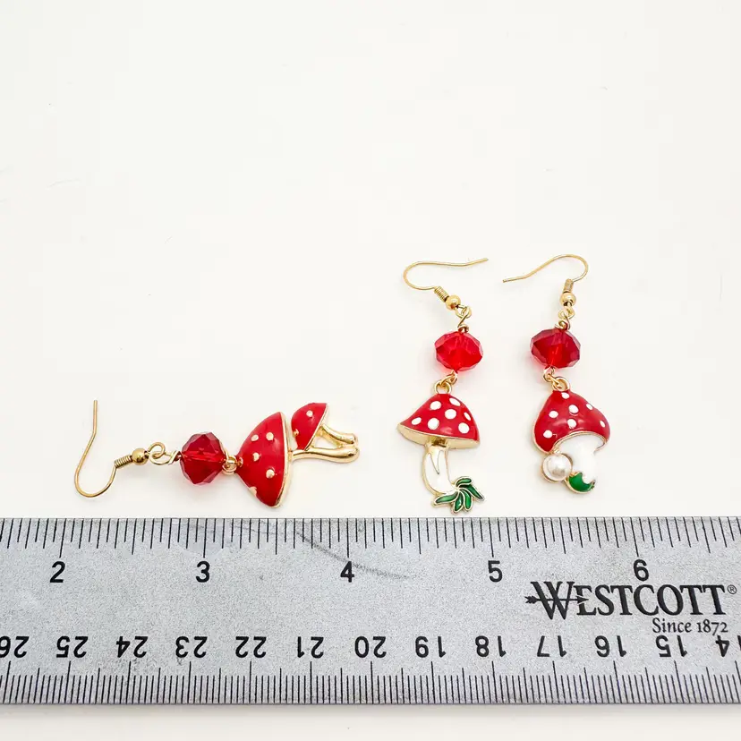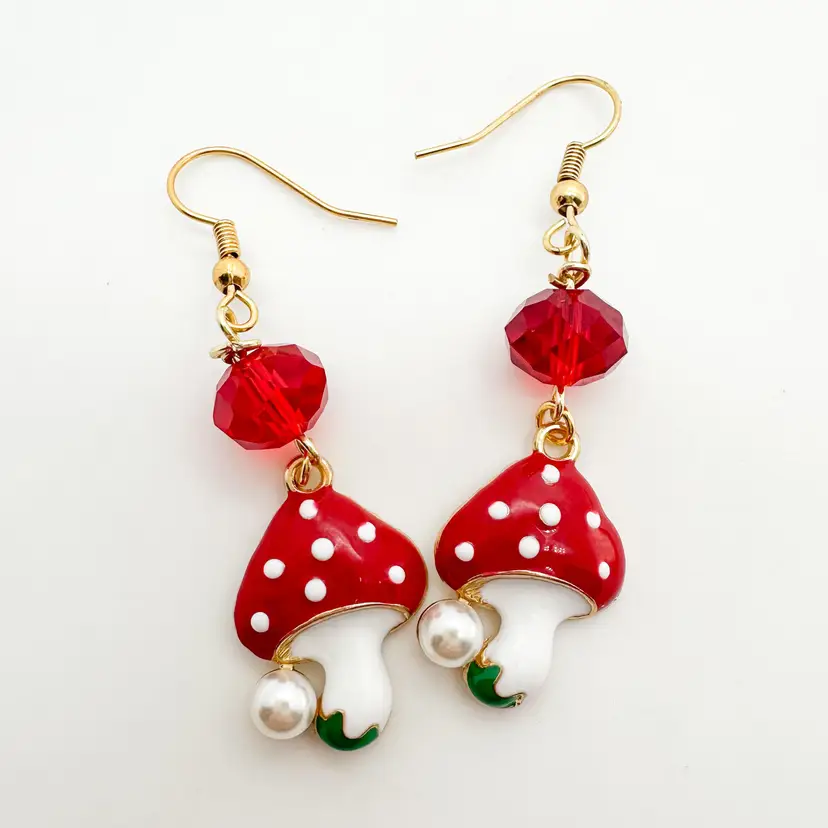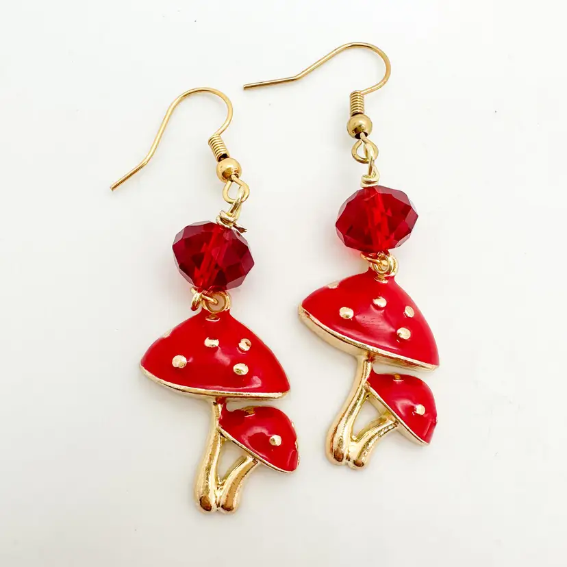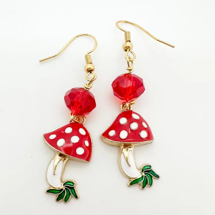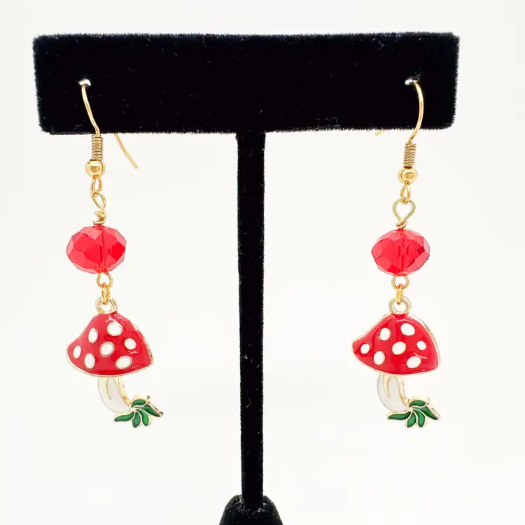 Mushroom Earrings, variant options Red, white, green enamel details Gold tone Approximately 2" L, varies Handmade