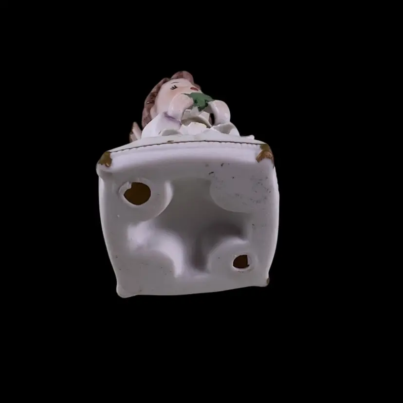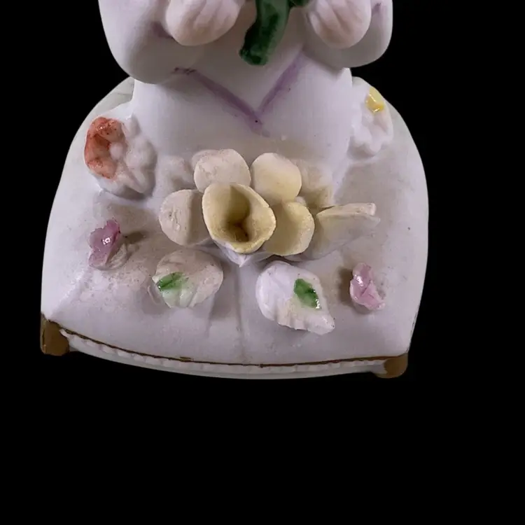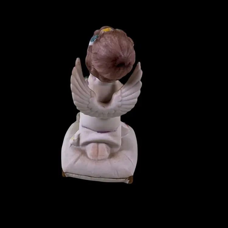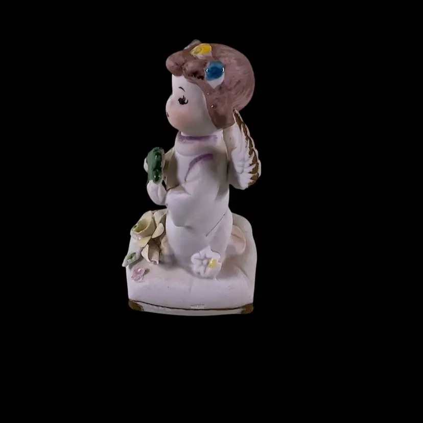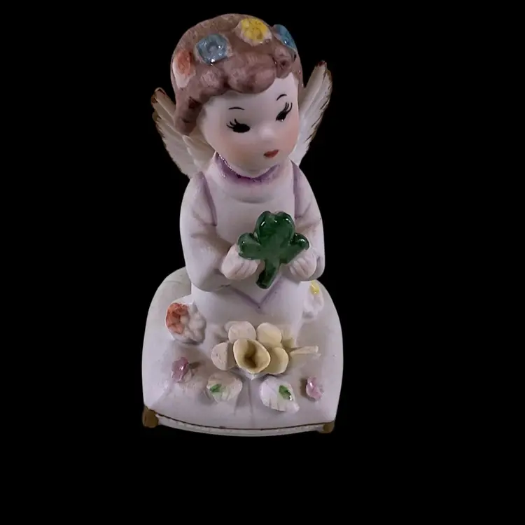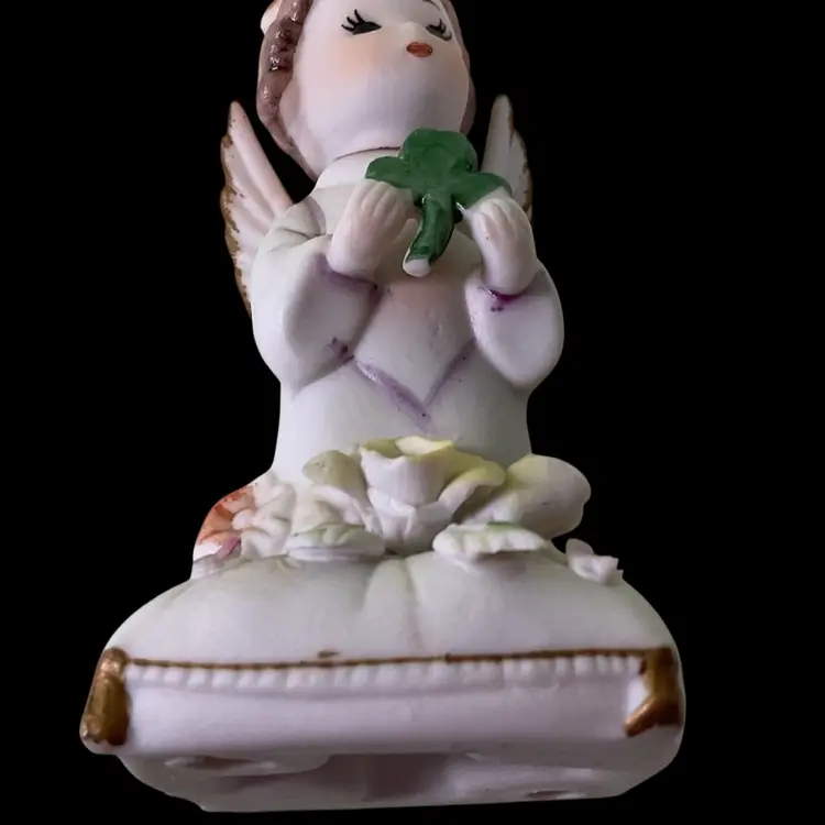 Vintage Napco March Angel Figurine. She is kneeling on a pillow holding a shamrock. Wings are in tact with no damage. The big flower on the pillow has a broken petal as well as a flea bites on the others. She is approximately 4 inches tall. Please see all photos for a more detailed description of the condition.