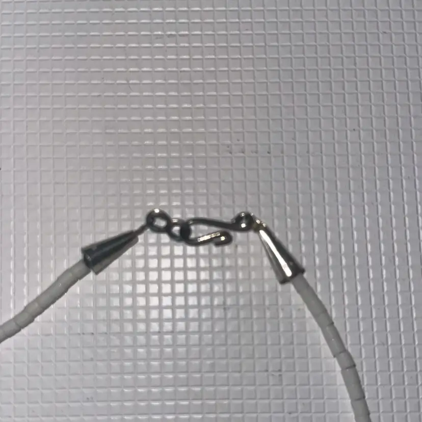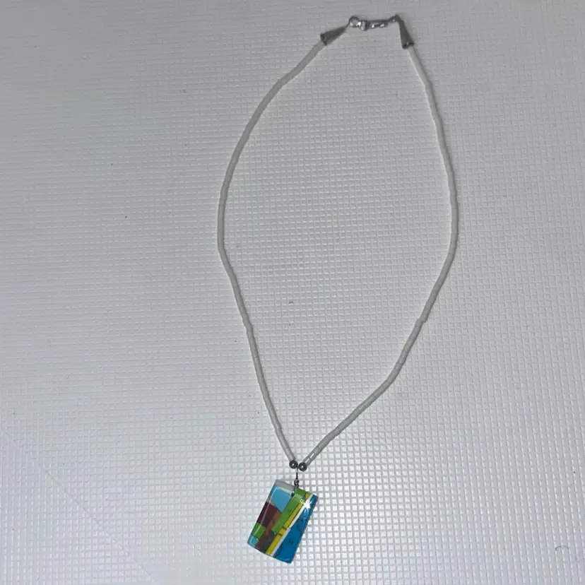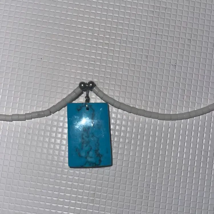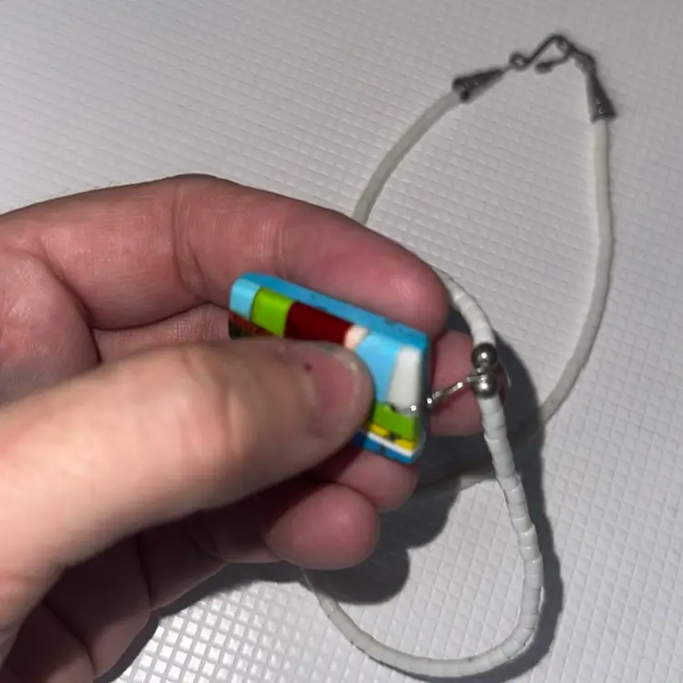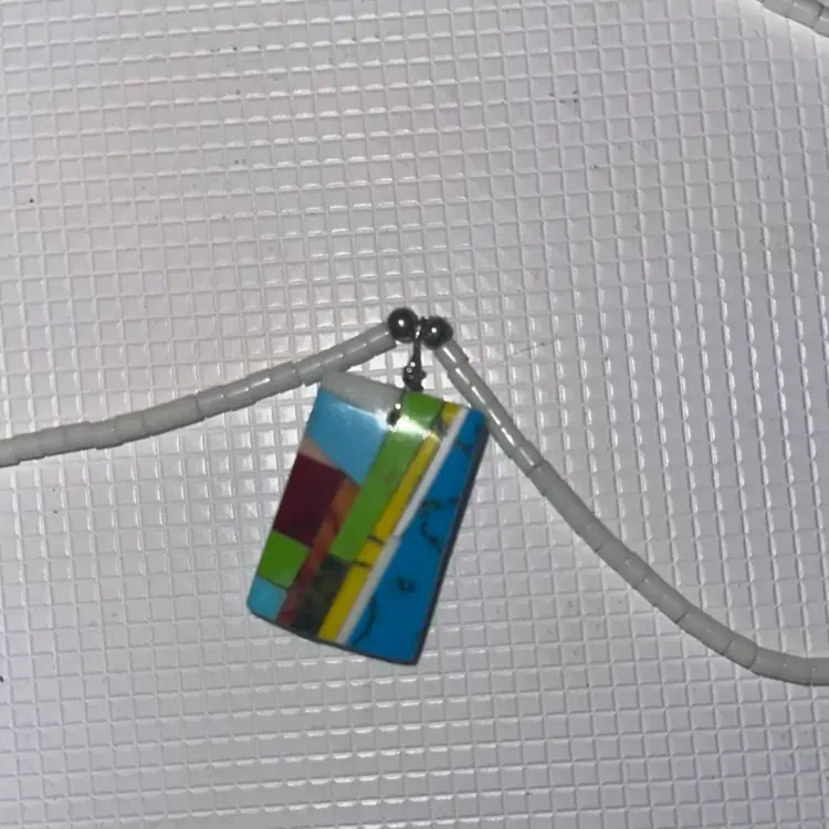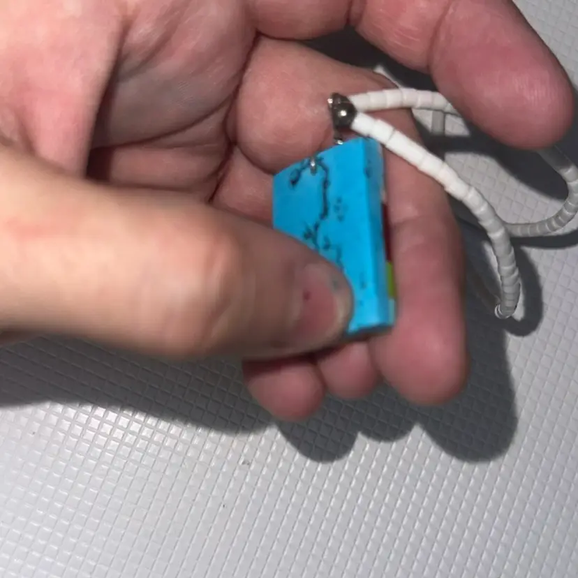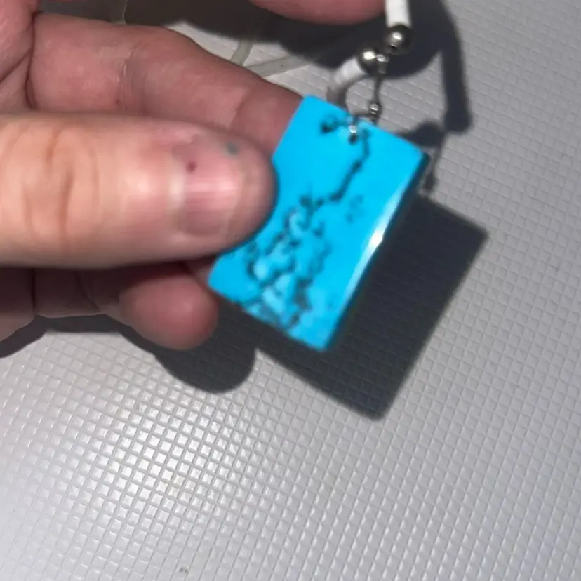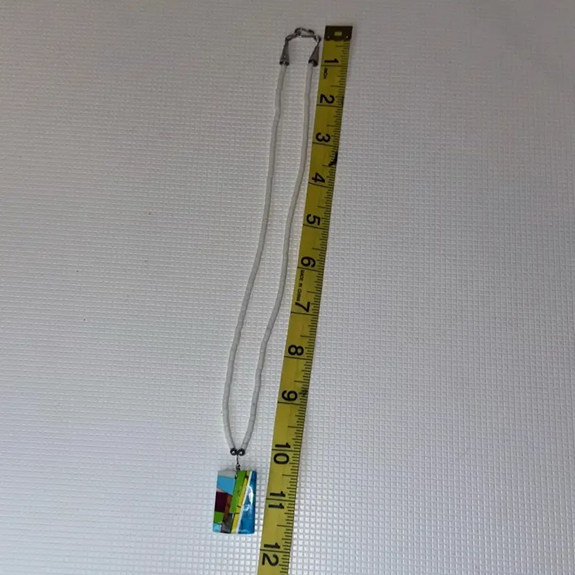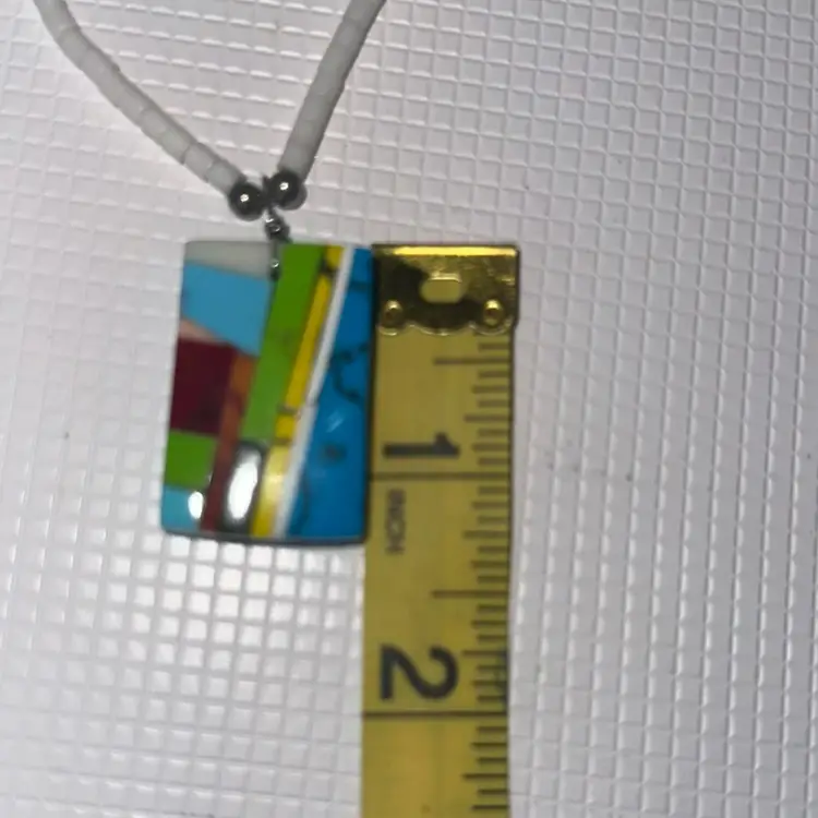On the the pendant the are chipps measures almost 12” long and pendant is over 1”long tested not sterling silver silver on hook