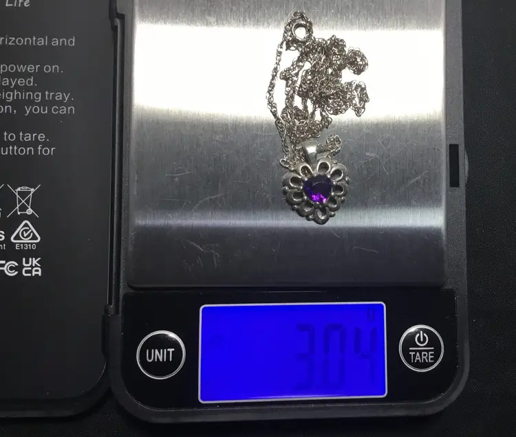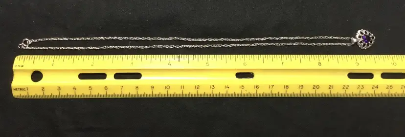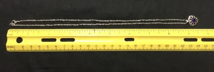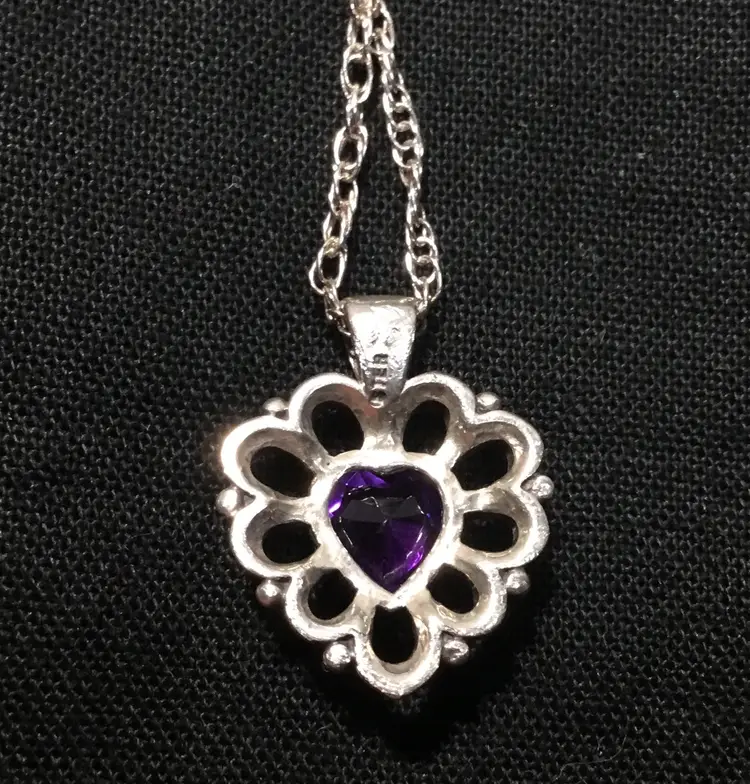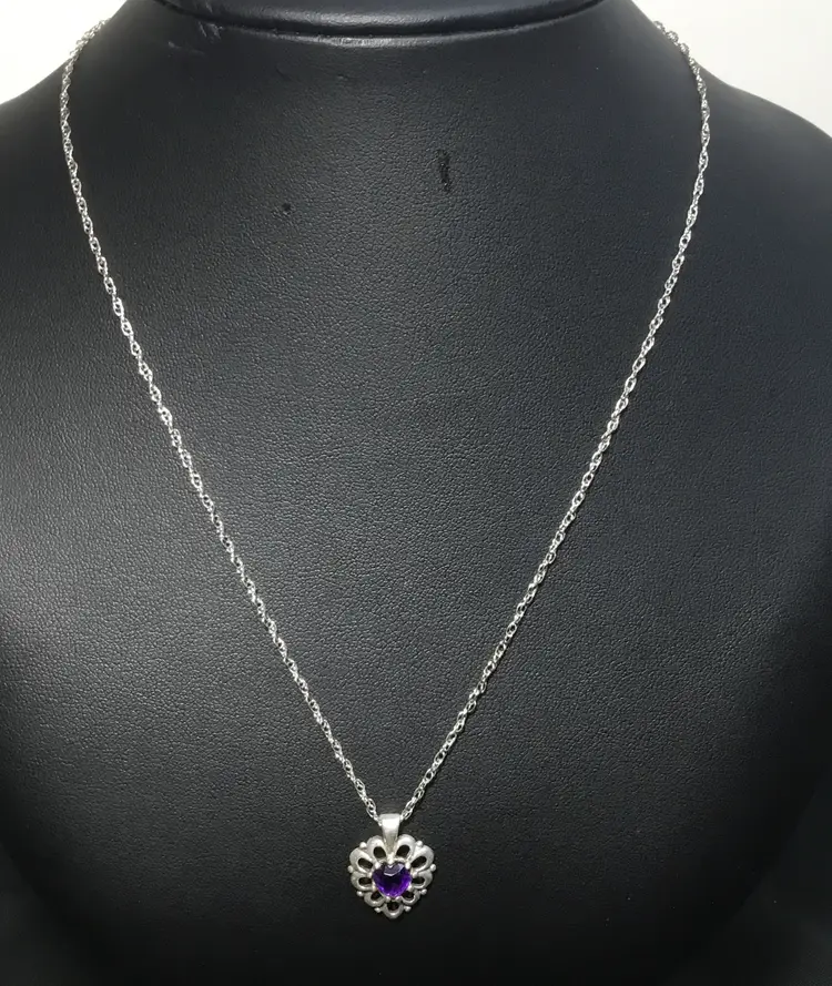 18 inch long rope chain in sterling silver, marked "925 MSCQ" on the spring ring clasp. 1/2 inch long sterling, heart-shaped pendant with round, faceted amethyst in center, open work, bezel set, marked "STER" on back of bail.