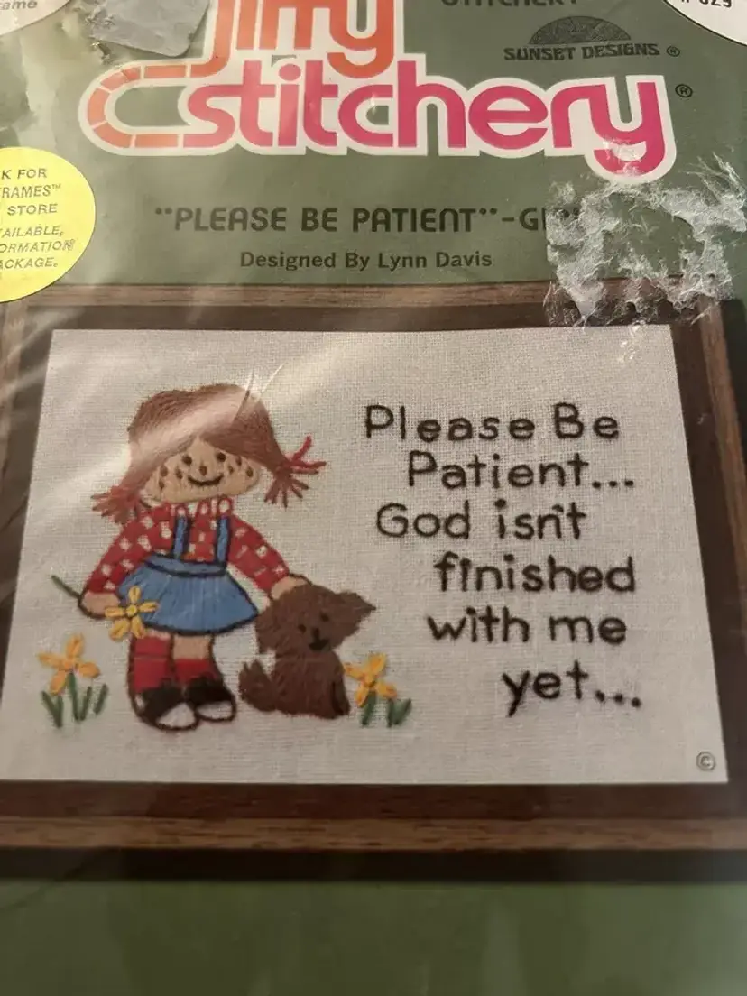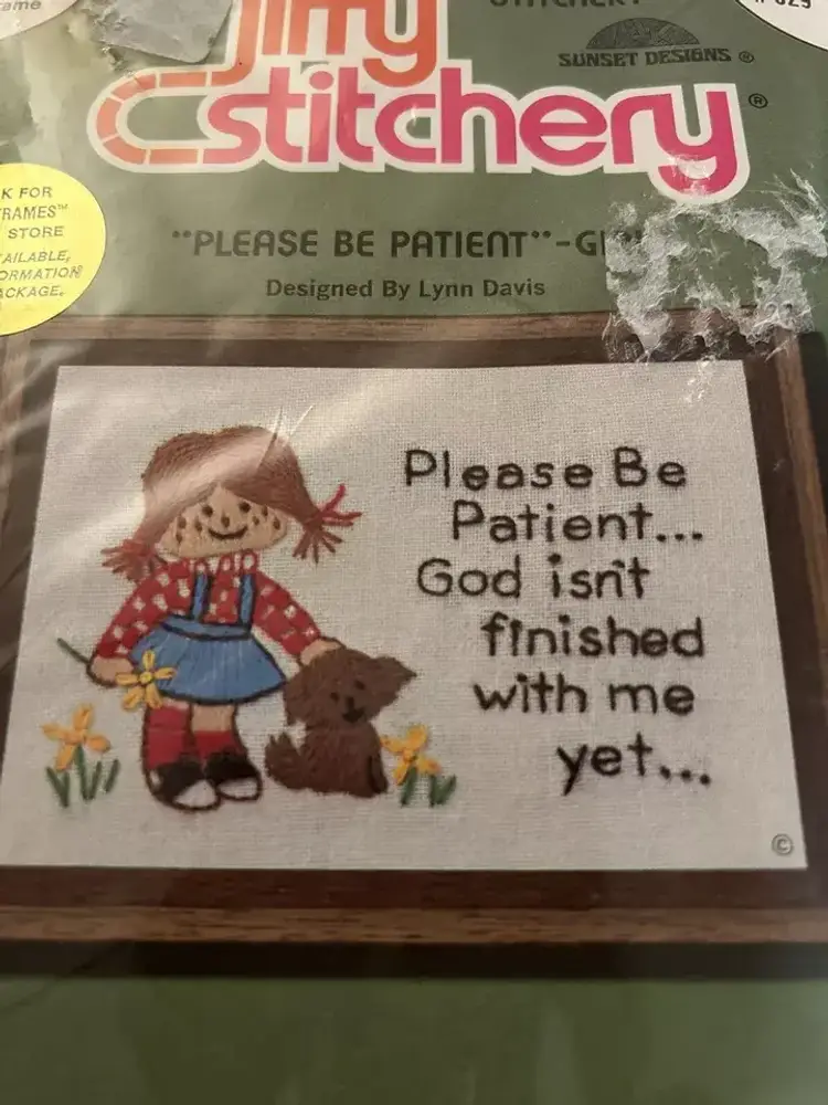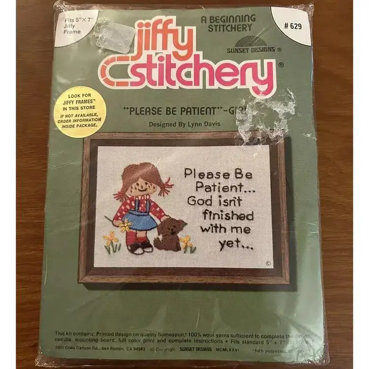NEW SEALED Sunset Design Jiffy Stitchery Kit Please be Patient 629 Size 5 x 7 In