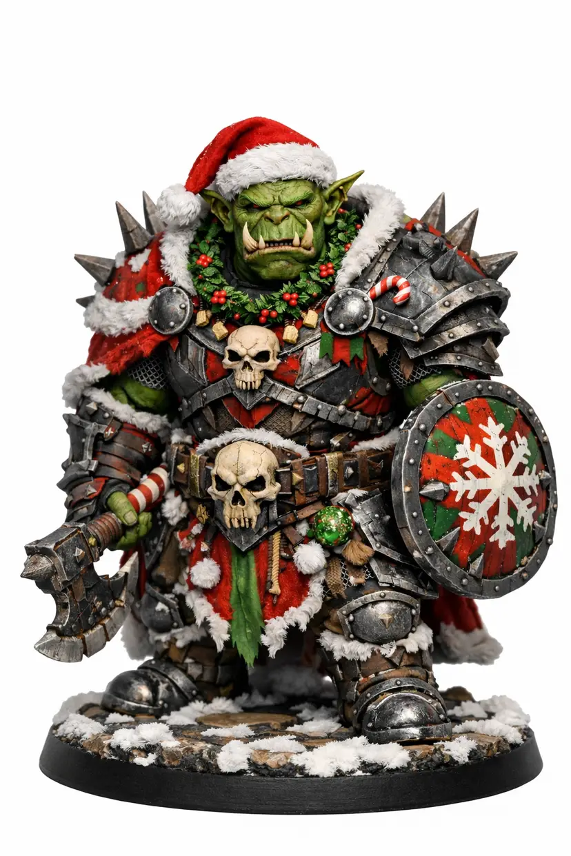 Perfect For: Original Christmas-themed orc warrior with axe and shield, Holiday one-shots, Winter encounters, Orc warbands, Display & painting competitions & Stocking stuffers for DND players