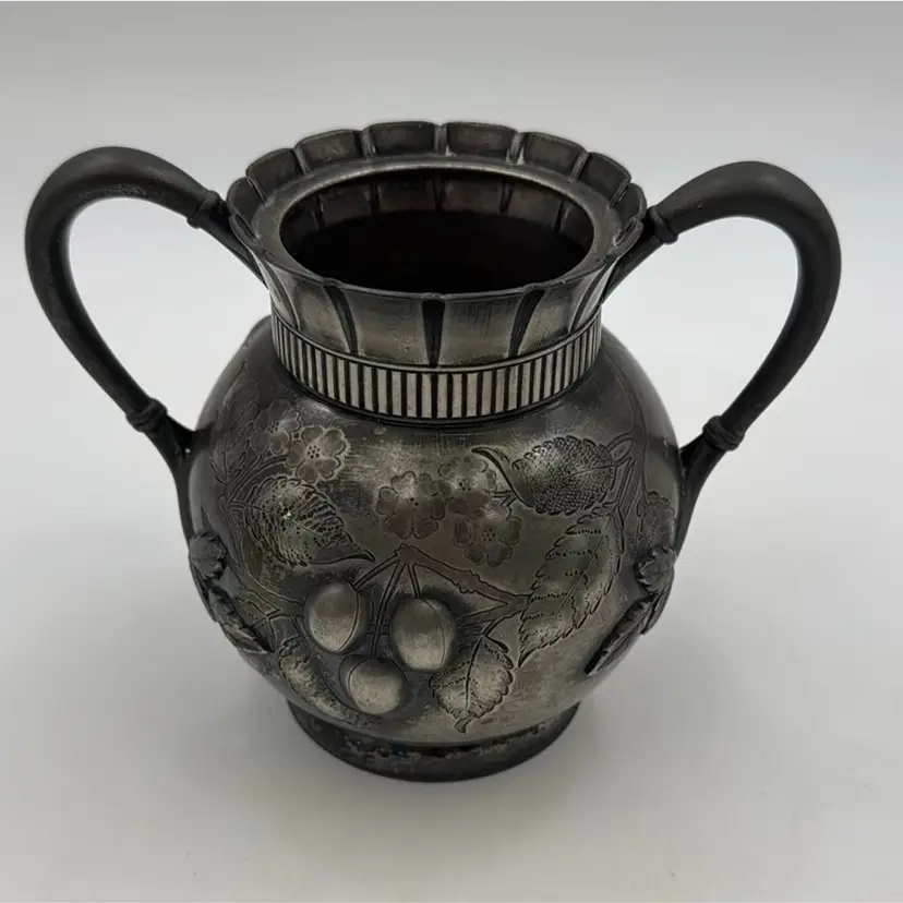 4 3/5”T 6”W small bind on bottom pedestal in wonderful patina condition. It is missing a lid, but that doesn’t take away from the beauty. You could use it for whatever you want.
