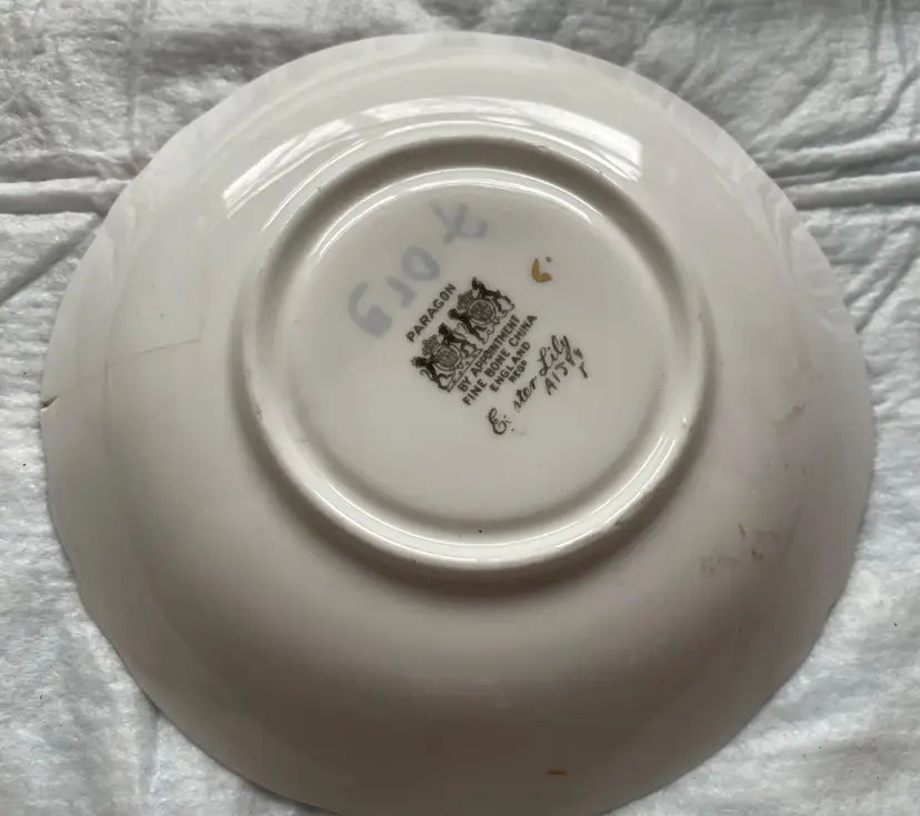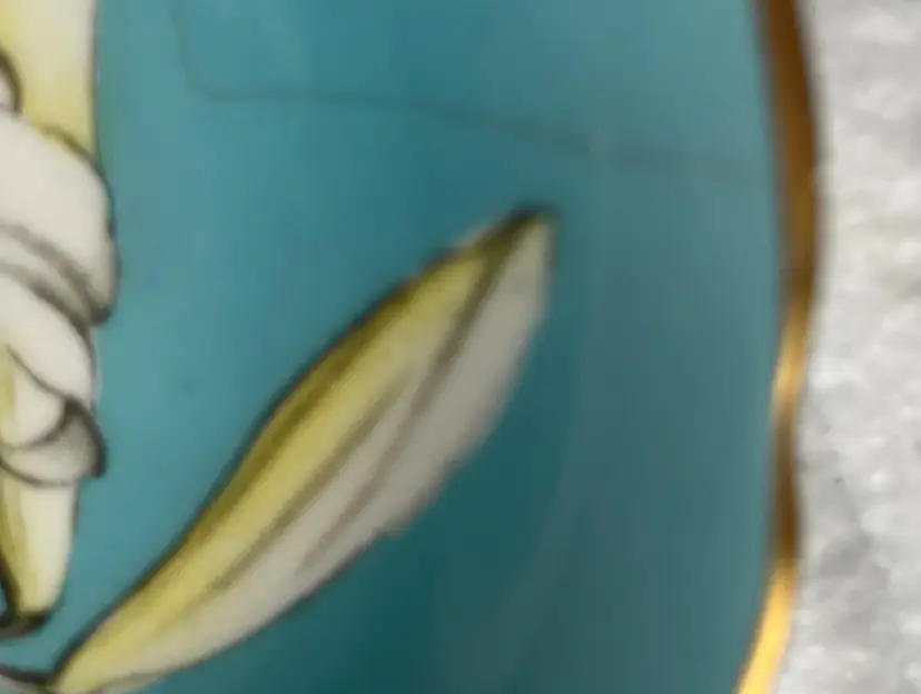 So sad that this saucer with its white Lillie’s and turquoise blue background has a crack (please see all pictures for this flaw). It is not as noticeable on the front as it is on the underside. The gold trim show no wear. This price is for a saucer only. I show it’s flawless partner (teacup) in another listing on this page. It is so unfortunate that I had to separate them. This would make a lovely trinket dish or a small dish in guest bathroom for soaps, a dish for holding a nice round candle or just as is to be displayed in your China cabinet. Beautiful.
