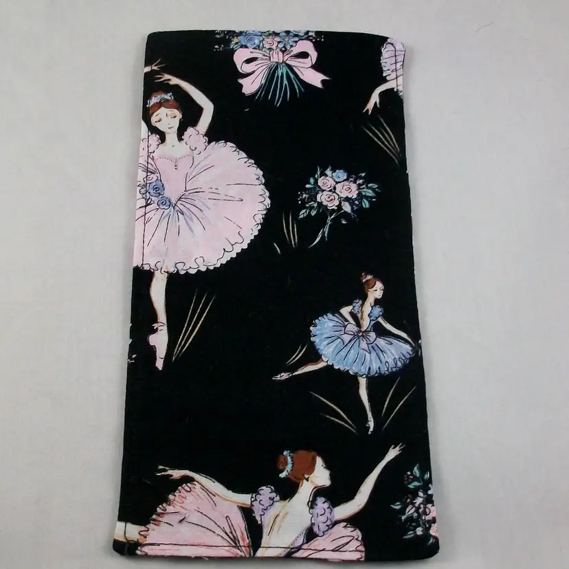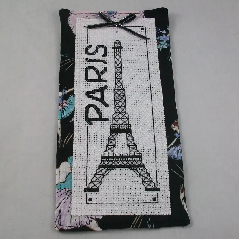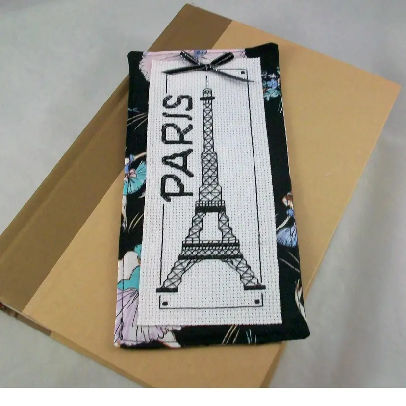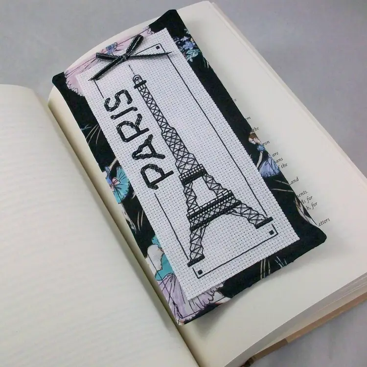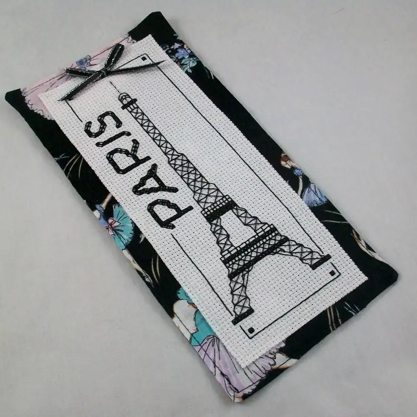 A beautiful hand stitched bookmark, from Zweigart Artiste Mini cross stitch kit. Hand stitched Eiffel Tower & Paris in black thread backed with beautiful dancing ballerinas and floral bouquets cotton material black bow accent approx 4.75" x 7.75" hand washable dry flat