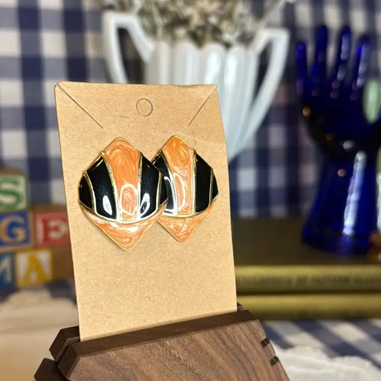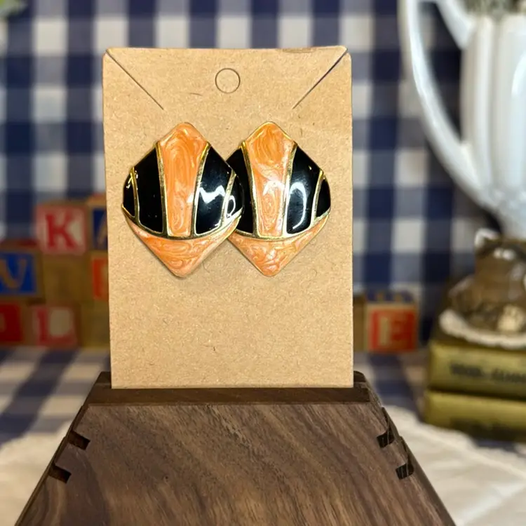 Peach & Black Enamel Gold-Tone Pierced Earrings. In excellent vintage condition.