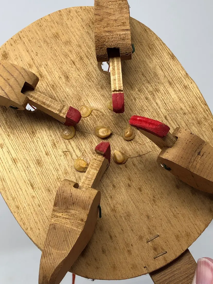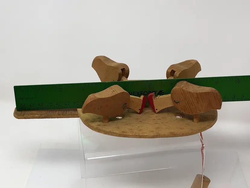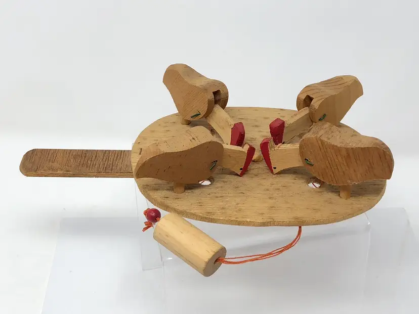 Mesmerizing! String and wood technology at its finest. 9 1/2" long and about 6" wide with 4 pecking chickens. Excellent condition.