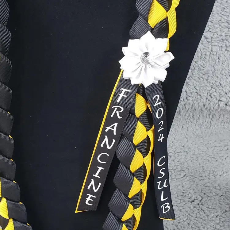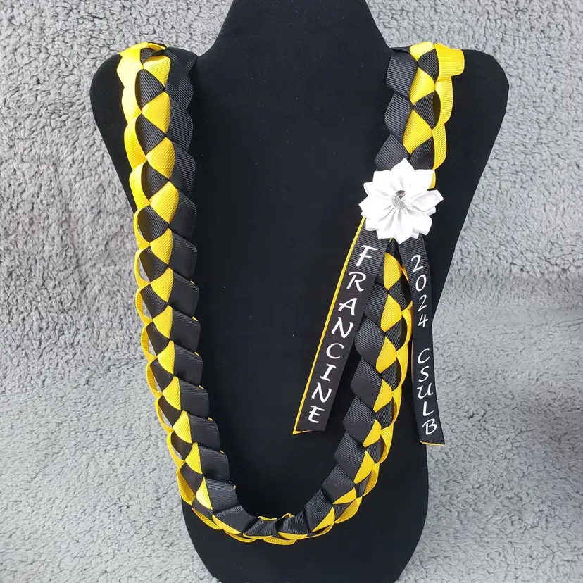 One (1) Personalize Custom Color Hawaiian Graduation 2-Ribbon Lei (Choose Colors, Name, Year, School Initials). See Photo for Color Chart. Approximately: 1 1/2 inches wide. 20-22 inches when worn. Satin Flower with Stone. Message me your customizations. If you don't see your ribbon color let me know.