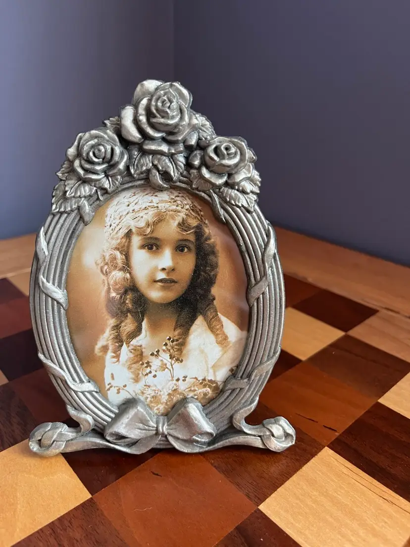 Vintage pewter frame with roses and bow 5.5 inches tall