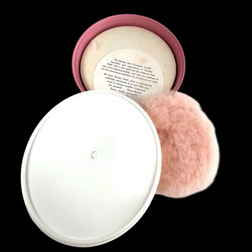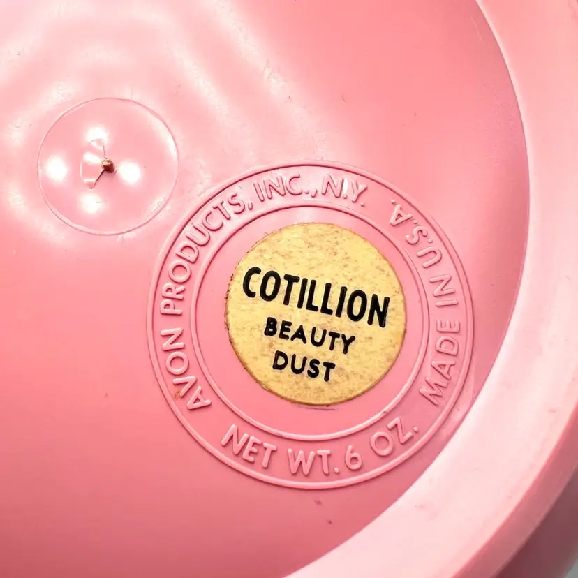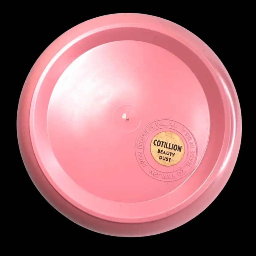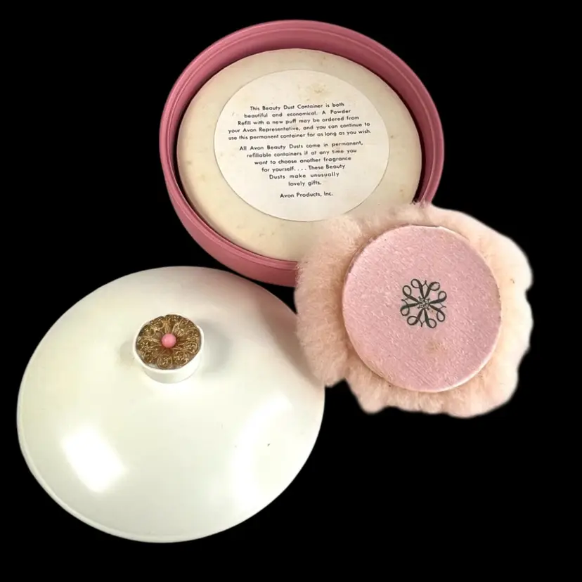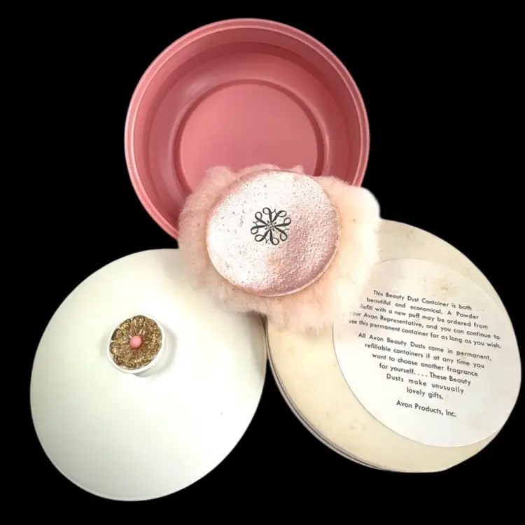 Pink Avon Plastic Powder Box White Plastic Lid with Brass Finial Pink Powder Puff Unopened Cotillion Beauty Dust Weighs 11 ounces 5-3/4” Diameter x 3-3/4” Height Condition: No cracks. Good condition with small amount of patina on metal final- see closeup photo. See last two photos with lid blemishes.