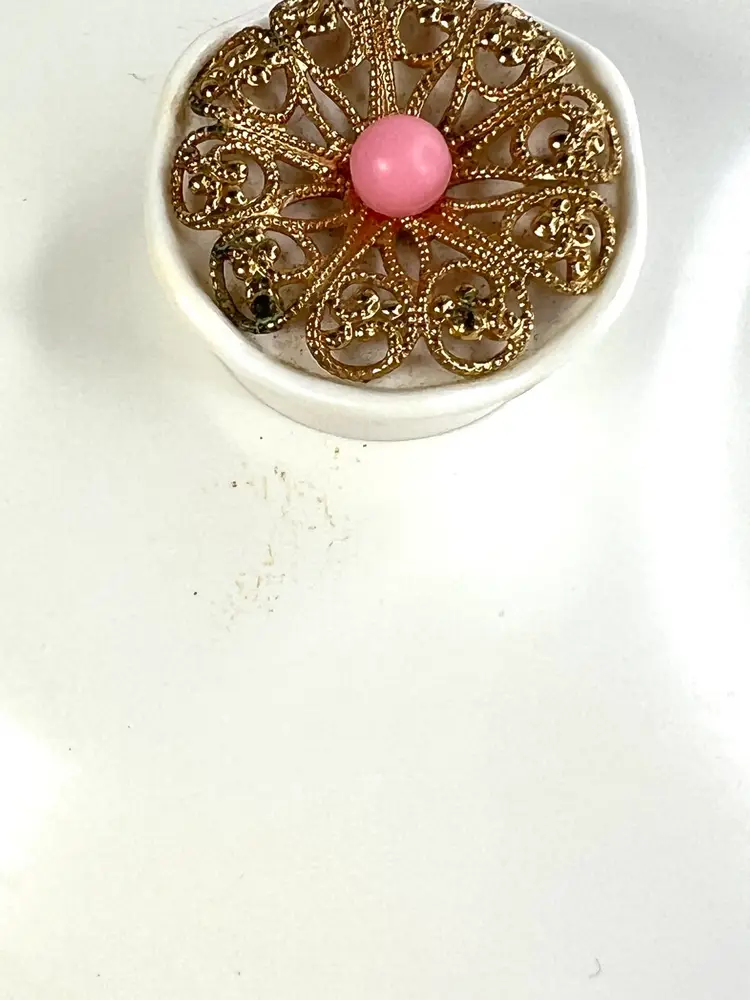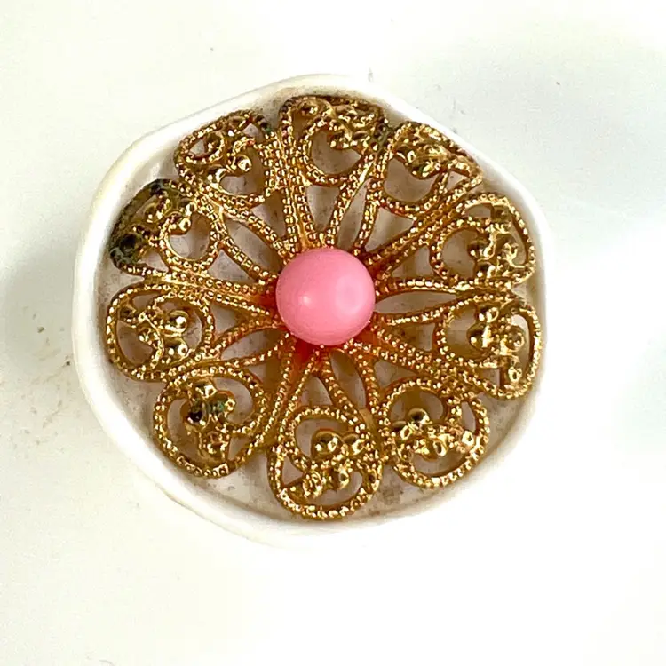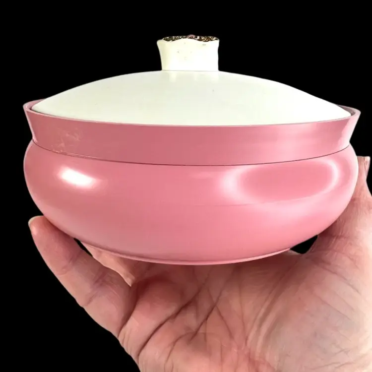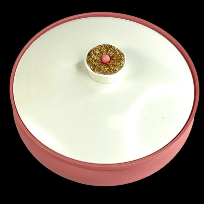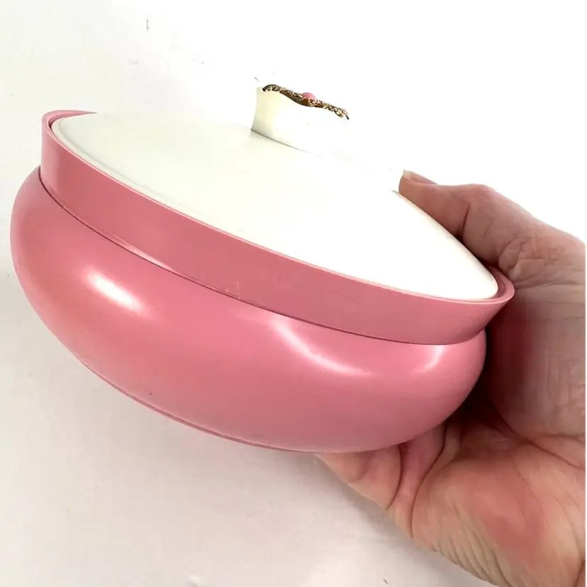 Pink Avon Plastic Powder Box White Plastic Lid with Brass Finial Pink Powder Puff Unopened Cotillion Beauty Dust Weighs 11 ounces 5-3/4” Diameter x 3-3/4” Height Condition: No cracks. Good condition with small amount of patina on metal final- see closeup photo. See last two photos with lid blemishes.