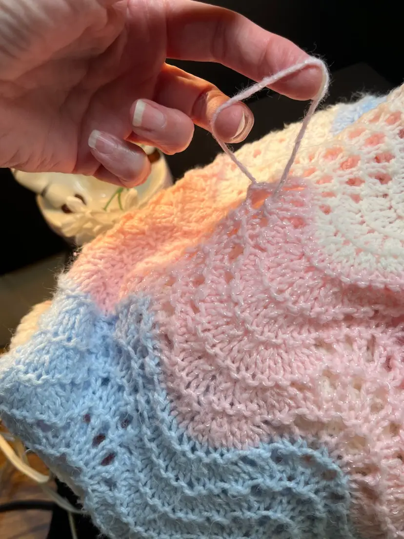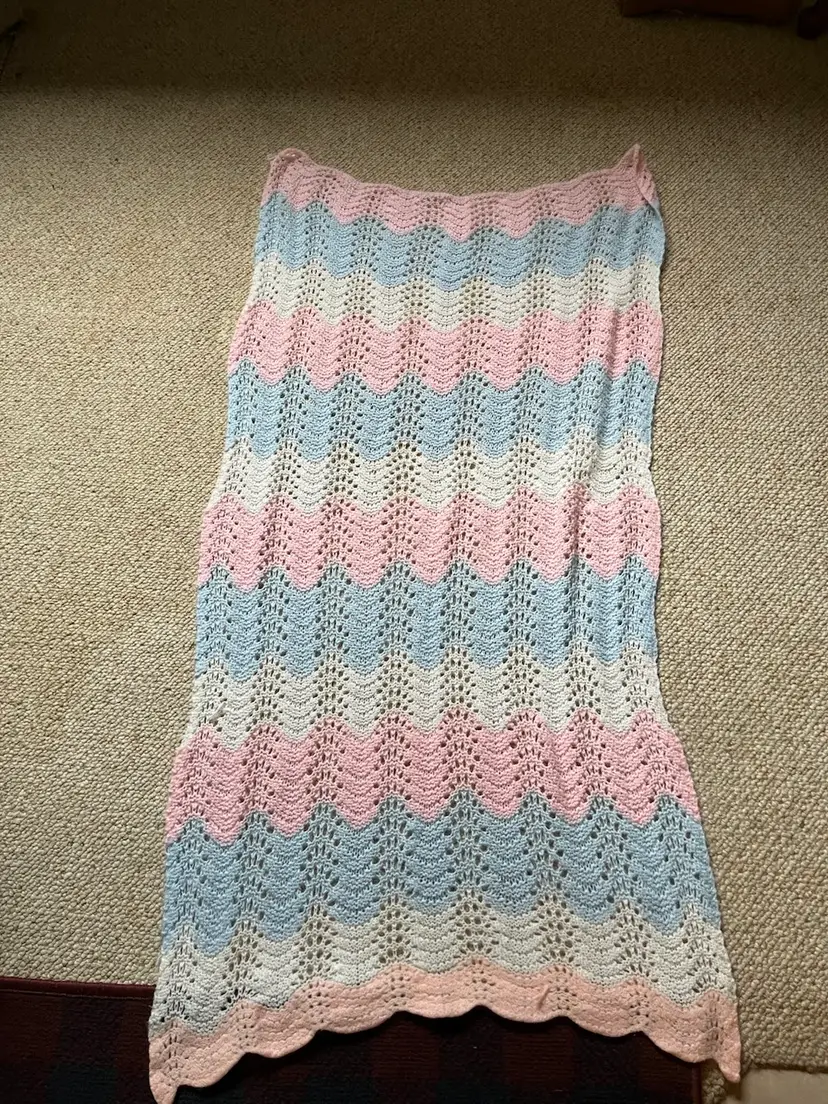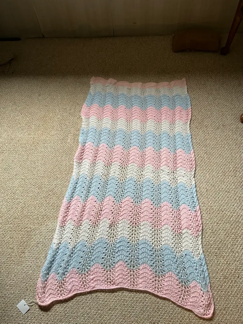 One loose thread-is not broke in two. Measures 48" x 27". No odors, stains, holes or tears. Approx 7.5 Oz-B.A.B.Y blocks will come with it.