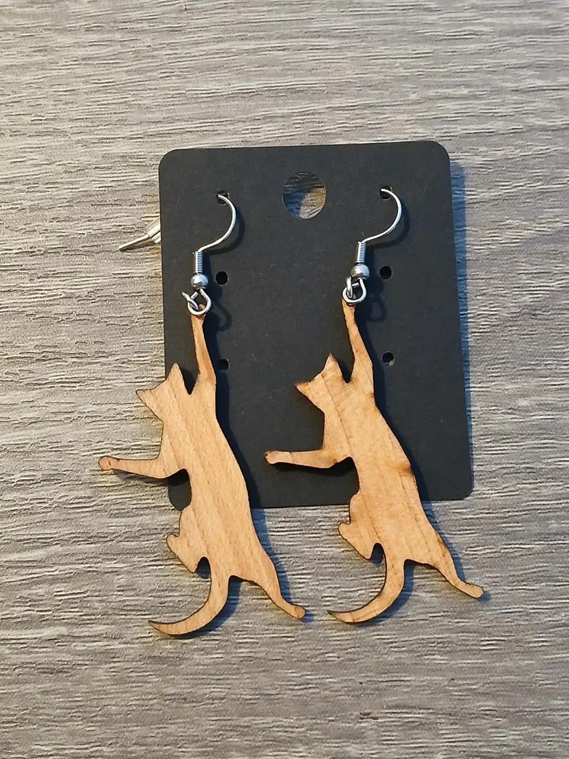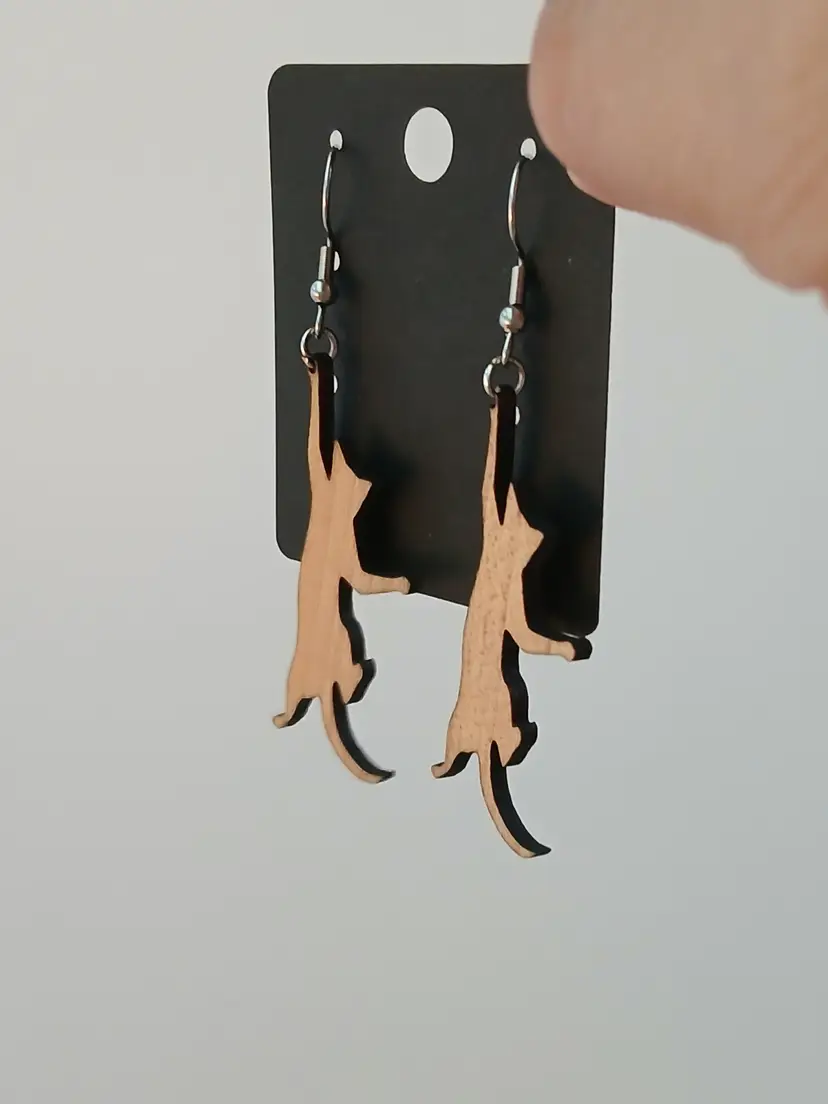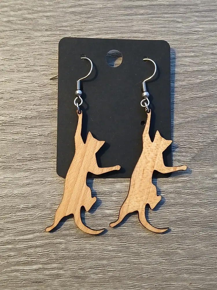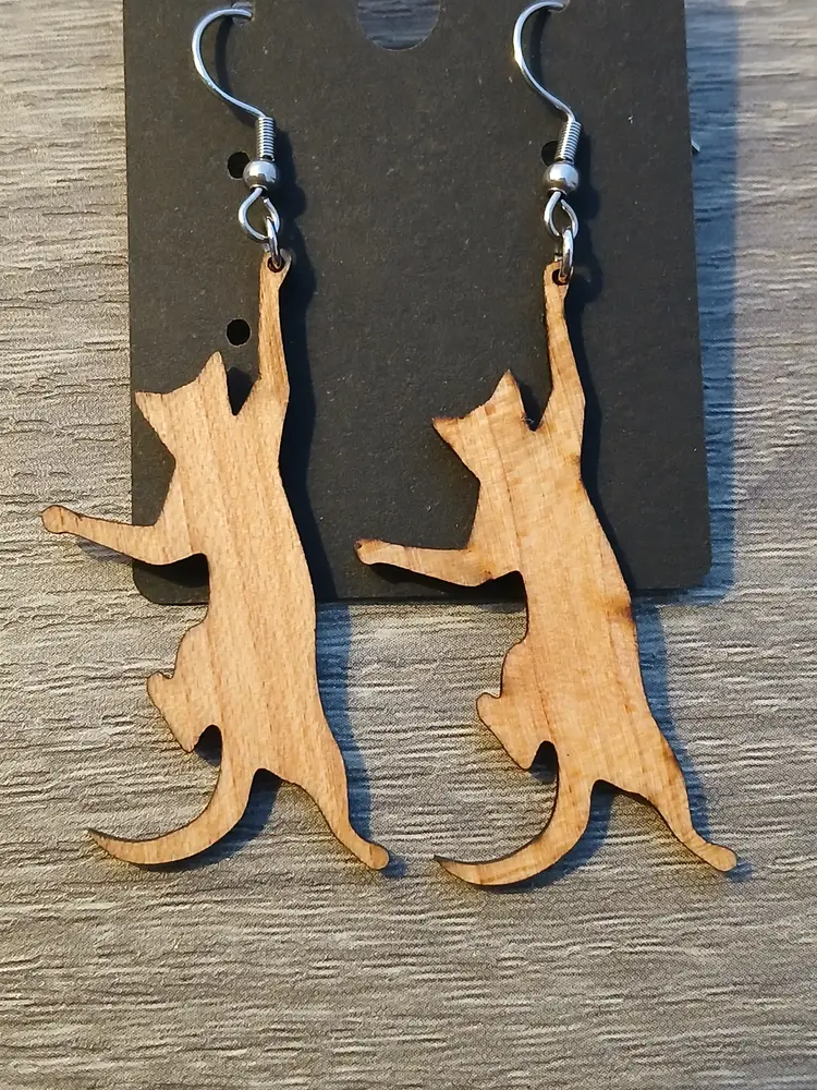 Handcrafted wooden hanging playful cat dangle earrings. Measures 2.5" long. New in box ready to gift to your favorite cat lover, or treat yourself.