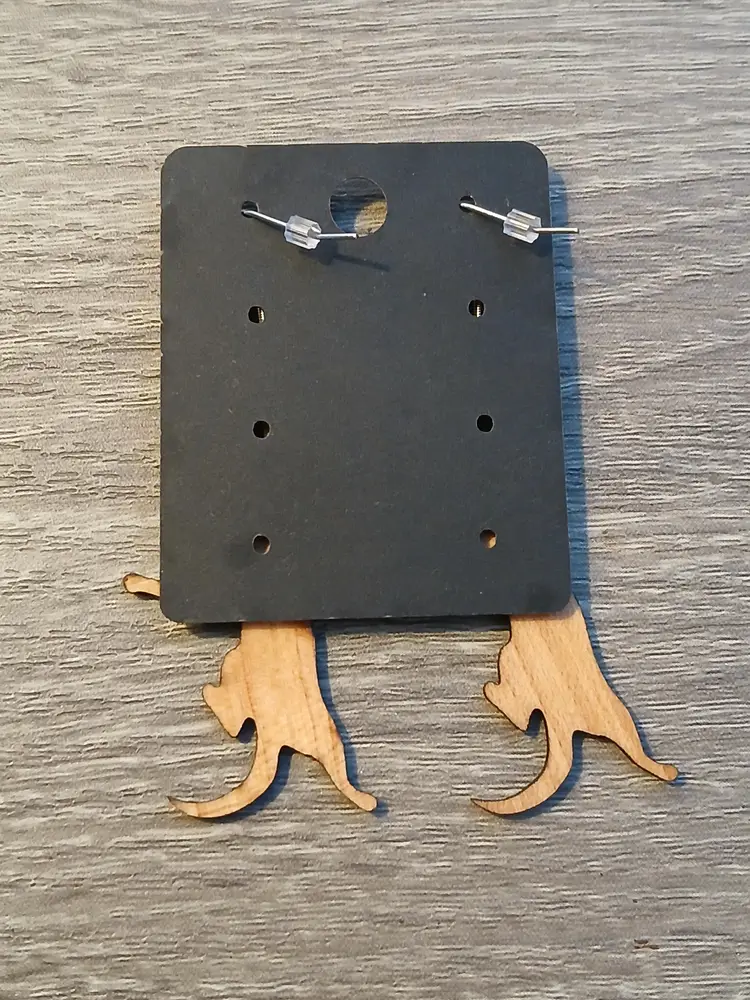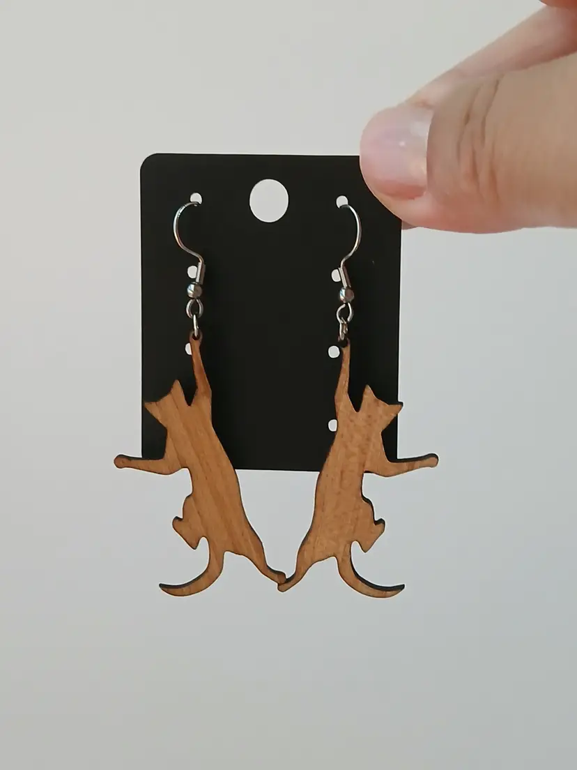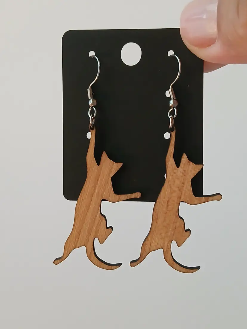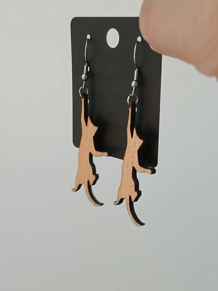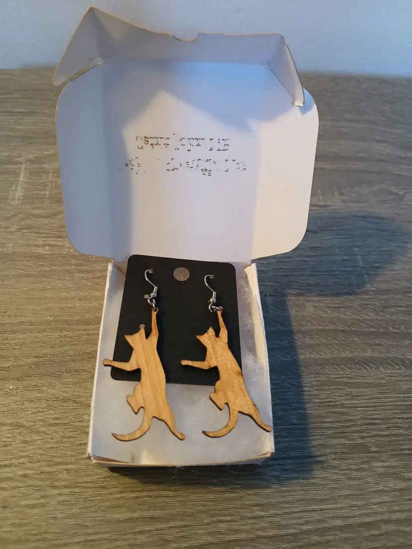 Handcrafted wooden hanging playful cat dangle earrings. Measures 2.5" long. New in box ready to gift to your favorite cat lover, or treat yourself.