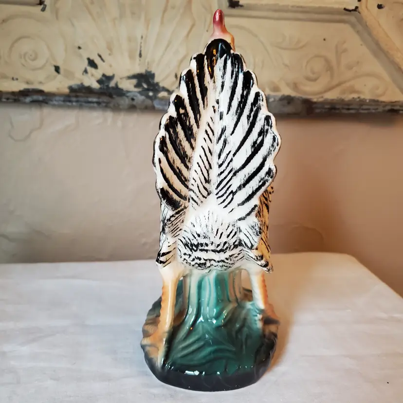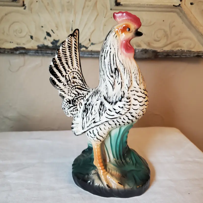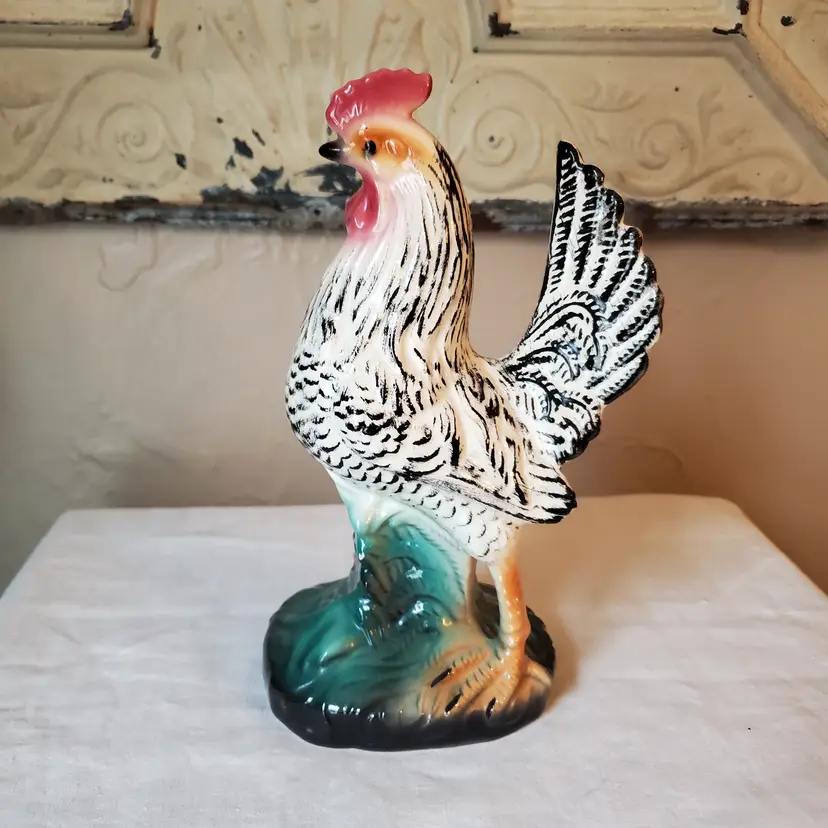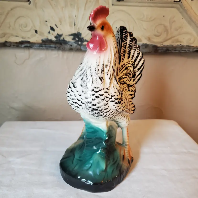 Beautiful porcelain rooster. Stunning colors. A couple tiny surface chips as shown. 8" t. 5" l. 3.5" w.