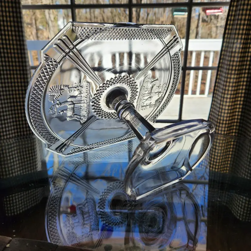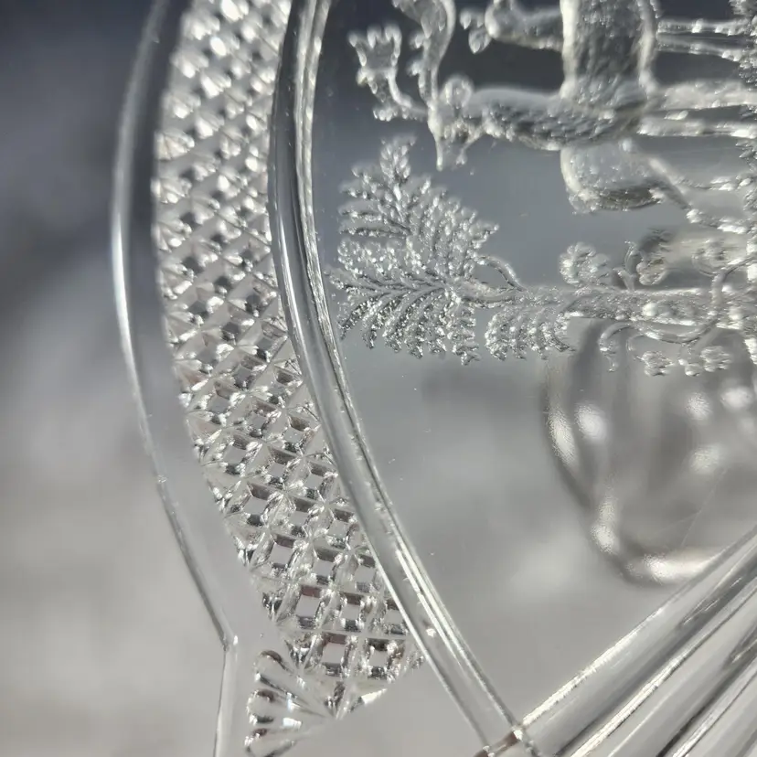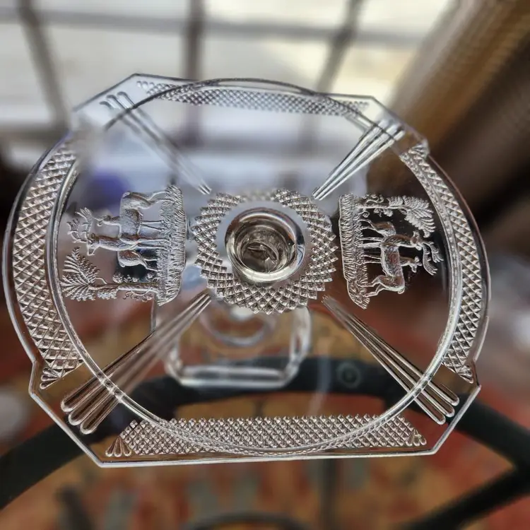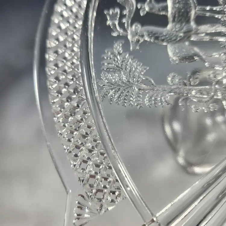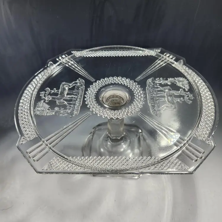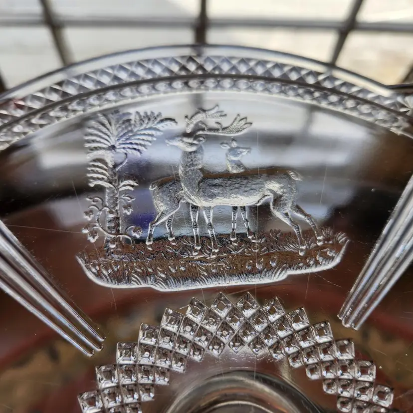 Absolutely gorgeous EAPG (Early American Pressed Glass) cake stand by McKee Glass. This goes by many names but its official name is Band Diamond - no doubt because of the diamond shaped band around the rim of the stand. I like that you can see both Art Deco and Art Nouveau influences in its design. I am not usually excited by EAPG but I love the design of this one. Features a pair of deer on either end in relief.