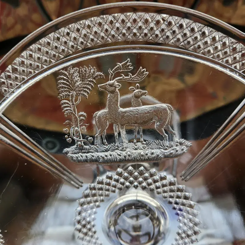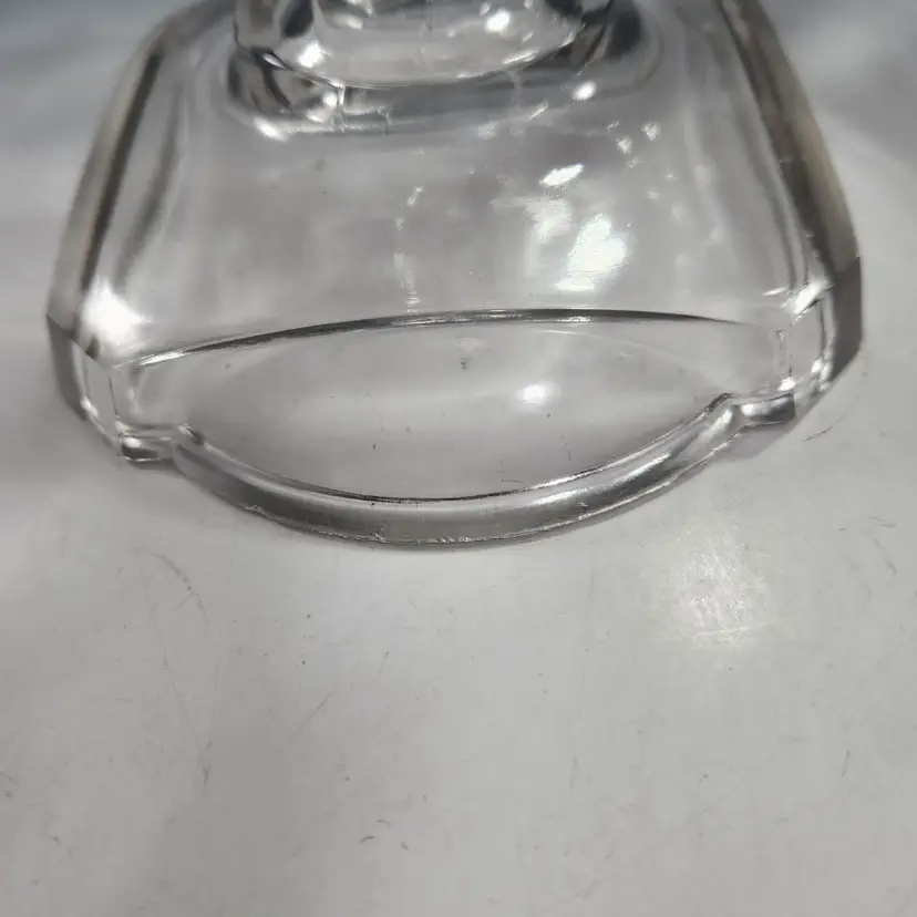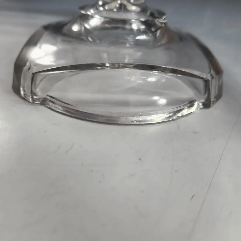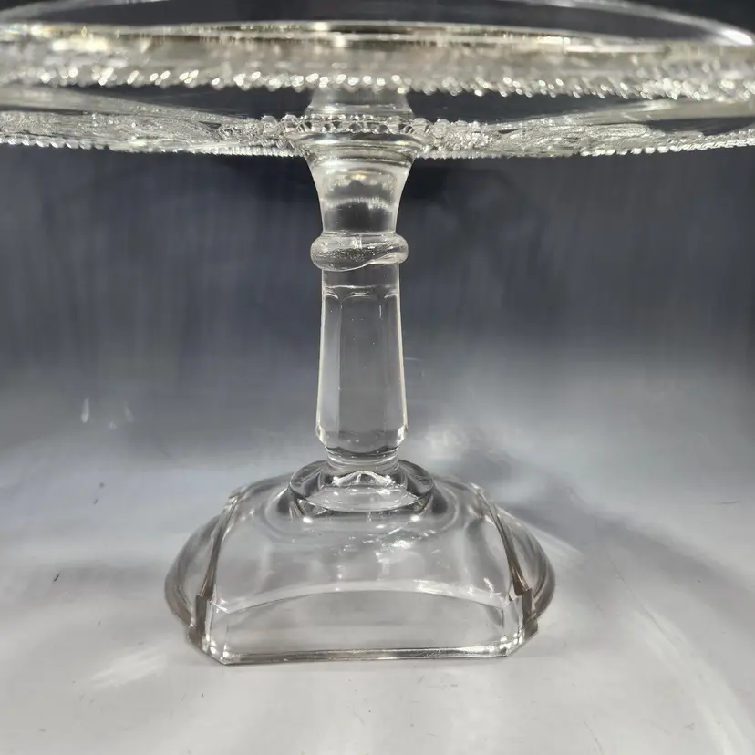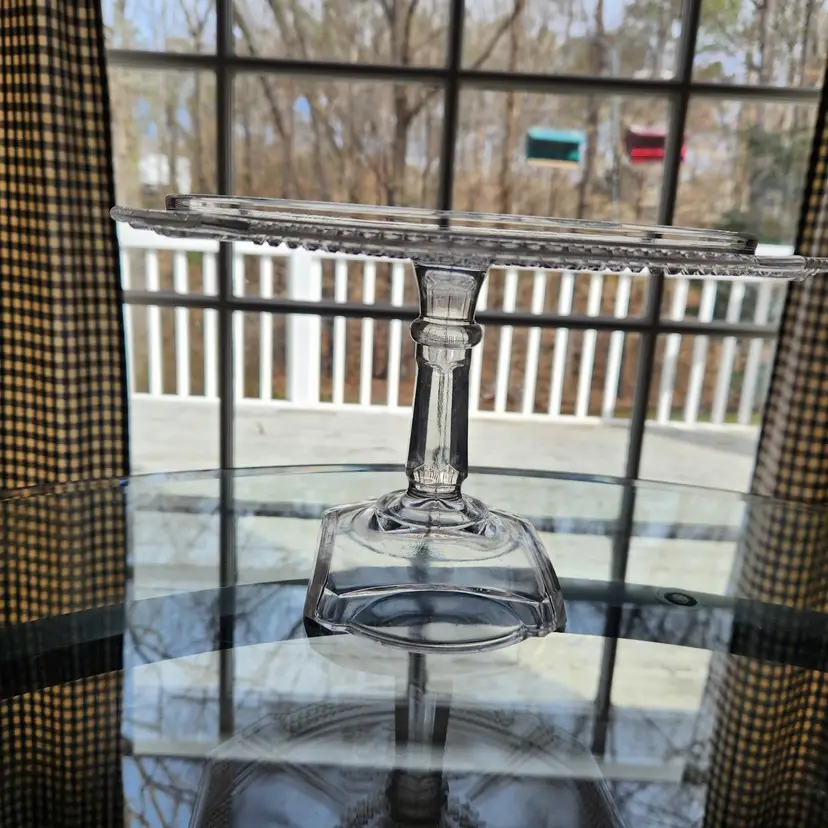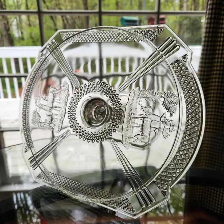Absolutely gorgeous EAPG (Early American Pressed Glass) cake stand by McKee Glass. This goes by many names but its official name is Band Diamond - no doubt because of the diamond shaped band around the rim of the stand. I like that you can see both Art Deco and Art Nouveau influences in its design. I am not usually excited by EAPG but I love the design of this one. Features a pair of deer on either end in relief.