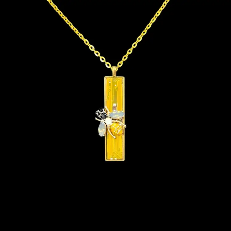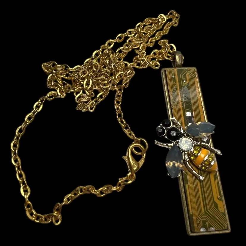Reinvented Bee Charm on Golden-Green Circuitboard Necklace Recycled from computer parts Handmade By Me 🫶 24” chain gold-tone 2-1/4” pendant 14” total drop length