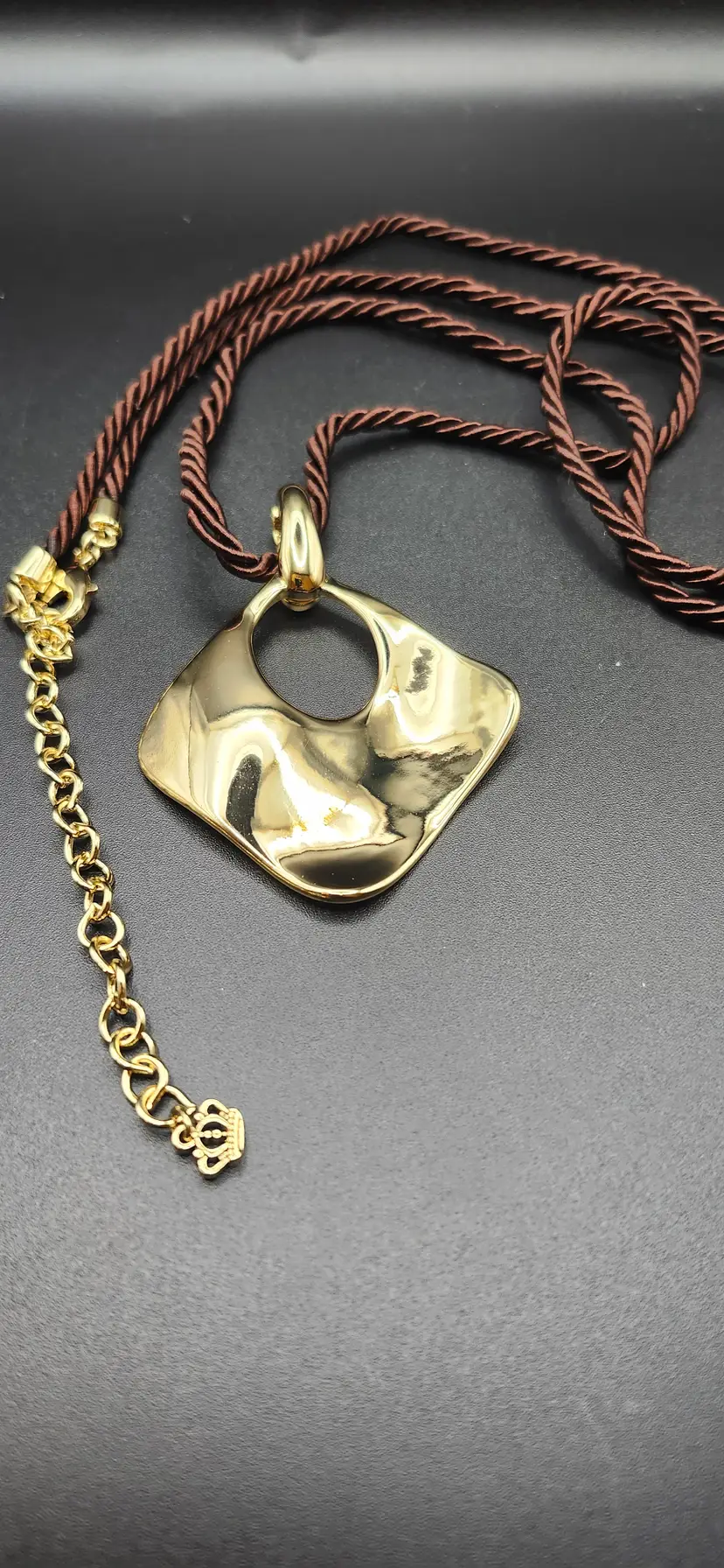 Add a touch of retro flair to your outfit with this stunning gold-tone geometric pendant necklace. The bold, square-shaped pendant with a circular cutout hangs elegantly from a twisted cord, making it a unique statement piece. Perfect for both casual and dressy occasions, this necklace is sure to turn heads.