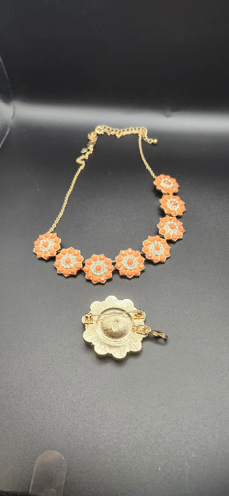 Brighten up your look with this retro-inspired orange floral statement necklace. Featuring vibrant orange enamel flowers with sparkling rhinestone centers, this piece is perfect for adding a pop of color to any outfit. The gold-tone chain and bold pendant make it a standout accessory for any occasion.